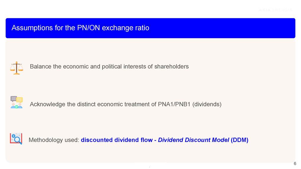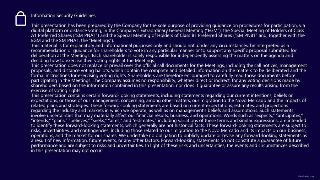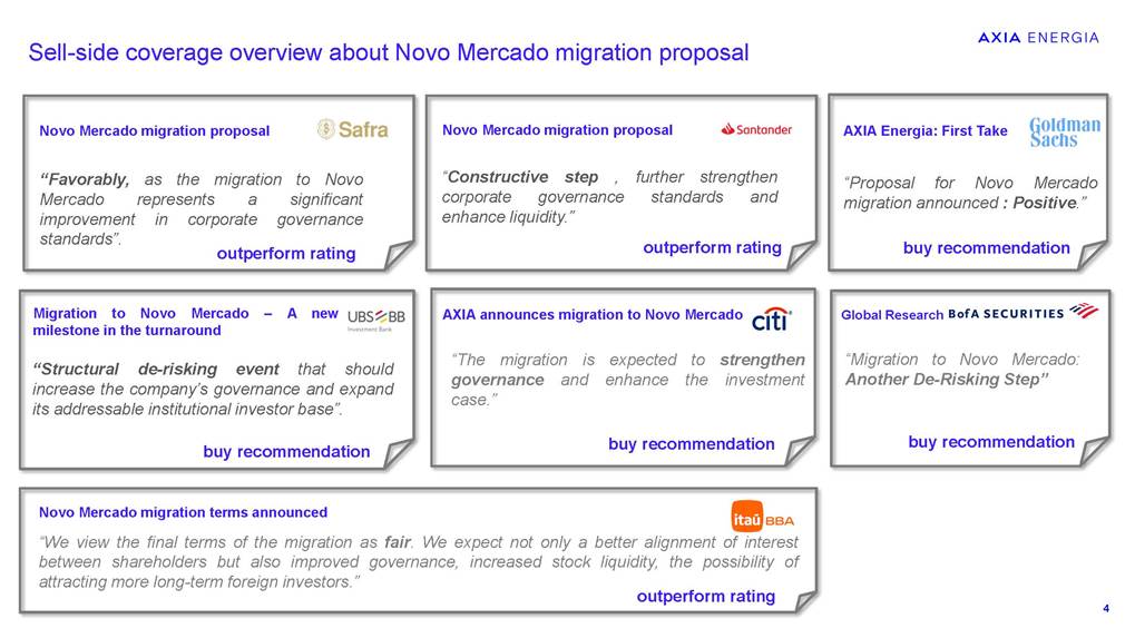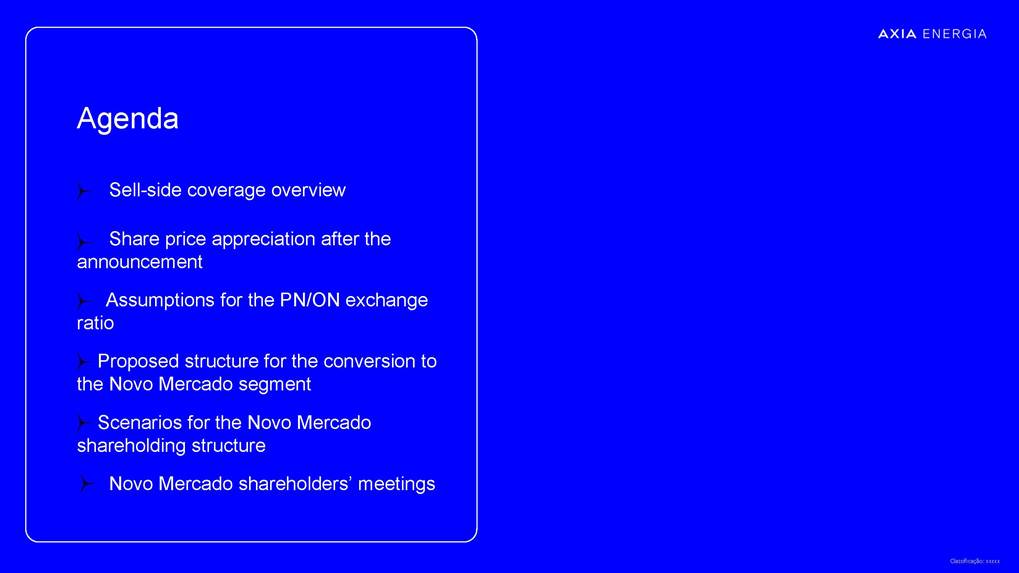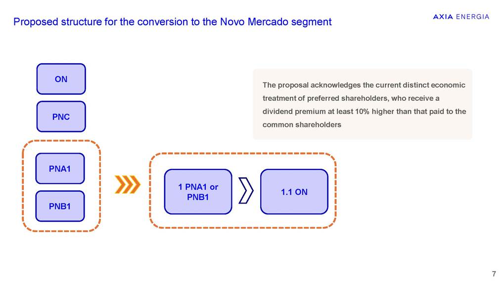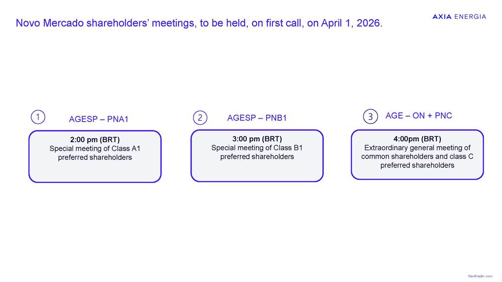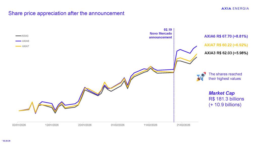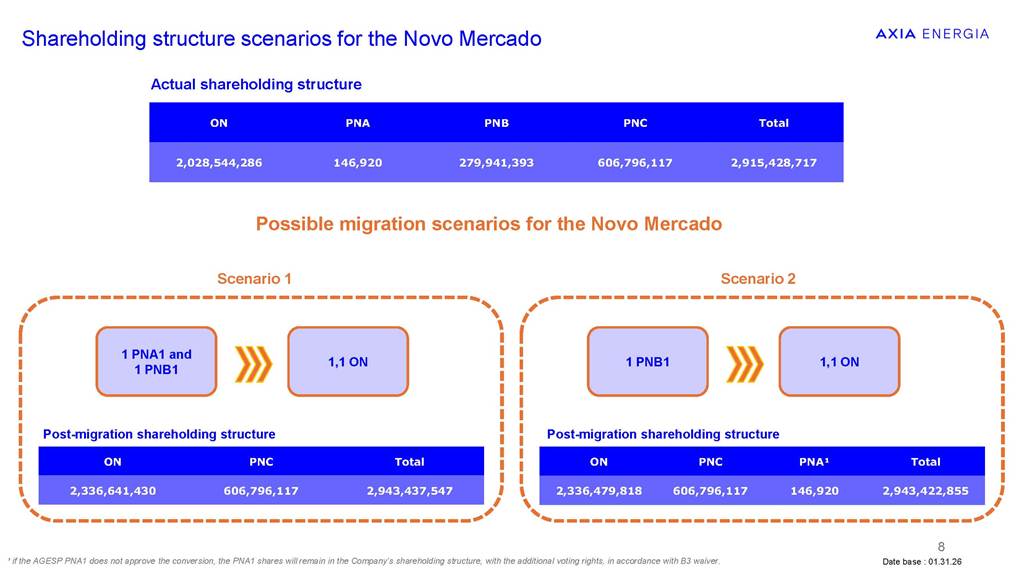 Proposal for Migration to the Novo Mercado February 2026 Classificação: xxxxx Information Security Guidelines This presentation has been prepared by the Company for the sole purpose of providing guidance on procedures for participation, via digital platform or distance voting, in the Company’s Extraordinary General Meeting (“EGM”), the Special Meeting of Holders of Class A1 Preferred Shares (“SM PNA1”) and the Special Meeting of Holders of Class B1 Preferred Shares (“SM PNB1” and, together with the EGM and the SM PNA1, the “Meetings”). This material is for explanatory and informational purposes only and should not, under any circumstances, be interpreted as a recommendation or guidance for shareholders to vote in any particular manner or to support any specific proposal submitted for deliberation at the Meetings. Each shareholder is solely responsible for independently assessing the matters on the agenda and deciding how to exercise their voting rights at the Meetings. This presentation does not replace or prevail over the official call documents for the Meetings, including the call notices, management proposals, and distance voting ballots, which contain the complete and detailed information on the matters to be deliberated and the formal instructions for exercising voting rights. Shareholders are therefore encouraged to carefully read those documents before participating in the Meetings. The Company assumes no responsibility, whether direct or indirect, for any voting decisions made by shareholders based on the information contained in this presentation, nor does it guarantee or assure any results arising from the exercise of voting rights. This presentation contains certain forward-looking statements, including statements regarding our current intentions, beliefs or expectations, or those of our management, concerning, among other matters, our migration to the Novo Mercado and the impacts of related plans and strategies. These forward-looking statements are based on current expectations, estimates, and projections regarding the industry and markets in which we operate, as well as on management’s beliefs and assumptions. Such statements involve uncertainties that may materially affect our financial results, business, and operations. Words such as “expects,” “anticipates,” “intends,” “plans,” “believes,” “seeks,” “aims,” and “estimates,” including variations of these terms and similar expressions, are intended to identify these forward-looking statements, which generally are not historical facts. These forward-looking statements are subject to risks, uncertainties, and contingencies, including those related to our migration to the Novo Mercado and its impacts on our business, operations, and the market for our shares. We undertake no obligation to publicly update or revise any forward-looking statements as a result of new information, future events, or any other factors. Forward-looking statements do not constitute a guarantee of future performance and are subject to risks and uncertainties. In light of these risks and uncertainties, the events and circumstances described in this presentation may not occur. Classificação: xxxxx Sell-side coverage overview Share price appreciation after the announcement Assumptions for the PN/ON exchange ratio Proposed structure for the conversion to the Novo Mercado segment Scenarios for the Novo Mercado shareholding structure Novo Mercado shareholders’ meetings Agenda Sell-side coverage overview about Novo Mercado migration proposal “Favorably,asthemigrationtoNovoMercadorepresentsasignificantimprovementincorporategovernancestandards”. “Constructivestep,furtherstrengthencorporategovernancestandardsandenhanceliquidity.” “ProposalforNovoMercadomigrationannounced:Positive.” “Structuralde-riskingeventthatshouldincreasethecompany’sgovernanceandexpanditsaddressableinstitutionalinvestorbase”. MigrationtoNovoMercado–Anewmilestoneintheturnaround “MigrationtoNovoMercado:AnotherDe-RiskingStep” “Themigrationisexpectedtostrengthengovernanceandenhancetheinvestmentcase.” “Weviewthefinaltermsofthemigrationasfair.Weexpectnotonlyabetteralignmentofinterestbetweenshareholdersbutalsoimprovedgovernance,increasedstockliquidity,thepossibilityofattractingmorelong-termforeigninvestors.” 4 buy recommendation NovoMercadomigrationproposal outperform rating outperform rating NovoMercadomigrationproposal buy recommendation AXIAEnergia:FirstTake buy recommendation AXIAannouncesmigrationtoNovoMercado buy recommendation GlobalResearch outperform rating NovoMercadomigrationtermsannounced Share price appreciation after the announcement ¹02.24.26 02/01/2026 12/01/2026 22/01/2026 01/02/2026 11/02/2026 21/02/2026 AXIA3 AXIA6 AXIA7 02.19 Novo Mercado announcement Market Cap R$ 181.3 billions (+ 10.9 billions) The shares reached their highest values AXIA6R$67.70(+8.81%) AXIA3R$62.03(+5.98%) AXIA7R$60.22(+6.92%) Methodology used: discounted dividend flow -Dividend Discount Model (DDM) Assumptions for the PN/ON exchange ratio 6 Balance the economic and political interests of shareholders Acknowledge the distinct economic treatment of PNA1/PNB1 (dividends) Proposed structure for the conversion to the Novo Mercado segment 7 PNA1 PNB1 ON PNC 1 PNA1 or PNB1 1.1 ON The proposal acknowledges the current distinct economic treatment of preferred shareholders, who receive a dividend premium at least 10% higher than that paid to the common shareholders Date base : 01.31.26 8 ON PNC Total 2,336,641,430 606,796,117 2,943,437,547 ON PNC PNA¹ Total 2,336,479,818 606,796,117 146,920 2,943,422,855 ON PNA PNB PNC Total 2,028,544,286 146,920 279,941,393 606,796,117 2,915,428,717 Scenario 1 ShareholdingstructurescenariosfortheNovoMercado Actual shareholding structure Possible migration scenarios for the Novo Mercado 1 PNA1 and 1 PNB1 1,1 ON Scenario 2 Post-migration shareholding structure Post-migration shareholding structu