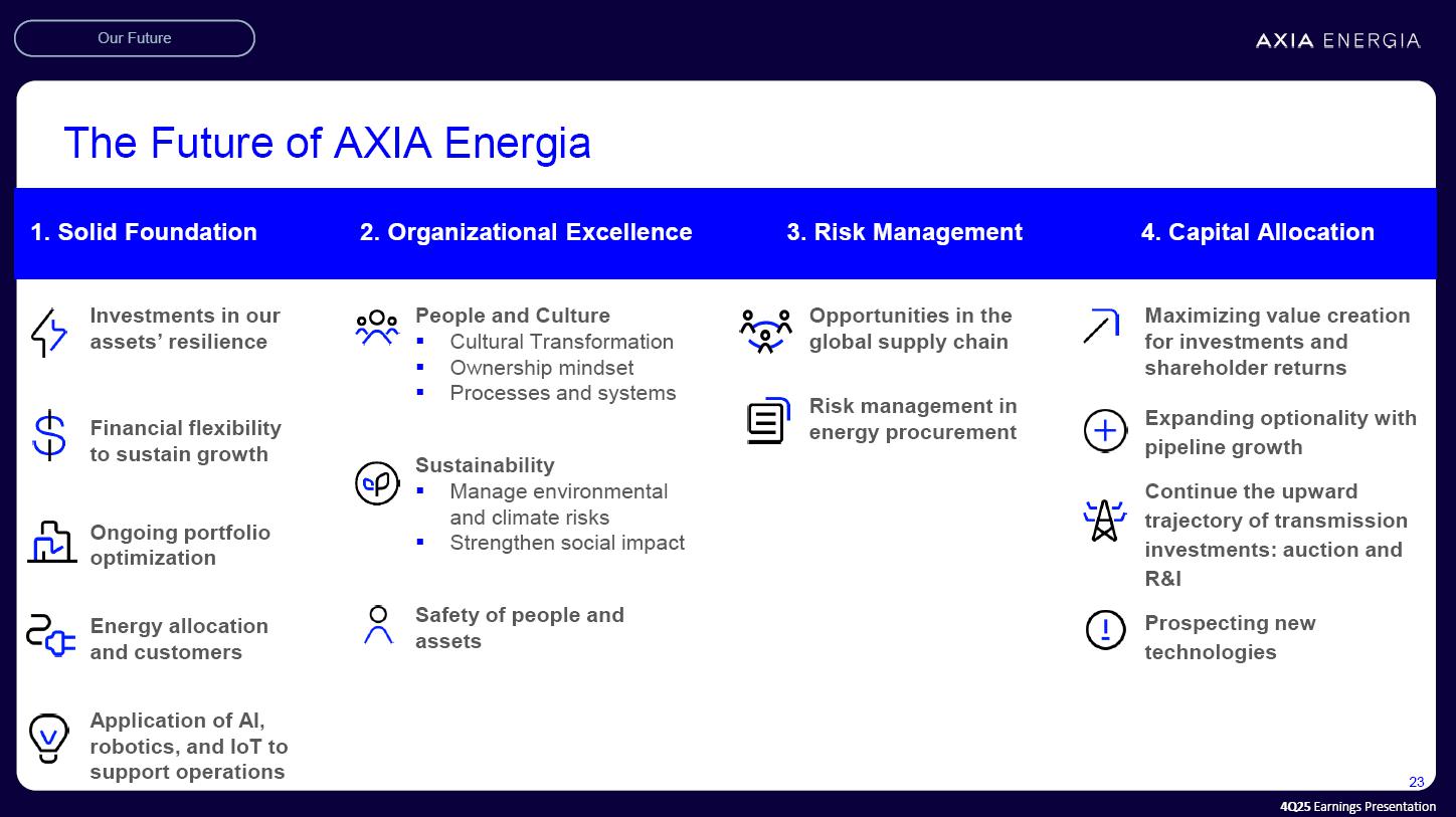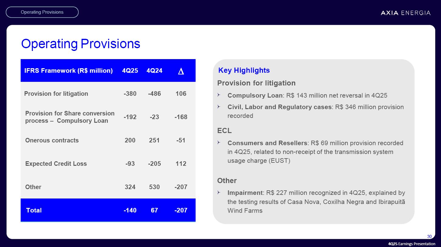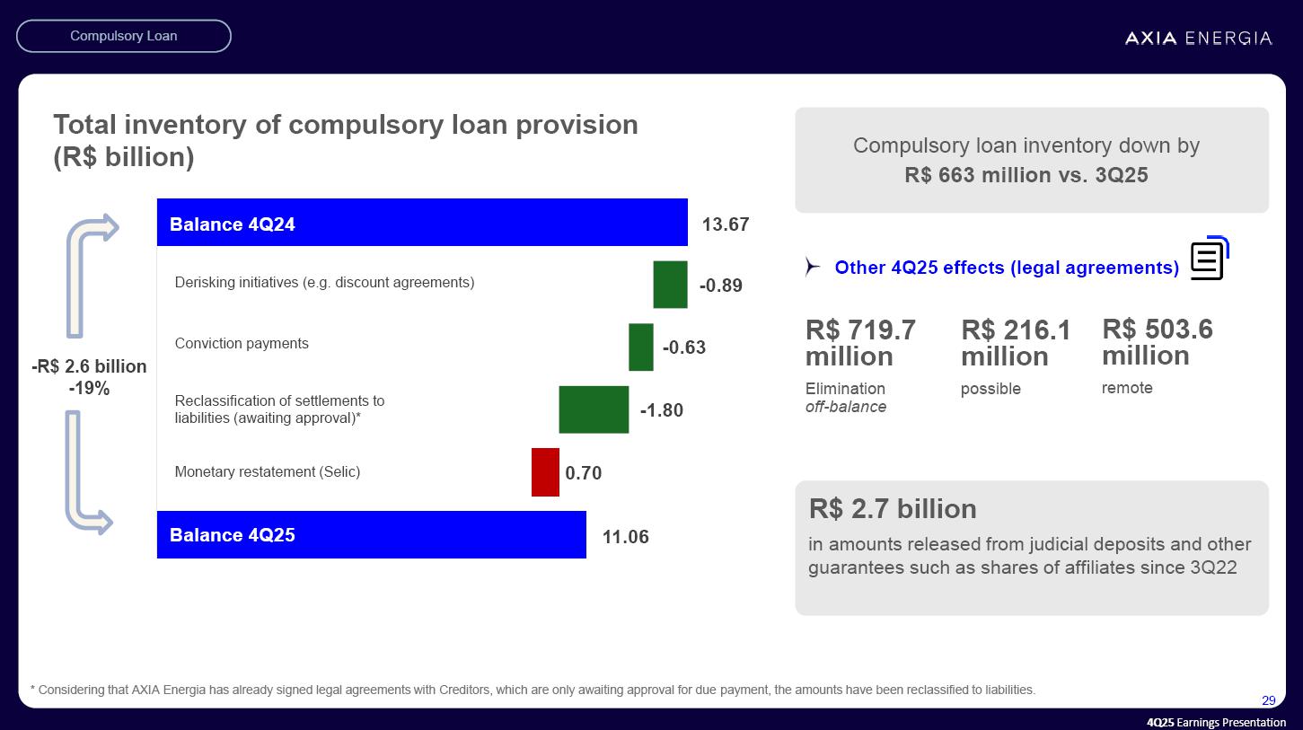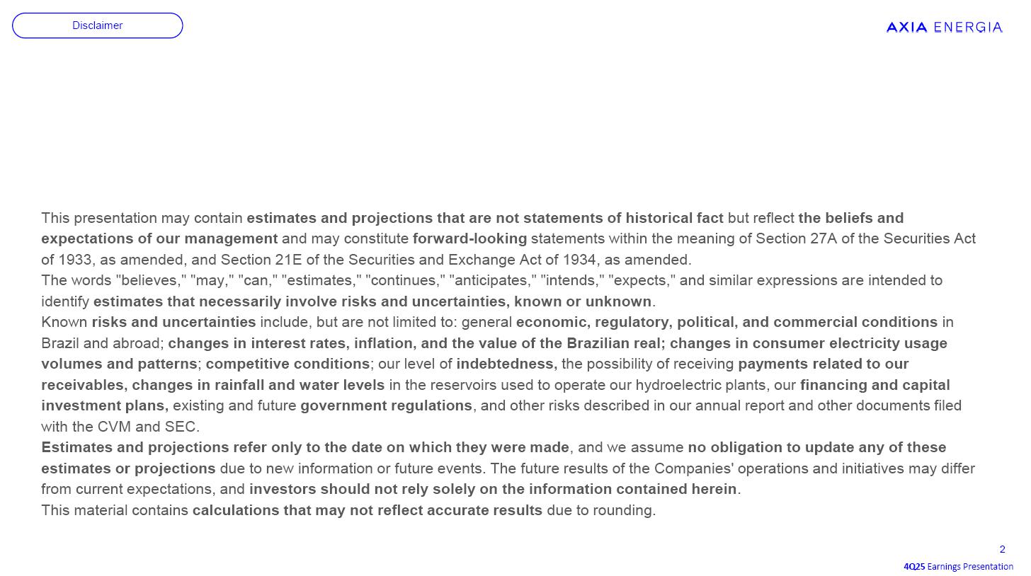 This document may contain estimates and projections that are not statements of past events but reflect our management’s beliefs and expectations and may constitute forward-looking statements under Section 27A of the Securities Act of 1933, as amended, and Section 21E of the Securities and Exchange Act of 1934, as amended. The words “believes”, “may”, “can”, “estimates”, “continues”, “anticipates”, “intends”, “expects”, and similar expressions are intended to identify estimates that necessarily involve known and unknown risks and uncertainties. Known risks and uncertainties include, but are not limited to: general economic, regulatory, political, and business conditions in Brazil and abroad; fluctuations in interest rates, inflation, and the value of the Brazilian Real; changes in consumer electricity usage patterns and volumes; competitive conditions; our level of indebtedness; the possibility of receiving payments related to our receivables; changes in rainfall and water levels in reservoirs used to operate our hydroelectric plants; our financing and capital investment plans; existing and future government regulations; and other risks described in our annual report and other documents filed with the CVM and SEC. Estimates and projections refer only to the date they were expressed, and we do not assume any obligation to update any of these estimates or projections due to new information or future events. Future results of the Company’s operations and initiatives may differ from current expectations, and investors should not rely solely on the information contained herein. This material contains calculations that may not reflect precise results due to rounding.