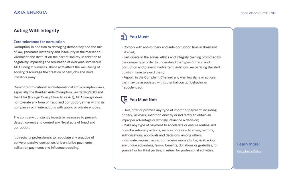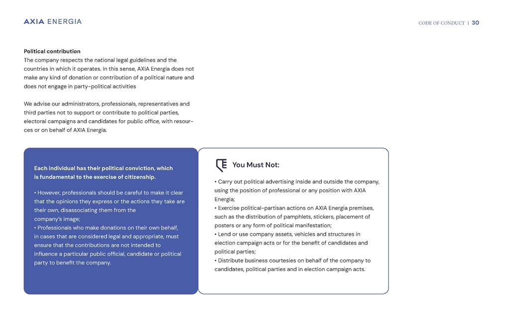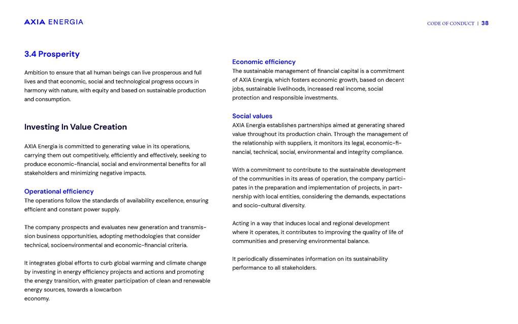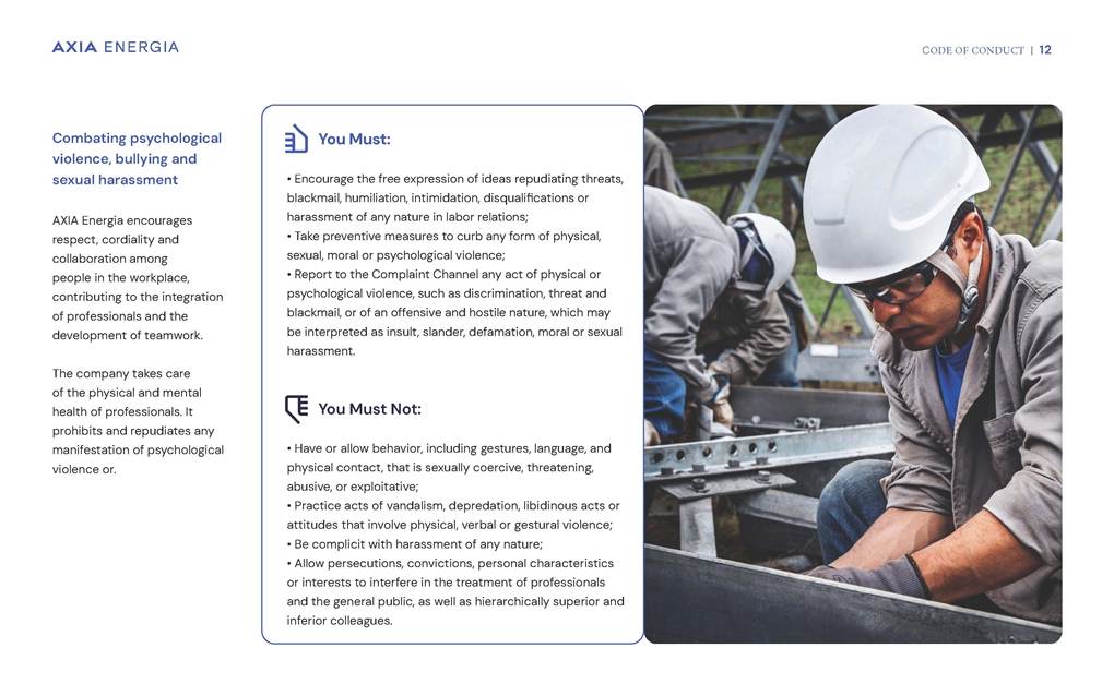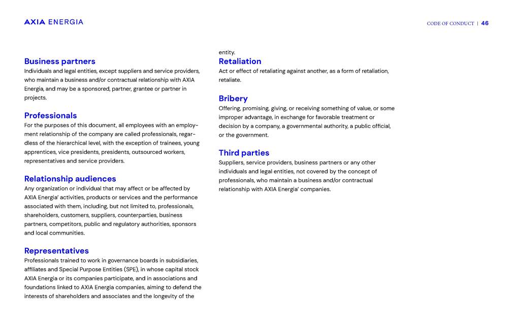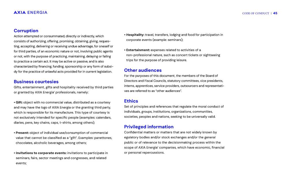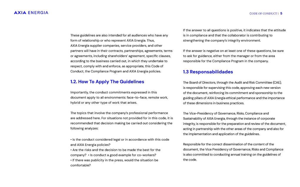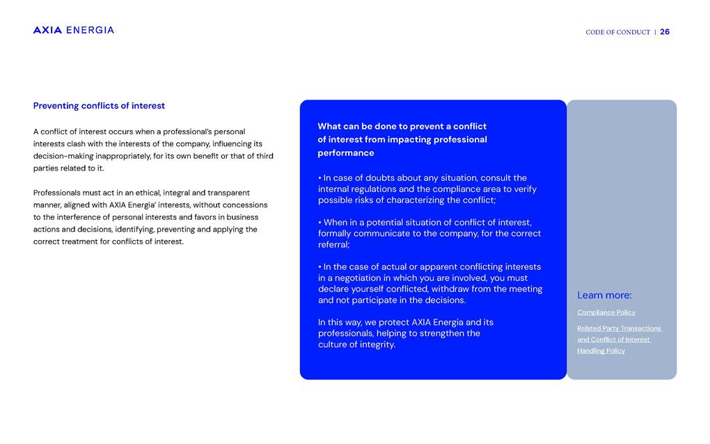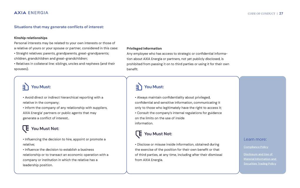CÓDIGO DE CONDUTA | 1 Code of Conduct CÓDIGO DE CONDUTA | 2 Our pursuit of ethical excellence transcends the ordinary. But it is in daily life, in the most common and common actions, that it is esta blished. We want to create, together with all our professionals and partners, a legacy of integrity that echoes in every interaction. The refore, the AXIA Energia Code of Conduct is not a static document. It is a renewed commitment; a guiding instrument for the daily lives of our managers, leaders, professionals and everyone who relates to the company; a compass to guide our steps towards a future in which ethics is not just an ideal, but the essence of who we are. We establish here the principles in which we believe and our duties to all society, organized in the themes People, Planet, Governance and Prosperity. This version was built on the solid foundation of our values – with emphasis on Life First and Integrity Always – and our purpose of caring for the planet by delivering the energy we believe in. We reinforce, with the ESG (Environmental, Social and Governance) lens, the connection between our objectives and our actions, our behaviors and our positions as a company and as people. We affirm our nonnegotiable commitment to safety and sustainable growth, hand in hand with ethical values, inseparable partners for the rele vance and continuity of any business. To be effective, it is essential that this living document reaches not only AXIA Energia professionals, but suppliers, partners, customers, communities, public authorities, the press, shareholders and socie ty in general. I invite everyone, therefore, to know this new version of our Code of Conduct and to take responsibility for ethical, inte gral and sustainable action, every day. Enjoy reading! Ivan de Souza Monteiro , presidente de AXIA Energia A WORD FROM THE PRESIDENT CÓDIGO DE CONDUTA | 3 TABLE OF CONTENTS 04.Code Effectiveness34 4.1 Commitment 34 4.2 Doubts and manifestations 34 4.3 Complaints 35 4.4 Violations and consequences 36 05.Glossary38 06.Term of Acceptance42 1.Presentation04 1.1 Target audience04 1.2 How to apply the guidelines05 1.3 Responsibilities05 1.4 Review and updates06 02.Corporate Identity07 03.Conduct Commitments09 3.1 People 10 3.2 Planet 16 3.3 Governance 17 3.4 Prosperity 32 CÓDIGO DE CONDUTA | 4 AXIA Energia is committed to the dissemination of an ethical and integral culture in the management of corporate business. The AXIA Energia Code of Conduct is the guiding document of its performance, based on ethical principles and commitments of conduct, as a compass that guides the company’s path in search of sustainable economic development and respectful relations with stakeholders. Here are the guidelines for how the company operates and how it expects its professionals and third parties to act, in order to ensure an ethical and integral attitude and relationships based on transparency and trust. 1 Presentation 1.1. Target Audience AXIA Energia, and companies in which it may have direct and indirect corporate control, must adopt the guidelines of this code. Hereinafter, the set of companies will be referred to in the document as “AXIA Energia” or “company”. The guidelines in this document are intended for all professionals: members of the Board of Directors and Fiscal Council and statutory committees, directors, employees, contractors, service providers, representatives, as well as interns and apprentices of the companies. It is an individual and collective commitment of all to comply with the code, and also to promote its compliance, in all actions of the AXIA Energia value chain and in relations with takeholders. CODE OF CONDUCT | 5 These guidelines are also intended for all audiences who have any form of relationship or who represent AXIA Energia. Thus, AXIA Energia supplier companies, service providers, and other partners will have in their contracts, partnerships, agreements, terms or agreements, including shareholders’ agreement, specific clauses, according to the business carried out, in which they undertake to respect, comply with and enforce, as appropriate, this Code of Conduct, the Compliance Program and AXIA Energia policies. 1.2. How To Apply The Guidelines Importantly, the conduct commitments expressed in this document apply to all environments: face-to-face, remote work, hybrid or any other type of work that arises. The topics that involve the company’s professional performance are addressed here. For situations not provided for in this code, it is recommended that decision making be carried out considering the following analyzes: •Is the conduct considered legal or in accordance with this code and AXIA Energia policies? •Are the risks and the decision to be made the best for the company? • Is conduct a good example for co-workers? •If there was publicity in the press, would the situation be comfortable? If the answer to all questions is positive, it indicates that the attitude is in compliance and that the collaborator is contributing to strengthening the company’s integrity environment. If the answer is negative on at least one of these questions, be sure to ask for guidance, either from the manager or from the area responsible for the Compliance Program in the company. 1.3 Responsabilidades The Board of Directors, through the Audit and Risk Committee (CAE), is responsible for supervising this code, approving each new version of the document, reinforcing its commitment and sponsorship to the guiding pillars of AXIA Energia ethical performance and the importance of these dimensions in business practices. The Vice-Presidency of Governance, Risks, Compliance and Sustainability of AXIA Energia, through the instance of corporate integrity, is responsible for the preparation and review of the document, acting in partnership with the other areas of the company and also for the implementation and application of the guidelines. Responsible for the correct disseminatio