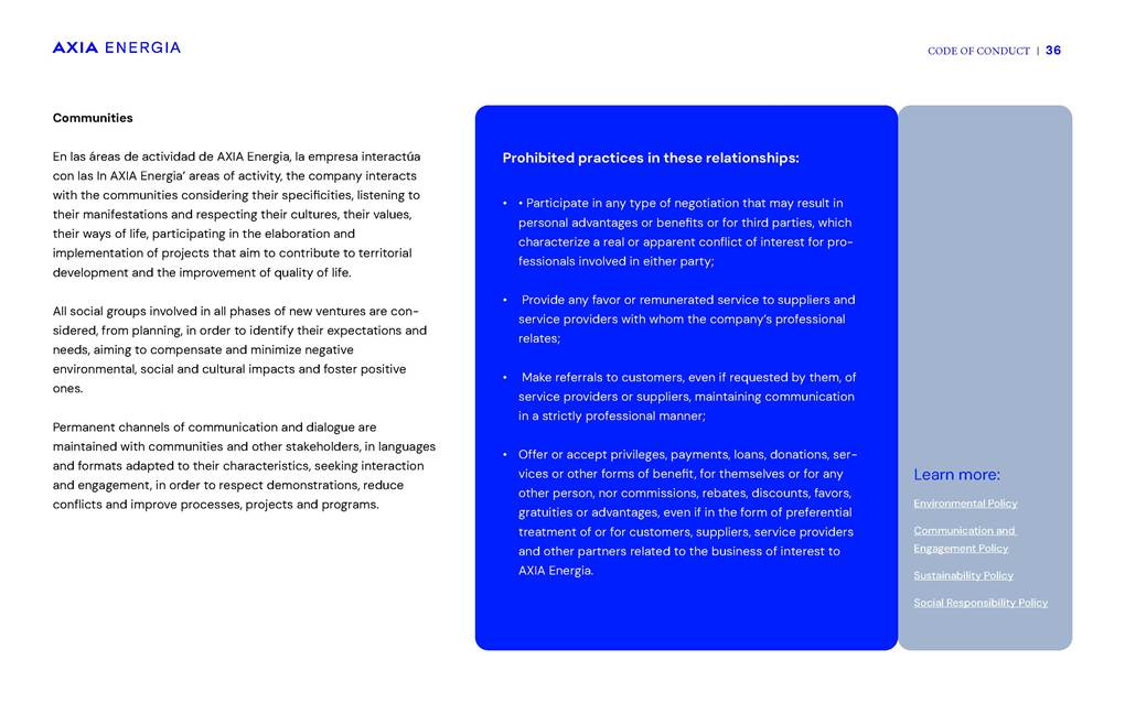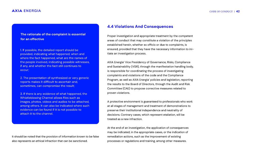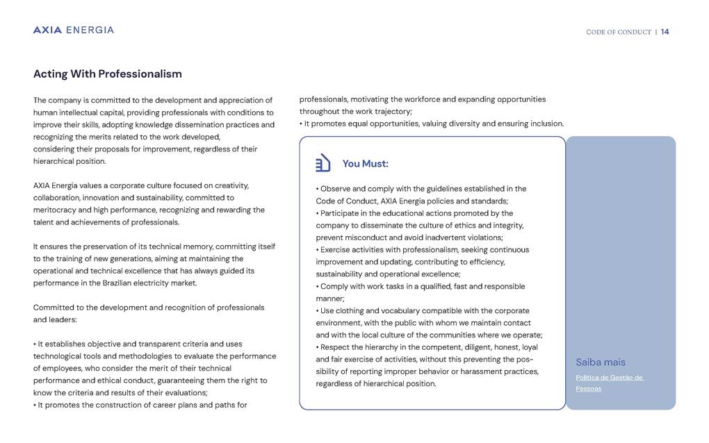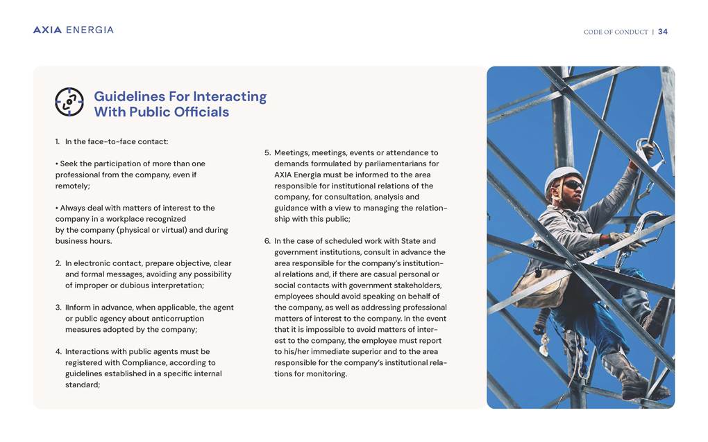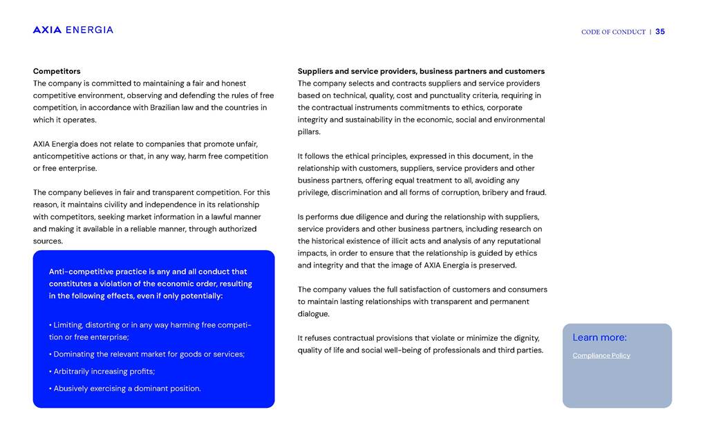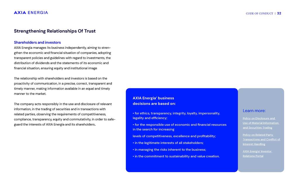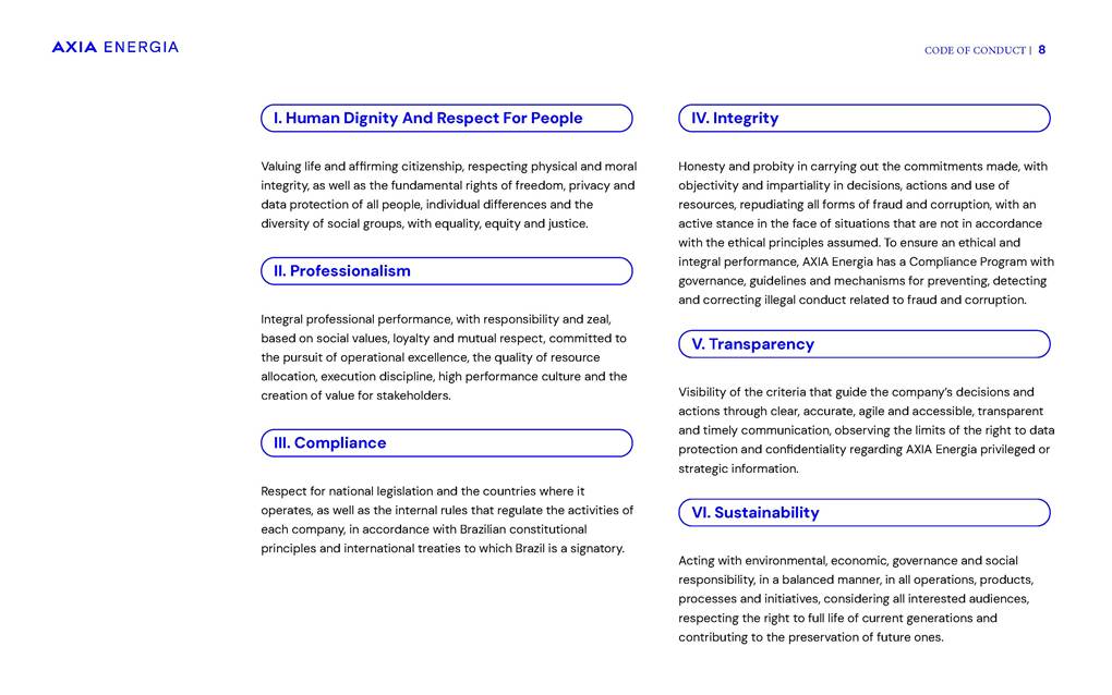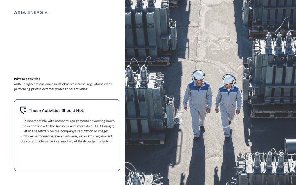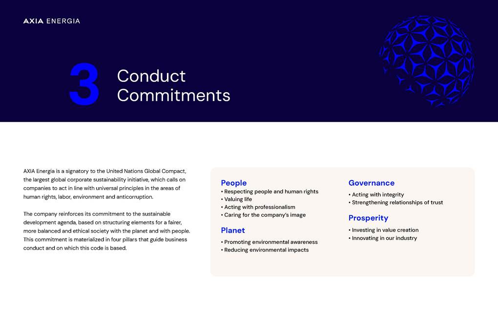 CÓDIGO DE CONDUTA | 1 Code of Conduct CÓDIGO DE CONDUTA | 2 Our pursuit of ethical excellence transcends the ordinary. But it is in daily life, in the most common and common actions, that it is esta blished. We want to create, together with all our professionals and partners, a legacy of integrity that echoes in every interaction. The refore, the AXIA Energia Code of Conduct is not a static document. It is a renewed commitment; a guiding instrument for the daily lives of our managers, leaders, professionals and everyone who relates to the company; a compass to guide our steps towards a future in which ethics is not just an ideal, but the essence of who we are. We establish here the principles in which we believe and our duties to all society, organized in the themes People, Planet, Governance and Prosperity. This version was built on the solid foundation of our values – with emphasis on Life First and Integrity Always – and our purpose of caring for the planet by delivering the energy we believe in. We reinforce, with the ESG (Environmental, Social and Governance) lens, the connection between our objectives and our actions, our behaviors and our positions as a company and as people. We affirm our nonnegotiable commitment to safety and sustainable growth, hand in hand with ethical values, inseparable partners for the rele vance and continuity of any business. To be effective, it is essential that this living document reaches not only AXIA Energia professionals, but suppliers, partners, customers, communities, public authorities, the press, shareholders and socie ty in general. I invite everyone, therefore, to know this new version of our Code of Conduct and to take responsibility for ethical, inte gral and sustainable action, every day. Enjoy reading! Ivan de Souza Monteiro , presidente de AXIA Energia A WORD FROM THE PRESIDENT CÓDIGO DE CONDUTA | 3 TABLE OF CONTENTS 04.Code Effectiveness34 4.1 Commitment 34 4.2 Doubts and manifestations 34 4.3 Complaints 35 4.4 Violations and consequences 36 05.Glossary38 06.Term of Acceptance42 1.Presentation04 1.1 Target audience04 1.2 How to apply the guidelines05 1.3 Responsibilities05 1.4 Review and updates06 02.Corporate Identity07 03.Conduct Commitments09 3.1 People 10 3.2 Planet 16 3.3 Governance 17 3.4 Prosperity 32 CÓDIGO DE CONDUTA | 4 AXIA Energia is committed to the dissemination of an ethical and integral culture in the management of corporate business. The AXIA Energia Code of Conduct is the guiding document of its performance, based on ethical principles and commitments of conduct, as a compass that guides the company’s path in search of sustainable economic development and respectful relations with stakeholders. Here are the guidelines for how the company operates and how it expects its professionals and third parties to act, in order to ensure an ethical and integral attitude and relationships based on transparency and trust. 1 Presentation 1.1. Target Audience AXIA Energia, and companies in which it may have direct and indirect corporate control, must adopt the guidelines of this code. Hereinafter, the set of companies will be referred to in the document as “AXIA Energia” or “company”. The guidelines in this document are intended for all professionals: members of the Board of Directors and Fiscal Council and statutory committees, directors, employees, contractors, service providers, representatives, as well as interns and apprentices of the companies. It is an individual and collective commitment of all to comply with the code, and also to promote its compliance, in all actions of the AXIA Energia value chain and in relations with takeholders. CODE OF CONDUCT | 5 These guidelines are also intended for all audiences who have any form of relationship or who represent AXIA Energia. Thus, AXIA Energia supplier companies, service providers, and other partners will have in their contracts, partnerships, agreements, terms or agreements, including shareholders’ agreement, specific clauses, according to the business carried out, in which they undertake to respect, comply with and enforce, as appropriate, this Code of Conduct, the Compliance Program and AXIA Energia policies. 1.2. How To Apply The Guidelines Importantly, the conduct commitments expressed in this document apply to all environments: face-to-face, remote work, hybrid or any other type of work that arises. The topics that involve the company’s professional performance are addressed here. For situations not provided for in this code, it is recommended that decision making be carried out considering the following analyzes: •Is the conduct considered legal or in accordance with this code and AXIA Energia policies? •Are the risks and the decision to be made the best for the company? • Is conduct a good example for co-workers? •If there was publicity in the press, would the situation be comfortable? If the answer to all questions is positive, it indicates that the attitude is in compliance and that the collaborator is contributing to strengthening the company’s integrity environment. If the answer is negative on at least one of these questions, be sure to ask for guidance, either from the manager or from the area responsible for the Compliance Program in the company. 1.3 Responsabilidades The Board of Directors, through the Audit and Risk Committee (CAE), is responsible for supervising this code, approving each new version of the document, reinforcing its commitment and sponsorship to the guiding pillars of AXIA Energia ethical performance and the importance of these dimensions in business practices. The Vice-Presidency of Governance, Risks, Compliance and Sustainability of AXIA Energia, through the instance of corporate integrity, is responsible for the preparation and review of the document, acting in partnership with the other areas of the company and also for the implementation and application of the guidelines. Responsible for the correct disseminatio