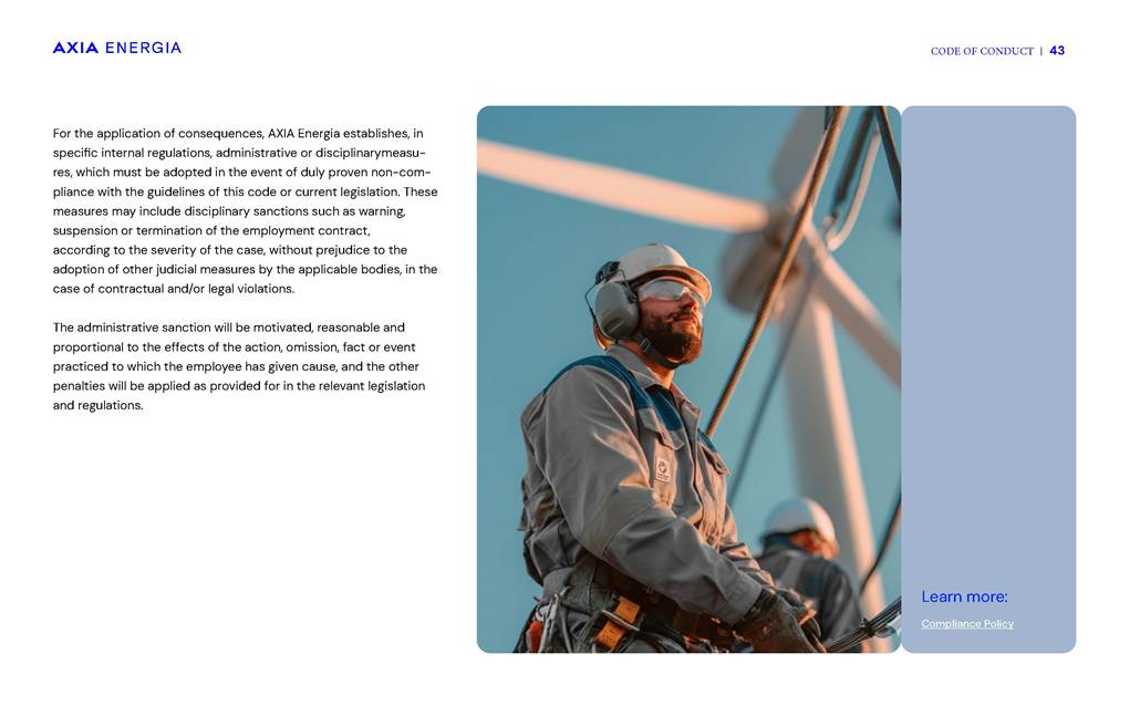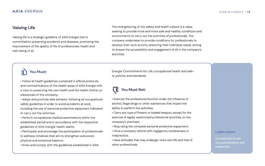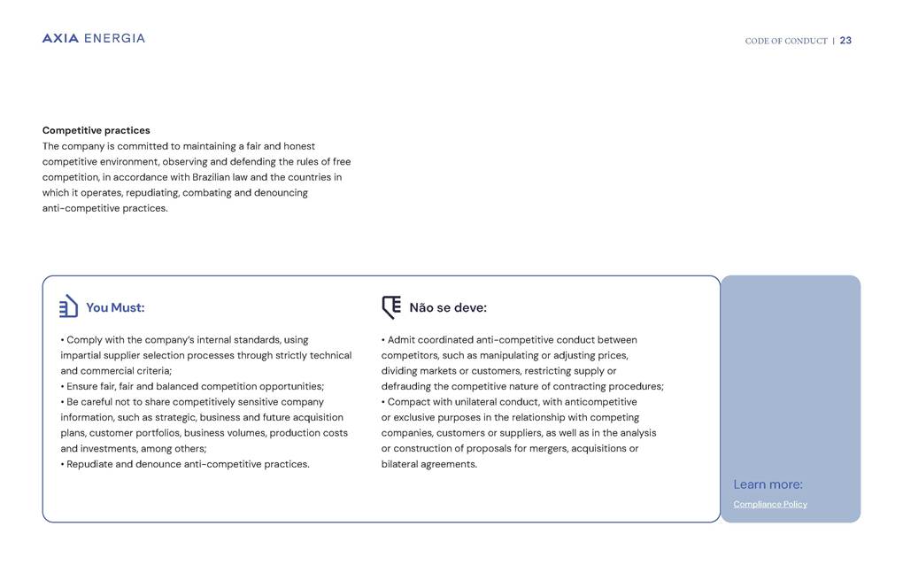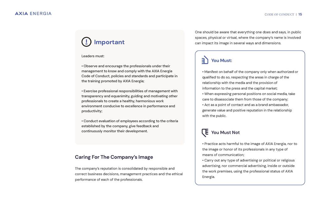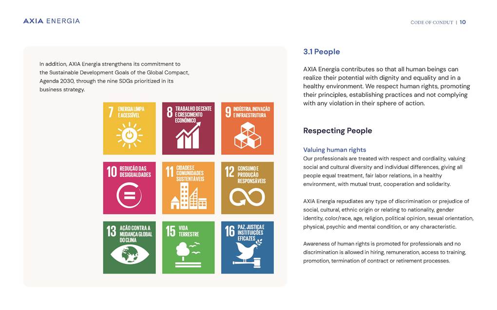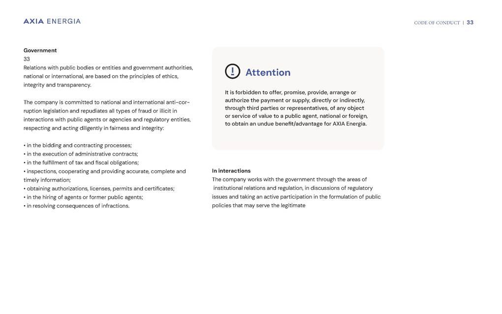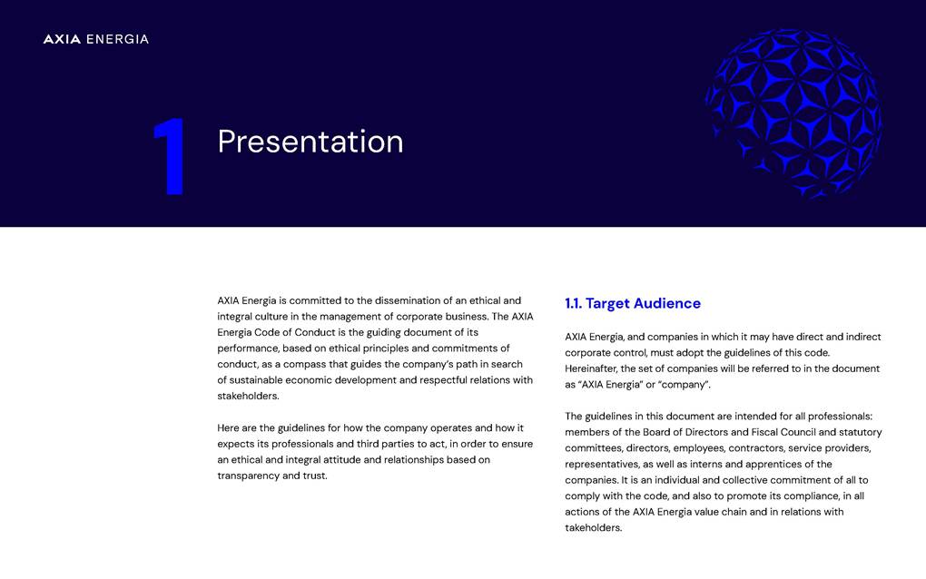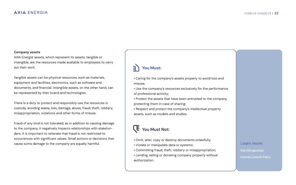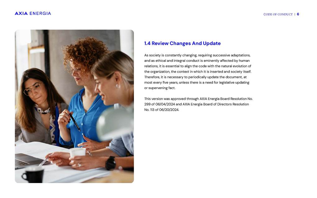 CÓDIGO DE CONDUTA | 1 Code of Conduct CÓDIGO DE CONDUTA | 2 Our pursuit of ethical excellence transcends the ordinary. But it is in daily life, in the most common and common actions, that it is esta blished. We want to create, together with all our professionals and partners, a legacy of integrity that echoes in every interaction. The refore, the AXIA Energia Code of Conduct is not a static document. It is a renewed commitment; a guiding instrument for the daily lives of our managers, leaders, professionals and everyone who relates to the company; a compass to guide our steps towards a future in which ethics is not just an ideal, but the essence of who we are. We establish here the principles in which we believe and our duties to all society, organized in the themes People, Planet, Governance and Prosperity. This version was built on the solid foundation of our values – with emphasis on Life First and Integrity Always – and our purpose of caring for the planet by delivering the energy we believe in. We reinforce, with the ESG (Environmental, Social and Governance) lens, the connection between our objectives and our actions, our behaviors and our positions as a company and as people. We affirm our nonnegotiable commitment to safety and sustainable growth, hand in hand with ethical values, inseparable partners for the rele vance and continuity of any business. To be effective, it is essential that this living document reaches not only AXIA Energia professionals, but suppliers, partners, customers, communities, public authorities, the press, shareholders and socie ty in general. I invite everyone, therefore, to know this new version of our Code of Conduct and to take responsibility for ethical, inte gral and sustainable action, every day. Enjoy reading! Ivan de Souza Monteiro , presidente de AXIA Energia A WORD FROM THE PRESIDENT CÓDIGO DE CONDUTA | 3 TABLE OF CONTENTS 04.Code Effectiveness34 4.1 Commitment 34 4.2 Doubts and manifestations 34 4.3 Complaints 35 4.4 Violations and consequences 36 05.Glossary38 06.Term of Acceptance42 1.Presentation04 1.1 Target audience04 1.2 How to apply the guidelines05 1.3 Responsibilities05 1.4 Review and updates06 02.Corporate Identity07 03.Conduct Commitments09 3.1 People 10 3.2 Planet 16 3.3 Governance 17 3.4 Prosperity 32 CÓDIGO DE CONDUTA | 4 AXIA Energia is committed to the dissemination of an ethical and integral culture in the management of corporate business. The AXIA Energia Code of Conduct is the guiding document of its performance, based on ethical principles and commitments of conduct, as a compass that guides the company’s path in search of sustainable economic development and respectful relations with stakeholders. Here are the guidelines for how the company operates and how it expects its professionals and third parties to act, in order to ensure an ethical and integral attitude and relationships based on transparency and trust. 1 Presentation 1.1. Target Audience AXIA Energia, and companies in which it may have direct and indirect corporate control, must adopt the guidelines of this code. Hereinafter, the set of companies will be referred to in the document as “AXIA Energia” or “company”. The guidelines in this document are intended for all professionals: members of the Board of Directors and Fiscal Council and statutory committees, directors, employees, contractors, service providers, representatives, as well as interns and apprentices of the companies. It is an individual and collective commitment of all to comply with the code, and also to promote its compliance, in all actions of the AXIA Energia value chain and in relations with takeholders. CODE OF CONDUCT | 5 These guidelines are also intended for all audiences who have any form of relationship or who represent AXIA Energia. Thus, AXIA Energia supplier companies, service providers, and other partners will have in their contracts, partnerships, agreements, terms or agreements, including shareholders’ agreement, specific clauses, according to the business carried out, in which they undertake to respect, comply with and enforce, as appropriate, this Code of Conduct, the Compliance Program and AXIA Energia policies. 1.2. How To Apply The Guidelines Importantly, the conduct commitments expressed in this document apply to all environments: face-to-face, remote work, hybrid or any other type of work that arises. The topics that involve the company’s professional performance are addressed here. For situations not provided for in this code, it is recommended that decision making be carried out considering the following analyzes: •Is the conduct considered legal or in accordance with this code and AXIA Energia policies? •Are the risks and the decision to be made the best for the company? • Is conduct a good example for co-workers? •If there was publicity in the press, would the situation be comfortable? If the answer to all questions is positive, it indicates that the attitude is in compliance and that the collaborator is contributing to strengthening the company’s integrity environment. If the answer is negative on at least one of these questions, be sure to ask for guidance, either from the manager or from the area responsible for the Compliance Program in the company. 1.3 Responsabilidades The Board of Directors, through the Audit and Risk Committee (CAE), is responsible for supervising this code, approving each new version of the document, reinforcing its commitment and sponsorship to the guiding pillars of AXIA Energia ethical performance and the importance of these dimensions in business practices. The Vice-Presidency of Governance, Risks, Compliance and Sustainability of AXIA Energia, through the instance of corporate integrity, is responsible for the preparation and review of the document, acting in partnership with the other areas of the company and also for the implementation and application of the guidelines. Responsible for the correct disseminatio