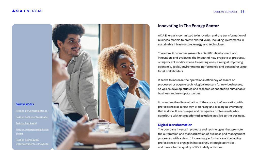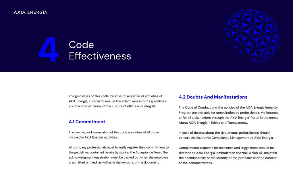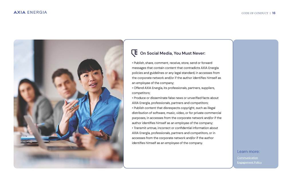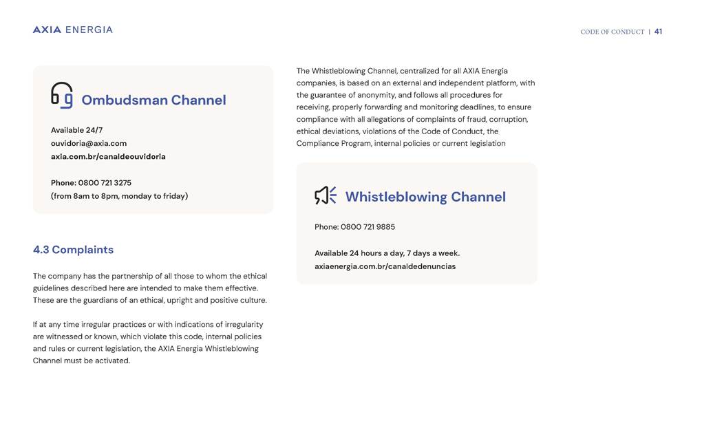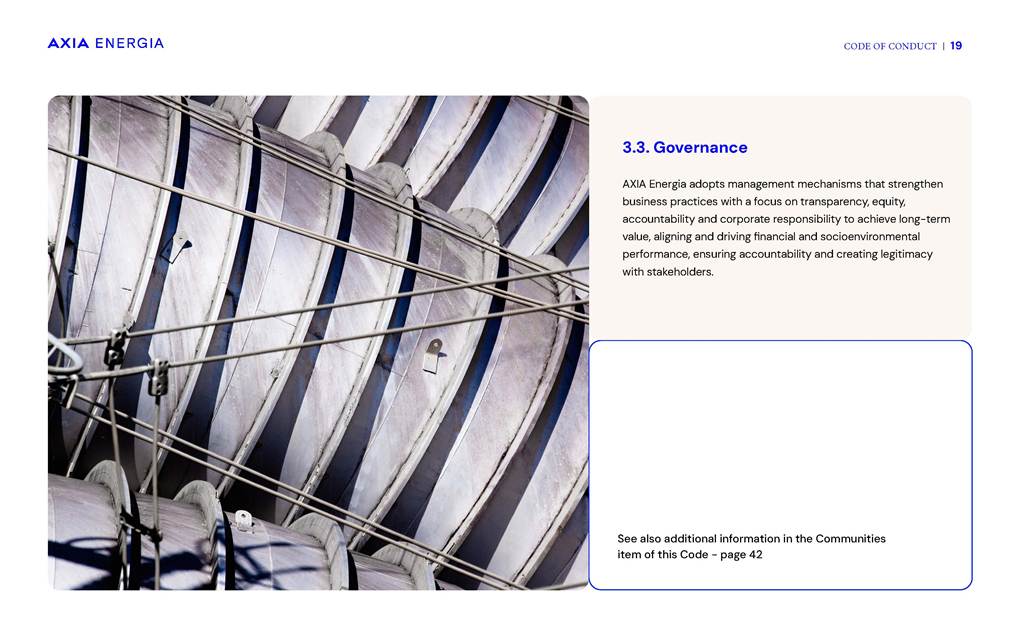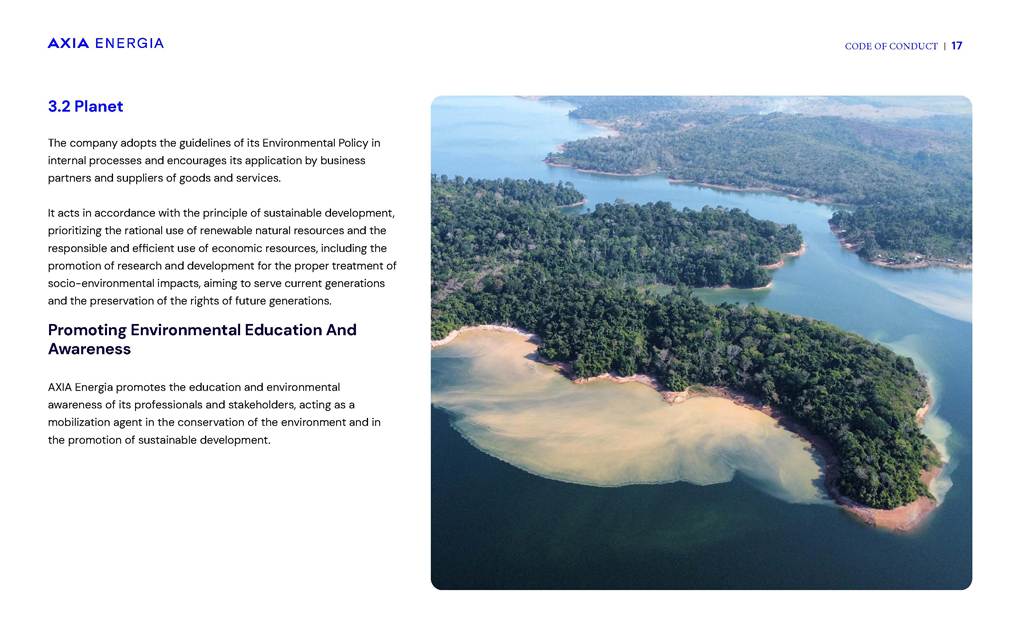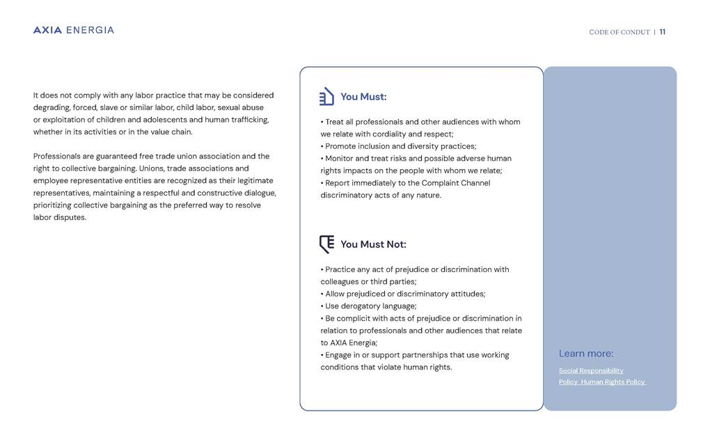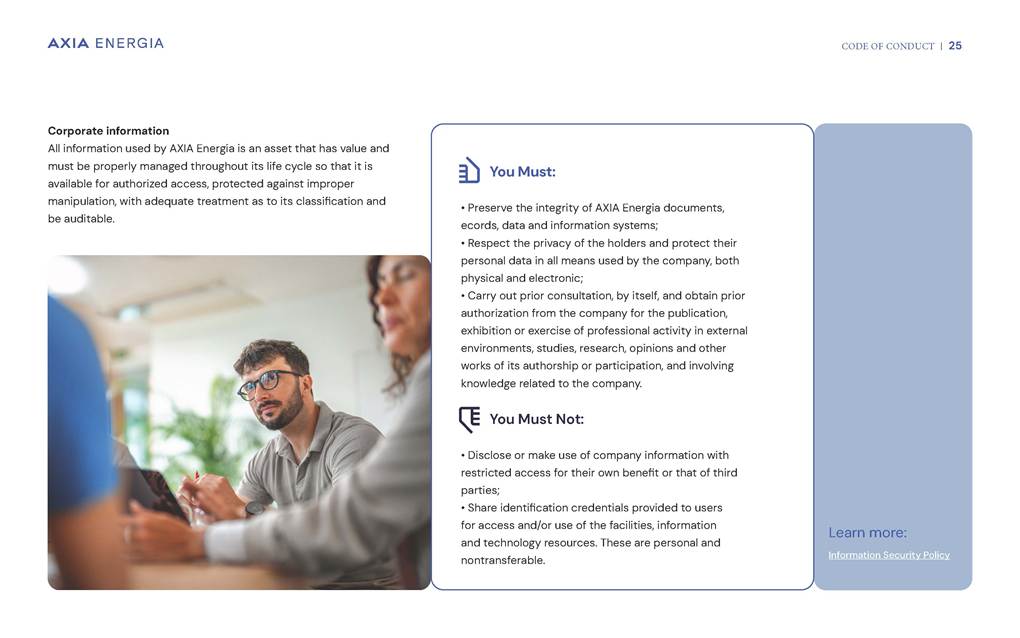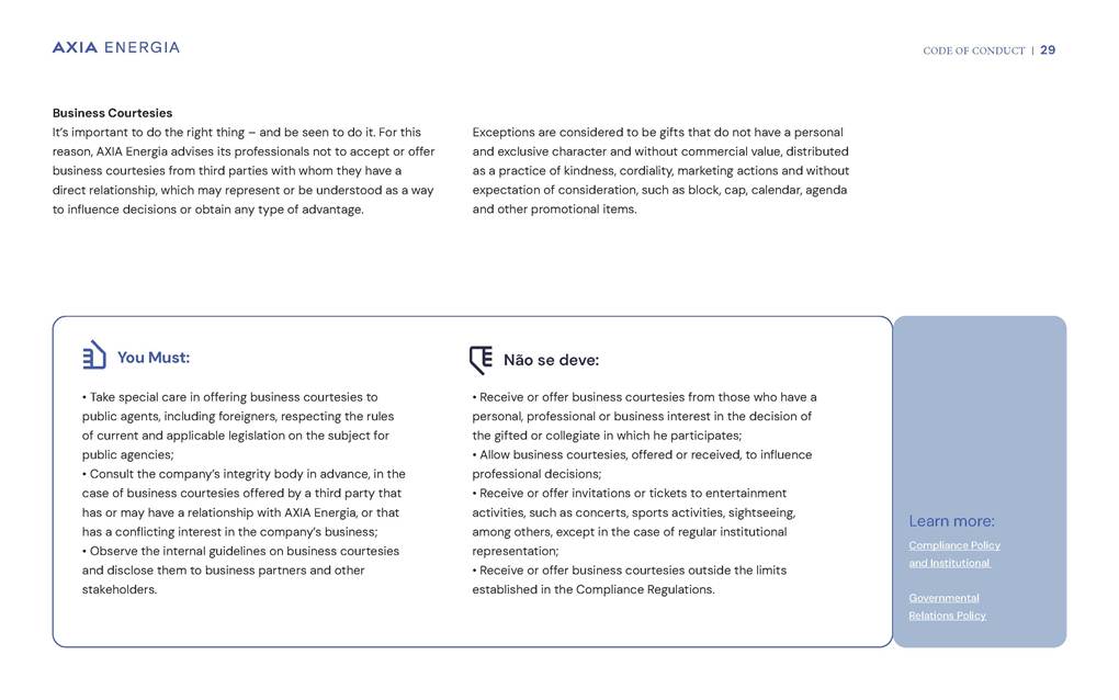 CÓDIGO DE CONDUTA | 1 Code of Conduct CÓDIGO DE CONDUTA | 2 Our pursuit of ethical excellence transcends the ordinary. But it is in daily life, in the most common and common actions, that it is esta blished. We want to create, together with all our professionals and partners, a legacy of integrity that echoes in every interaction. The refore, the AXIA Energia Code of Conduct is not a static document. It is a renewed commitment; a guiding instrument for the daily lives of our managers, leaders, professionals and everyone who relates to the company; a compass to guide our steps towards a future in which ethics is not just an ideal, but the essence of who we are. We establish here the principles in which we believe and our duties to all society, organized in the themes People, Planet, Governance and Prosperity. This version was built on the solid foundation of our values – with emphasis on Life First and Integrity Always – and our purpose of caring for the planet by delivering the energy we believe in. We reinforce, with the ESG (Environmental, Social and Governance) lens, the connection between our objectives and our actions, our behaviors and our positions as a company and as people. We affirm our nonnegotiable commitment to safety and sustainable growth, hand in hand with ethical values, inseparable partners for the rele vance and continuity of any business. To be effective, it is essential that this living document reaches not only AXIA Energia professionals, but suppliers, partners, customers, communities, public authorities, the press, shareholders and socie ty in general. I invite everyone, therefore, to know this new version of our Code of Conduct and to take responsibility for ethical, inte gral and sustainable action, every day. Enjoy reading! Ivan de Souza Monteiro , presidente de AXIA Energia A WORD FROM THE PRESIDENT CÓDIGO DE CONDUTA | 3 TABLE OF CONTENTS 04.Code Effectiveness34 4.1 Commitment 34 4.2 Doubts and manifestations 34 4.3 Complaints 35 4.4 Violations and consequences 36 05.Glossary38 06.Term of Acceptance42 1.Presentation04 1.1 Target audience04 1.2 How to apply the guidelines05 1.3 Responsibilities05 1.4 Review and updates06 02.Corporate Identity07 03.Conduct Commitments09 3.1 People 10 3.2 Planet 16 3.3 Governance 17 3.4 Prosperity 32 CÓDIGO DE CONDUTA | 4 AXIA Energia is committed to the dissemination of an ethical and integral culture in the management of corporate business. The AXIA Energia Code of Conduct is the guiding document of its performance, based on ethical principles and commitments of conduct, as a compass that guides the company’s path in search of sustainable economic development and respectful relations with stakeholders. Here are the guidelines for how the company operates and how it expects its professionals and third parties to act, in order to ensure an ethical and integral attitude and relationships based on transparency and trust. 1 Presentation 1.1. Target Audience AXIA Energia, and companies in which it may have direct and indirect corporate control, must adopt the guidelines of this code. Hereinafter, the set of companies will be referred to in the document as “AXIA Energia” or “company”. The guidelines in this document are intended for all professionals: members of the Board of Directors and Fiscal Council and statutory committees, directors, employees, contractors, service providers, representatives, as well as interns and apprentices of the companies. It is an individual and collective commitment of all to comply with the code, and also to promote its compliance, in all actions of the AXIA Energia value chain and in relations with takeholders. CODE OF CONDUCT | 5 These guidelines are also intended for all audiences who have any form of relationship or who represent AXIA Energia. Thus, AXIA Energia supplier companies, service providers, and other partners will have in their contracts, partnerships, agreements, terms or agreements, including shareholders’ agreement, specific clauses, according to the business carried out, in which they undertake to respect, comply with and enforce, as appropriate, this Code of Conduct, the Compliance Program and AXIA Energia policies. 1.2. How To Apply The Guidelines Importantly, the conduct commitments expressed in this document apply to all environments: face-to-face, remote work, hybrid or any other type of work that arises. The topics that involve the company’s professional performance are addressed here. For situations not provided for in this code, it is recommended that decision making be carried out considering the following analyzes: •Is the conduct considered legal or in accordance with this code and AXIA Energia policies? •Are the risks and the decision to be made the best for the company? • Is conduct a good example for co-workers? •If there was publicity in the press, would the situation be comfortable? If the answer to all questions is positive, it indicates that the attitude is in compliance and that the collaborator is contributing to strengthening the company’s integrity environment. If the answer is negative on at least one of these questions, be sure to ask for guidance, either from the manager or from the area responsible for the Compliance Program in the company. 1.3 Responsabilidades The Board of Directors, through the Audit and Risk Committee (CAE), is responsible for supervising this code, approving each new version of the document, reinforcing its commitment and sponsorship to the guiding pillars of AXIA Energia ethical performance and the importance of these dimensions in business practices. The Vice-Presidency of Governance, Risks, Compliance and Sustainability of AXIA Energia, through the instance of corporate integrity, is responsible for the preparation and review of the document, acting in partnership with the other areas of the company and also for the implementation and application of the guidelines. Responsible for the correct disseminatio
