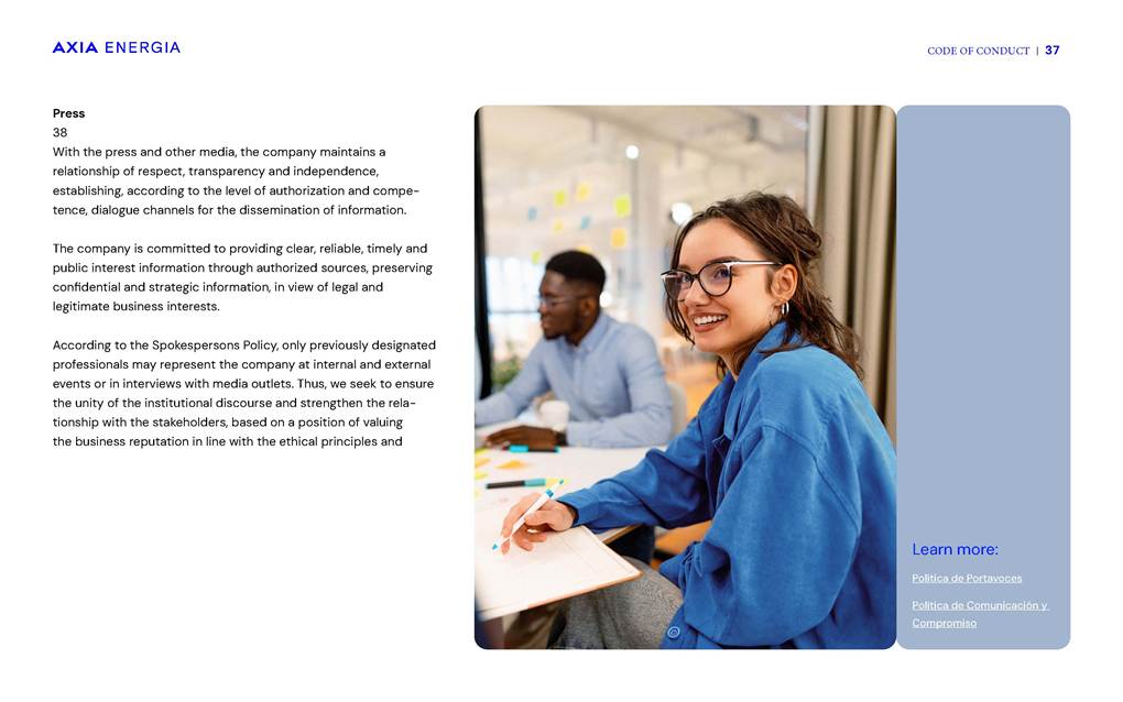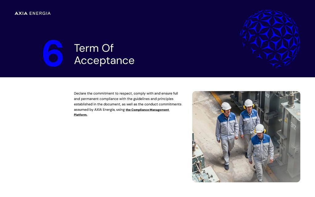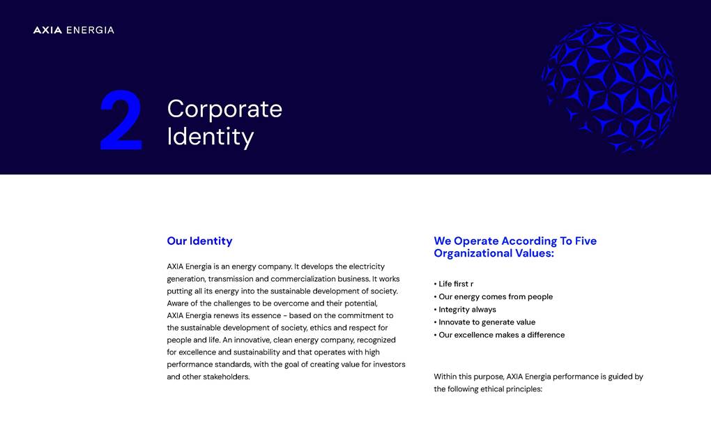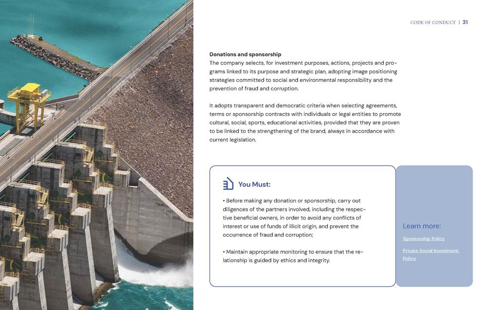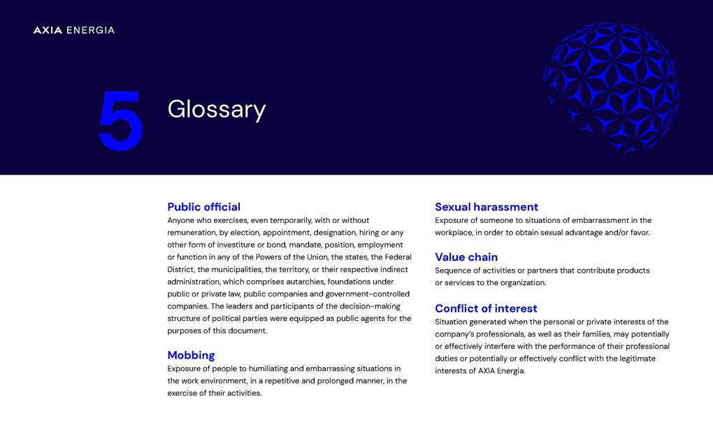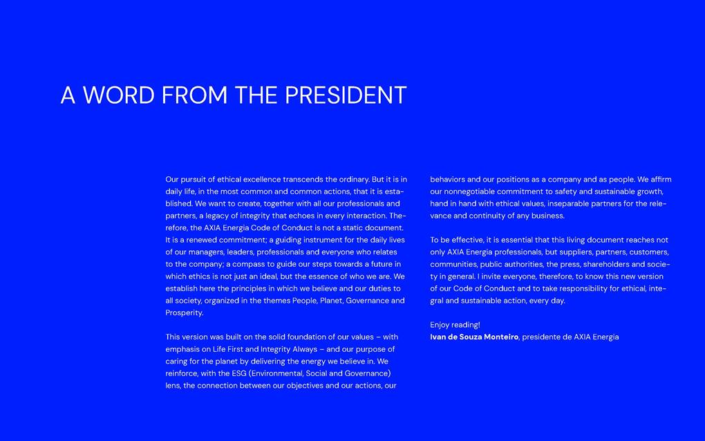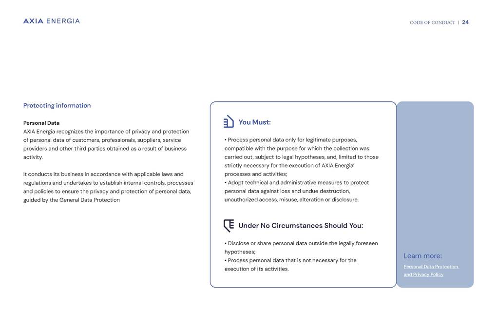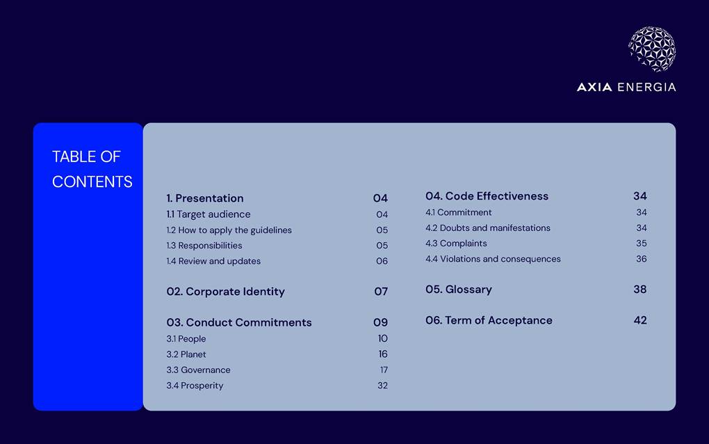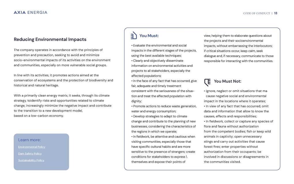 CÓDIGO DE CONDUTA | 1 Code of Conduct CÓDIGO DE CONDUTA | 2 Our pursuit of ethical excellence transcends the ordinary. But it is in daily life, in the most common and common actions, that it is esta blished. We want to create, together with all our professionals and partners, a legacy of integrity that echoes in every interaction. The refore, the AXIA Energia Code of Conduct is not a static document. It is a renewed commitment; a guiding instrument for the daily lives of our managers, leaders, professionals and everyone who relates to the company; a compass to guide our steps towards a future in which ethics is not just an ideal, but the essence of who we are. We establish here the principles in which we believe and our duties to all society, organized in the themes People, Planet, Governance and Prosperity. This version was built on the solid foundation of our values – with emphasis on Life First and Integrity Always – and our purpose of caring for the planet by delivering the energy we believe in. We reinforce, with the ESG (Environmental, Social and Governance) lens, the connection between our objectives and our actions, our behaviors and our positions as a company and as people. We affirm our nonnegotiable commitment to safety and sustainable growth, hand in hand with ethical values, inseparable partners for the rele vance and continuity of any business. To be effective, it is essential that this living document reaches not only AXIA Energia professionals, but suppliers, partners, customers, communities, public authorities, the press, shareholders and socie ty in general. I invite everyone, therefore, to know this new version of our Code of Conduct and to take responsibility for ethical, inte gral and sustainable action, every day. Enjoy reading! Ivan de Souza Monteiro , presidente de AXIA Energia A WORD FROM THE PRESIDENT CÓDIGO DE CONDUTA | 3 TABLE OF CONTENTS 04.Code Effectiveness34 4.1 Commitment 34 4.2 Doubts and manifestations 34 4.3 Complaints 35 4.4 Violations and consequences 36 05.Glossary38 06.Term of Acceptance42 1.Presentation04 1.1 Target audience04 1.2 How to apply the guidelines05 1.3 Responsibilities05 1.4 Review and updates06 02.Corporate Identity07 03.Conduct Commitments09 3.1 People 10 3.2 Planet 16 3.3 Governance 17 3.4 Prosperity 32 CÓDIGO DE CONDUTA | 4 AXIA Energia is committed to the dissemination of an ethical and integral culture in the management of corporate business. The AXIA Energia Code of Conduct is the guiding document of its performance, based on ethical principles and commitments of conduct, as a compass that guides the company’s path in search of sustainable economic development and respectful relations with stakeholders. Here are the guidelines for how the company operates and how it expects its professionals and third parties to act, in order to ensure an ethical and integral attitude and relationships based on transparency and trust. 1 Presentation 1.1. Target Audience AXIA Energia, and companies in which it may have direct and indirect corporate control, must adopt the guidelines of this code. Hereinafter, the set of companies will be referred to in the document as “AXIA Energia” or “company”. The guidelines in this document are intended for all professionals: members of the Board of Directors and Fiscal Council and statutory committees, directors, employees, contractors, service providers, representatives, as well as interns and apprentices of the companies. It is an individual and collective commitment of all to comply with the code, and also to promote its compliance, in all actions of the AXIA Energia value chain and in relations with takeholders. CODE OF CONDUCT | 5 These guidelines are also intended for all audiences who have any form of relationship or who represent AXIA Energia. Thus, AXIA Energia supplier companies, service providers, and other partners will have in their contracts, partnerships, agreements, terms or agreements, including shareholders’ agreement, specific clauses, according to the business carried out, in which they undertake to respect, comply with and enforce, as appropriate, this Code of Conduct, the Compliance Program and AXIA Energia policies. 1.2. How To Apply The Guidelines Importantly, the conduct commitments expressed in this document apply to all environments: face-to-face, remote work, hybrid or any other type of work that arises. The topics that involve the company’s professional performance are addressed here. For situations not provided for in this code, it is recommended that decision making be carried out considering the following analyzes: •Is the conduct considered legal or in accordance with this code and AXIA Energia policies? •Are the risks and the decision to be made the best for the company? • Is conduct a good example for co-workers? •If there was publicity in the press, would the situation be comfortable? If the answer to all questions is positive, it indicates that the attitude is in compliance and that the collaborator is contributing to strengthening the company’s integrity environment. If the answer is negative on at least one of these questions, be sure to ask for guidance, either from the manager or from the area responsible for the Compliance Program in the company. 1.3 Responsabilidades The Board of Directors, through the Audit and Risk Committee (CAE), is responsible for supervising this code, approving each new version of the document, reinforcing its commitment and sponsorship to the guiding pillars of AXIA Energia ethical performance and the importance of these dimensions in business practices. The Vice-Presidency of Governance, Risks, Compliance and Sustainability of AXIA Energia, through the instance of corporate integrity, is responsible for the preparation and review of the document, acting in partnership with the other areas of the company and also for the implementation and application of the guidelines. Responsible for the correct disseminatio