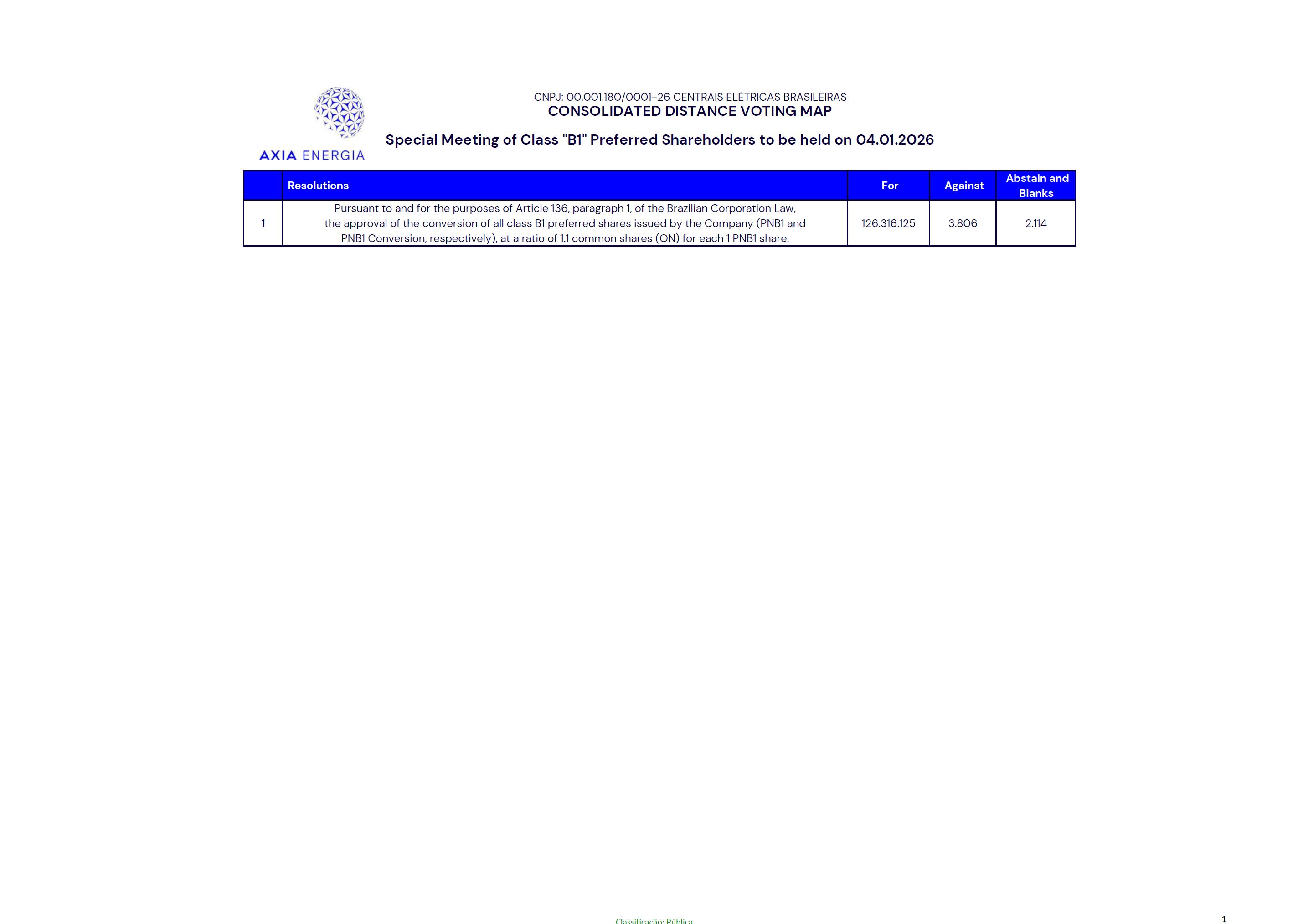 F C Resolutions For Against Abstain and Blanks 1 Pursuant to and for the purposes of Article 136, paragraph 1, of the Brazilian Corporation Law,the approval of the conversion of all class B1 preferred shares issued by the Company (PNB1 andPNB1 Conversion, respectively), at a ratio of 1.1 common shares (ON) for each 1 PNB1 share. 126.316.125 3.806 2.114 CNPJ: 00.001.180/0001-26 CENTRAIS ELÉTRICAS BRASILEIRAS CONSOLIDATED DISTANCE VOTING MAP Special Meeting of Class "B1" Preferred Shareholders to be held on 04.01.2026 # Classificação: Pública 1