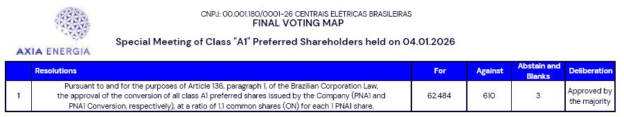 F C A Resolutions For Against Abstain and Blanks Deliberation 1 Pursuant to and for the purposes of Article 136, paragraph 1, of the Brazilian Corporation Law, the approval of the conversion of all class A1 preferred shares issued by the Company (PNA1 and PNA1 Conversion, respectively), at a ratio of 1.1 common shares (ON) for each 1 PNA1 share. 62.484 610 3 Approved by the majority CNPJ: 00.001.180/0001-26 CENTRAIS ELÉTRICAS BRASILEIRAS FINAL VOTING MAP Special Meeting of Class "A1" Preferred Shareholders held on 04.01.2026 # Classificação: Pública 1