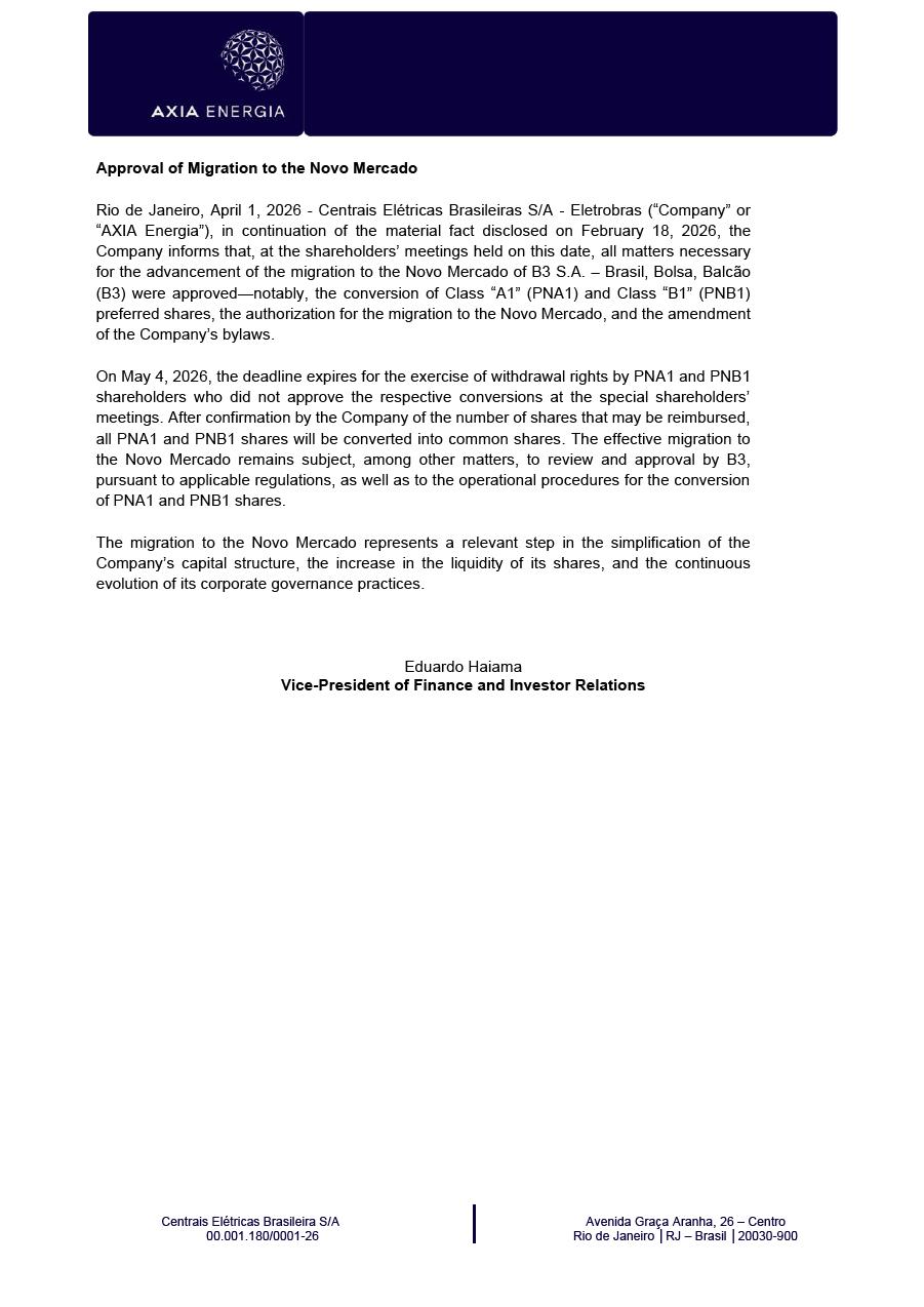 Centrais Elétricas Brasileira S/A 00.001.180/0001-26 Avenida Graça Aranha, 26 – Centro Rio de Janeiro │RJ – Brasil │20030-900 Approval of Migration to the Novo Mercado Rio de Janeiro, April 1, 2026 - Centrais Elétricas Brasileiras S/A - Eletrobras (“Company” or “AXIA Energia”), in continuation of the material fact disclosed on February 18, 2026, the Company informs that, at the shareholders’ meetings held on this date, all matters necessary for the advancement of the migration to the Novo Mercado of B3 S.A. – Brasil, Bolsa, Balcão (B3) were approved—notably, the conversion of Class “A1” (PNA1) and Class “B1” (PNB1) preferred shares, the authorization for the migration to the Novo Mercado, and the amendment of the Company’s bylaws. On May 4, 2026, the deadline expires for the exercise of withdrawal rights by PNA1 and PNB1 shareholders who did not approve the respective conversions at the special shareholders’ meetings. After confirmation by the Company of the number of shares that may be reimbursed, all PNA1 and PNB1 shares will be converted into common shares. The effective migration to the Novo Mercado remains subject, among other matters, to review and approval by B3, pursuant to applicable regulations, as well as to the operational procedures for the conversion of PNA1 and PNB1 shares. The migration to the Novo Mercado represents a relevant step in the simplification of the Company’s capital structure, the increase in the liquidity of its shares, and the continuous evolution of its corporate governance practices. Eduardo Haiama Vice-President of Finance and Investor Relations