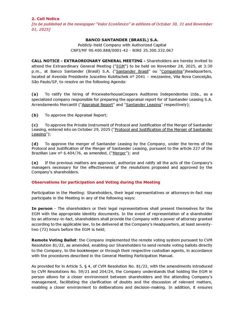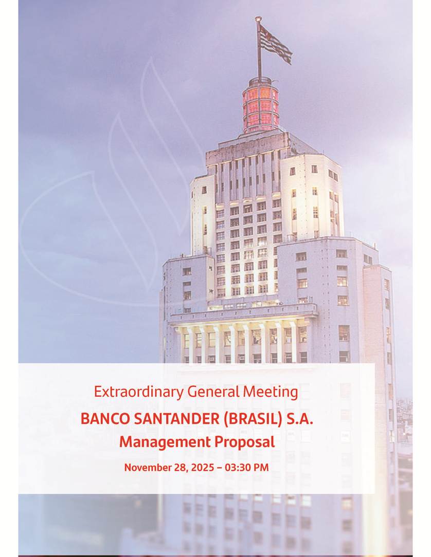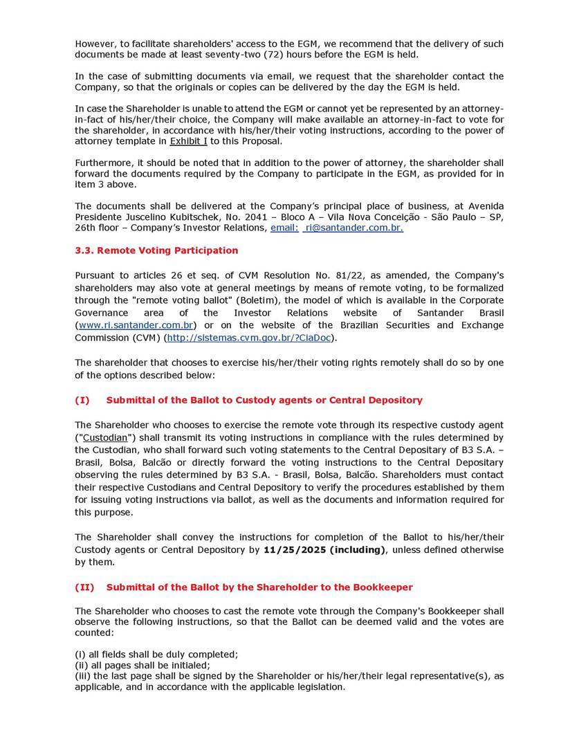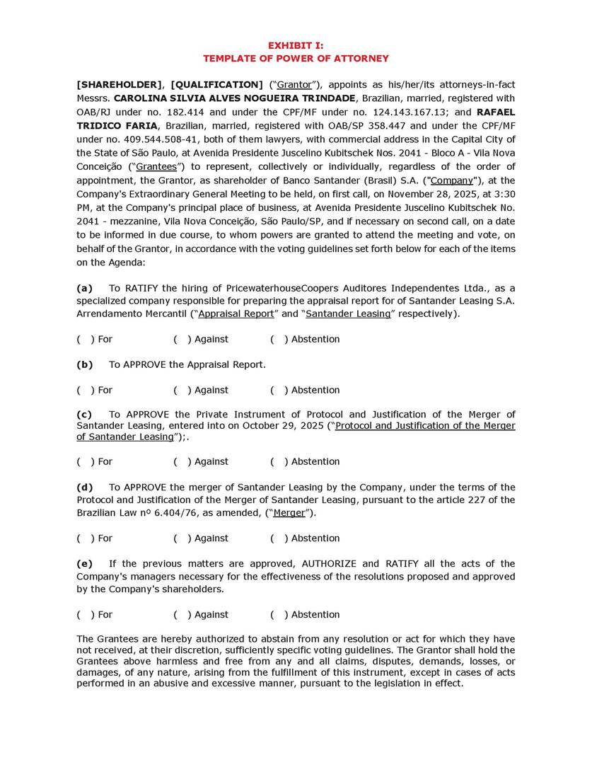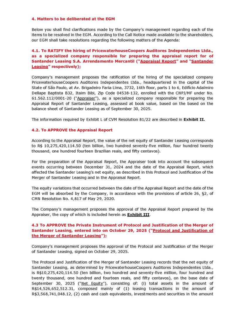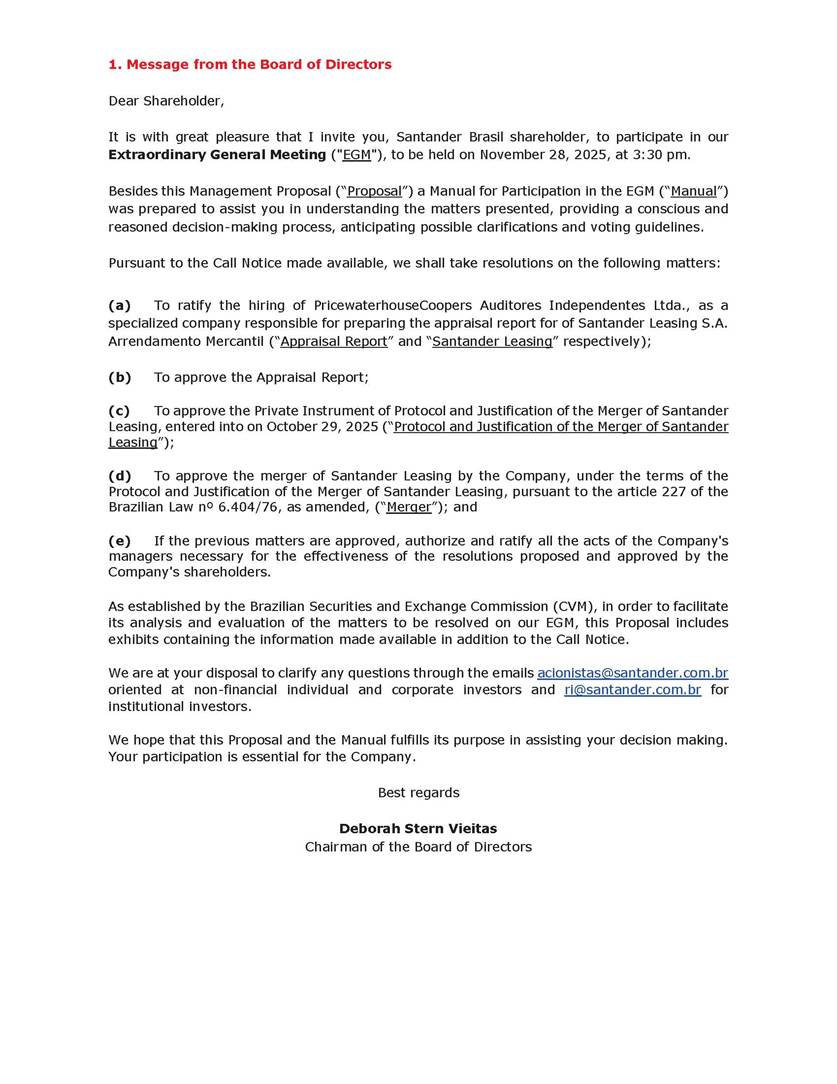 BANCO SANTANDER (BRASIL) S.A. Management Proposal November 28, 2025 – 03:30 PM Extraordinary General Meeting SUMMARY 1. Message from the Board of Directors ......................................... 3 2. Call Notice .................................................................................. 4 3. Shareholder participation in the EGM ......................................... 6 4. Matters to be deliberated at the EGM ....................................... 10 EXHIBIT I: TEMPLATE OF POWER OF ATTORNEY ......................... 12 EXHIBIT II: INFORMATION OF THE APPRAISER ........................... 14 EXHIBIT III: APPRAISAL REPORT ................................................ 16 EXHIBIT IV: PROTOCOL AND JUSTIFICATION OF THE MERGER OF SANTANDER LEASING ............................................... 17 EXHIBIT V: INFORMATION ABOUT THE MERGER .......................... 24 1. Message from the Board of Directors Dear Shareholder, It is with great pleasure that I invite you, Santander Brasil shareholder, to participate in our Extraordinary General Meeting ("EGM"), to be held on November 28, 2025, at 3:30 pm. Besides this Management Proposal (“Proposal”) a Manual for Participation in the EGM (“Manual”) was prepared to assist you in understanding the matters presented, providing a conscious and reasoned decision-making process, anticipating possible clarifications and voting guidelines. Pursuant to the Call Notice made available, we shall take resolutions on the following matters: (a) To ratify the hiring of PricewaterhouseCoopers Auditores Independentes Ltda., as a specialized company responsible for preparing the appraisal report for of Santander Leasing S.A. Arrendamento Mercantil (“Appraisal Report” and “Santander Leasing” respectively); (b) To approve the Appraisal Report; (c) To approve the Private Instrument of Protocol and Justification of the Merger of Santander Leasing, entered into on October 29, 2025 (“Protocol and Justification of the Merger of Santander Leasing”); (d) To approve the merger of Santander Leasing by the Company, under the terms of the Protocol and Justification of the Merger of Santander Leasing, pursuant to the article 227 of the Brazilian Law nº 6.404/76, as amended, (“Merger”); and (e) If the previous matters are approved, authorize and ratify all the acts of the Company's managers necessary for the effectiveness of the resolutions proposed and approved by the Company's shareholders. As established by the Brazilian Securities and Exchange Commission (CVM), in order to facilitate its analysis and evaluation of the matters to be resolved on our EGM, this Proposal includes exhibits containing the information made available in addition to the Call Notice. We are at your disposal to clarify any questions through the emails acionistas@santander.com.br oriented at non-financial individual and corporate investors and ri@santander.com.br for institutional investors. We hope that this Proposal and the Manual fulfills its purpose in assisting your decision making. Your participation is essential for the Company. Best regards Deborah Stern Vieitas Chairman of the Board of Directors 2. Call Notice [to be published in the newspaper "Valor Econômico" in editions of October 30, 31 and November 01, 2025] BANCO SANTANDER (BRASIL) S.A. Publicly-Held Company with Authorized Capital CNPJ/MF 90.400.888/0001-42 - NIRE 35.300.332.067 CALL NOTICE - EXTRAORDINARY GENERAL MEETING - Shareholders are hereby invited to attend the Extraordinary General Meeting ("EGM") to be held on November 28, 2025, at 3:30 p.m., at Banco Santander (Brasil) S.A. (“Santander Brasil” ou “Companhia”)headquarters, located at Avenida Presidente Juscelino Kubitschek nº 2041 – mezzanine, Vila Nova Conceição, São Paulo/SP, to resolve on the following Agenda: (a) To ratify the hiring of PricewaterhouseCoopers Auditores Independentes Ltda., as a specialized company responsible for preparing the appraisal report for of Santander Leasing S.A. Arrendamento Mercantil (“Appraisal Report” and “Santander Leasing” respectively); (b) To approve the Appraisal Report; (c) To approve the Private Instrument of Protocol and Justification of the Merger of Santander Leasing, entered into on October 29, 2025 (“Protocol and Justification of the Merger of Santander Leasing”); (d) To approve the merger of Santander Leasing by the Company, under the terms of the Protocol and Justification of the Merger of Santander Leasing, pursuant to the article 227 of the Brazilian Law nº 6.404/76, as amended, (“Merger”); and (e) If the previous matters are approved, authorize and ratify all the acts of the Company's managers necessary for the effectiveness of the resolutions proposed and approved by the Company's shareholders. Observations for participation and Voting during the Meeting Participation in the Meeting: Shareholders, their legal representatives or attorneys-in-fact may participate in the Meeting in any of the following ways: In person - The shareholders or their legal representatives shall present themselves for the EGM with the appropriate identity documents. In the event of representation of a shareholder by an attorney-in-fact, shareholders shall provide the Company with a power of attorney granted according to the applicable law, to be delivered at the Company's Headquarters, at least seventytwo (72) hours before the EGM is held; Remote Voting Ballot: the Company implemented the remote voting system pursuant to CVM Resolution 81/22, as amended, enabling our Shareholders to send remote voting ballots directly to the Company, to the bookkeeper or through their respective custodian agents, in accordance with the procedures described in the General Meeting Participation Manual. As provided for in Article 5, § 4, of CVM Resolution No. 81/22, with the amendments introduced by CVM Resolutions No. 59/21 and 204/24, the Company understands that holding the EGM in person allows for a 