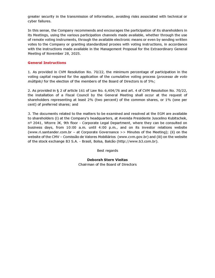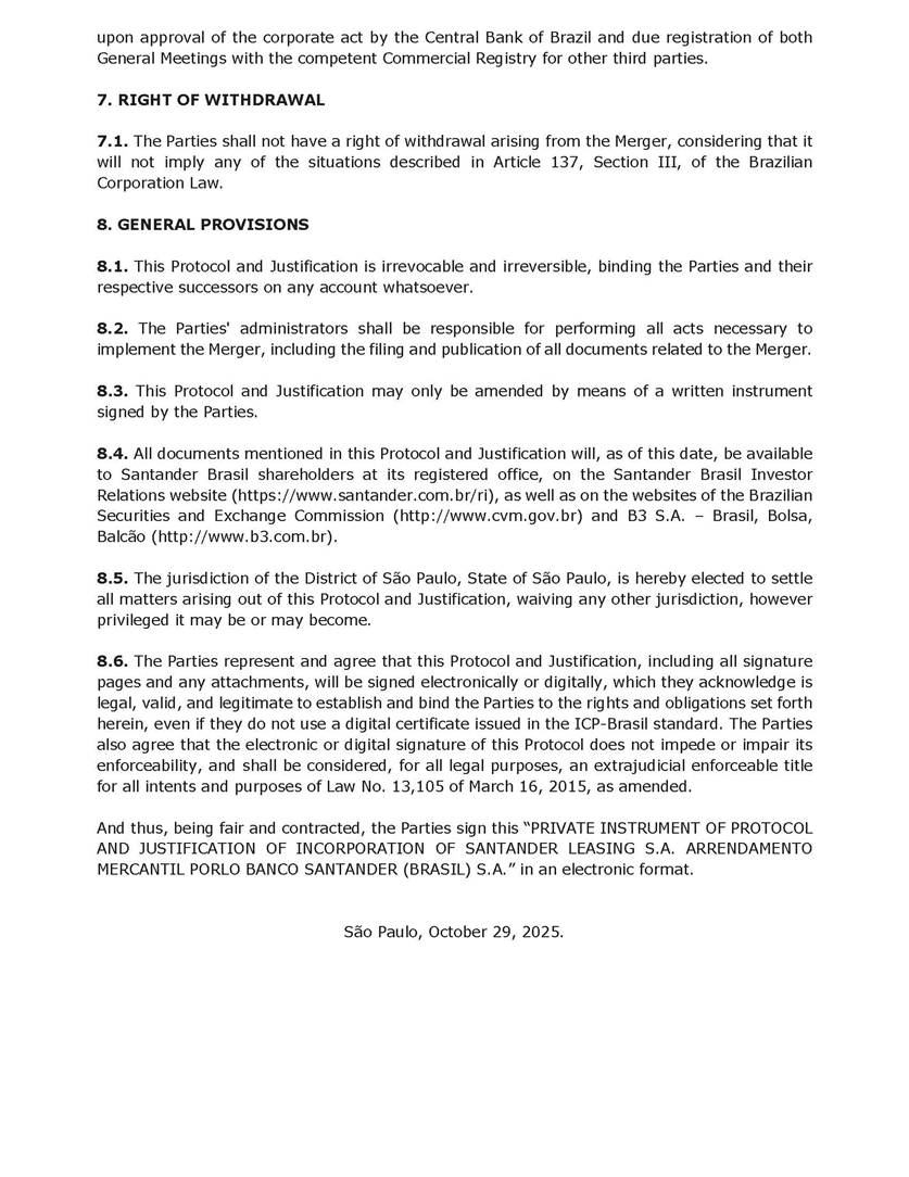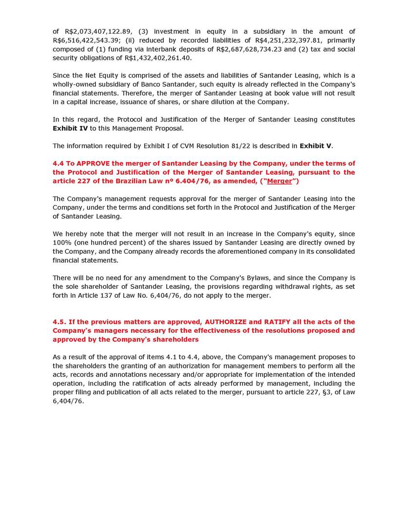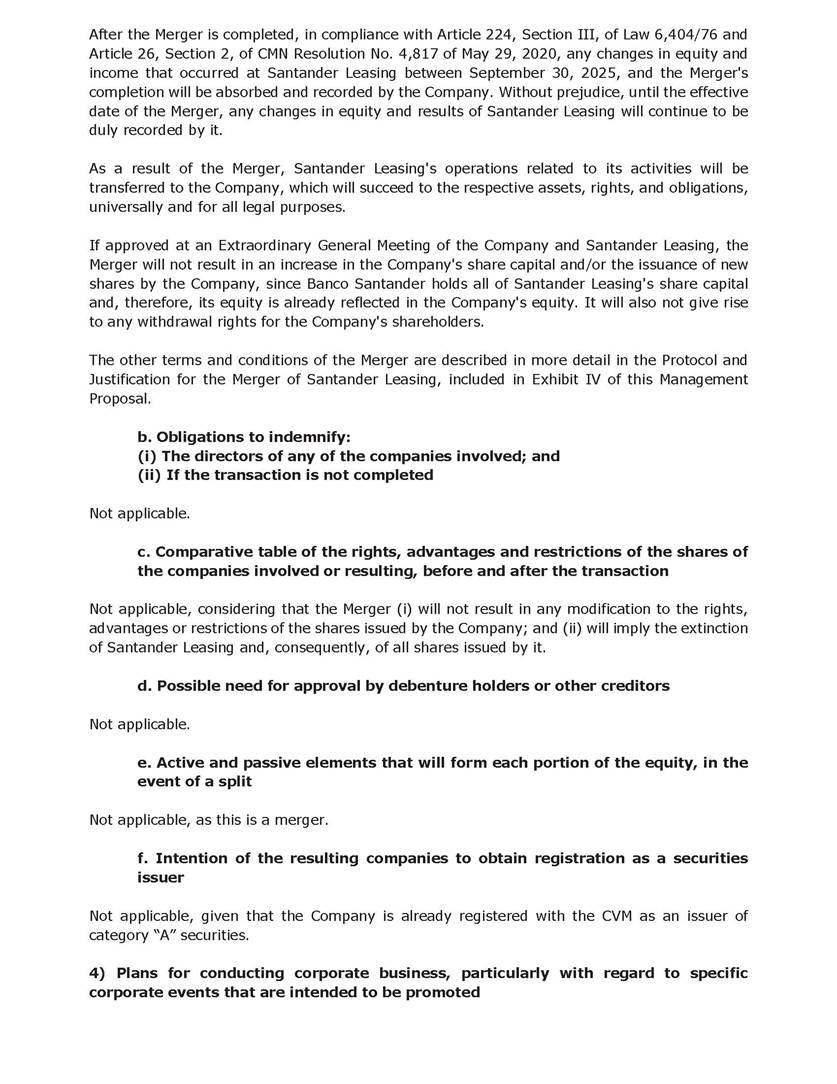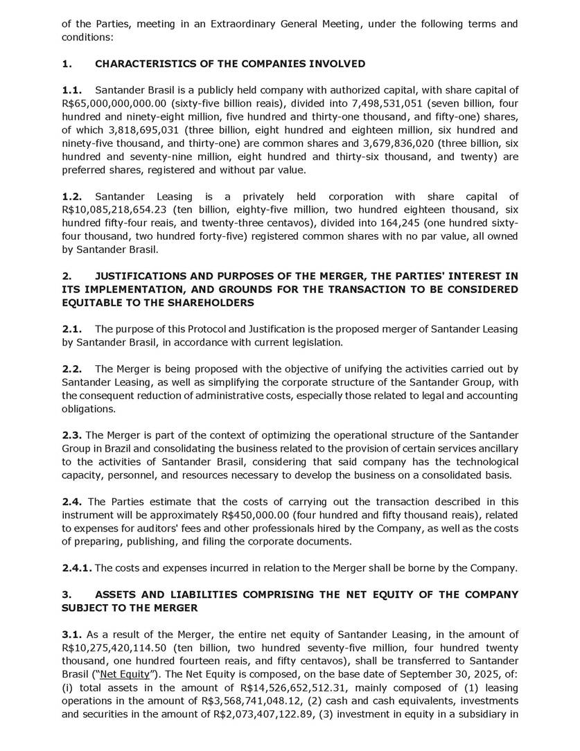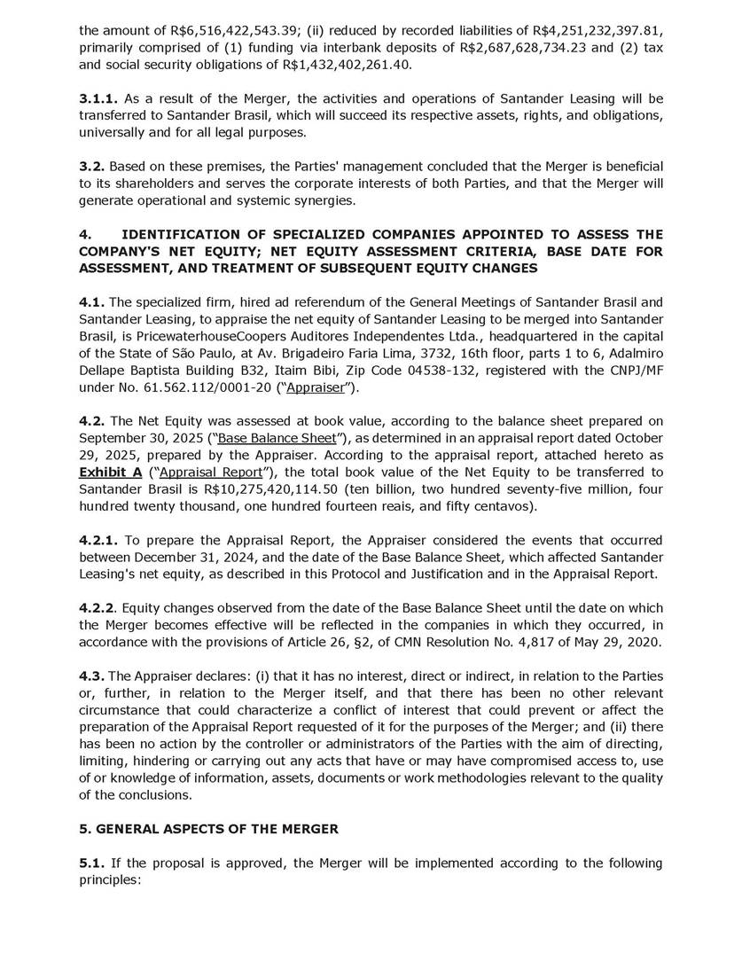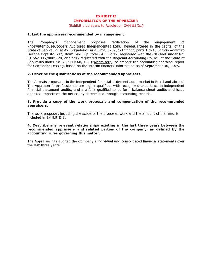 BANCO SANTANDER (BRASIL) S.A. Management Proposal November 28, 2025 – 03:30 PM Extraordinary General Meeting SUMMARY 1. Message from the Board of Directors ......................................... 3 2. Call Notice .................................................................................. 4 3. Shareholder participation in the EGM ......................................... 6 4. Matters to be deliberated at the EGM ....................................... 10 EXHIBIT I: TEMPLATE OF POWER OF ATTORNEY ......................... 12 EXHIBIT II: INFORMATION OF THE APPRAISER ........................... 14 EXHIBIT III: APPRAISAL REPORT ................................................ 16 EXHIBIT IV: PROTOCOL AND JUSTIFICATION OF THE MERGER OF SANTANDER LEASING ............................................... 17 EXHIBIT V: INFORMATION ABOUT THE MERGER .......................... 24 1. Message from the Board of Directors Dear Shareholder, It is with great pleasure that I invite you, Santander Brasil shareholder, to participate in our Extraordinary General Meeting ("EGM"), to be held on November 28, 2025, at 3:30 pm. Besides this Management Proposal (“Proposal”) a Manual for Participation in the EGM (“Manual”) was prepared to assist you in understanding the matters presented, providing a conscious and reasoned decision-making process, anticipating possible clarifications and voting guidelines. Pursuant to the Call Notice made available, we shall take resolutions on the following matters: (a) To ratify the hiring of PricewaterhouseCoopers Auditores Independentes Ltda., as a specialized company responsible for preparing the appraisal report for of Santander Leasing S.A. Arrendamento Mercantil (“Appraisal Report” and “Santander Leasing” respectively); (b) To approve the Appraisal Report; (c) To approve the Private Instrument of Protocol and Justification of the Merger of Santander Leasing, entered into on October 29, 2025 (“Protocol and Justification of the Merger of Santander Leasing”); (d) To approve the merger of Santander Leasing by the Company, under the terms of the Protocol and Justification of the Merger of Santander Leasing, pursuant to the article 227 of the Brazilian Law nº 6.404/76, as amended, (“Merger”); and (e) If the previous matters are approved, authorize and ratify all the acts of the Company's managers necessary for the effectiveness of the resolutions proposed and approved by the Company's shareholders. As established by the Brazilian Securities and Exchange Commission (CVM), in order to facilitate its analysis and evaluation of the matters to be resolved on our EGM, this Proposal includes exhibits containing the information made available in addition to the Call Notice. We are at your disposal to clarify any questions through the emails acionistas@santander.com.br oriented at non-financial individual and corporate investors and ri@santander.com.br for institutional investors. We hope that this Proposal and the Manual fulfills its purpose in assisting your decision making. Your participation is essential for the Company. Best regards Deborah Stern Vieitas Chairman of the Board of Directors 2. Call Notice [to be published in the newspaper "Valor Econômico" in editions of October 30, 31 and November 01, 2025] BANCO SANTANDER (BRASIL) S.A. Publicly-Held Company with Authorized Capital CNPJ/MF 90.400.888/0001-42 - NIRE 35.300.332.067 CALL NOTICE - EXTRAORDINARY GENERAL MEETING - Shareholders are hereby invited to attend the Extraordinary General Meeting ("EGM") to be held on November 28, 2025, at 3:30 p.m., at Banco Santander (Brasil) S.A. (“Santander Brasil” ou “Companhia”)headquarters, located at Avenida Presidente Juscelino Kubitschek nº 2041 – mezzanine, Vila Nova Conceição, São Paulo/SP, to resolve on the following Agenda: (a) To ratify the hiring of PricewaterhouseCoopers Auditores Independentes Ltda., as a specialized company responsible for preparing the appraisal report for of Santander Leasing S.A. Arrendamento Mercantil (“Appraisal Report” and “Santander Leasing” respectively); (b) To approve the Appraisal Report; (c) To approve the Private Instrument of Protocol and Justification of the Merger of Santander Leasing, entered into on October 29, 2025 (“Protocol and Justification of the Merger of Santander Leasing”); (d) To approve the merger of Santander Leasing by the Company, under the terms of the Protocol and Justification of the Merger of Santander Leasing, pursuant to the article 227 of the Brazilian Law nº 6.404/76, as amended, (“Merger”); and (e) If the previous matters are approved, authorize and ratify all the acts of the Company's managers necessary for the effectiveness of the resolutions proposed and approved by the Company's shareholders. Observations for participation and Voting during the Meeting Participation in the Meeting: Shareholders, their legal representatives or attorneys-in-fact may participate in the Meeting in any of the following ways: In person - The shareholders or their legal representatives shall present themselves for the EGM with the appropriate identity documents. In the event of representation of a shareholder by an attorney-in-fact, shareholders shall provide the Company with a power of attorney granted according to the applicable law, to be delivered at the Company's Headquarters, at least seventytwo (72) hours before the EGM is held; Remote Voting Ballot: the Company implemented the remote voting system pursuant to CVM Resolution 81/22, as amended, enabling our Shareholders to send remote voting ballots directly to the Company, to the bookkeeper or through their respective custodian agents, in accordance with the procedures described in the General Meeting Participation Manual. As provided for in Article 5, § 4, of CVM Resolution No. 81/22, with the amendments introduced by CVM Resolutions No. 59/21 and 204/24, the Company understands that holding the EGM in person allows for a 