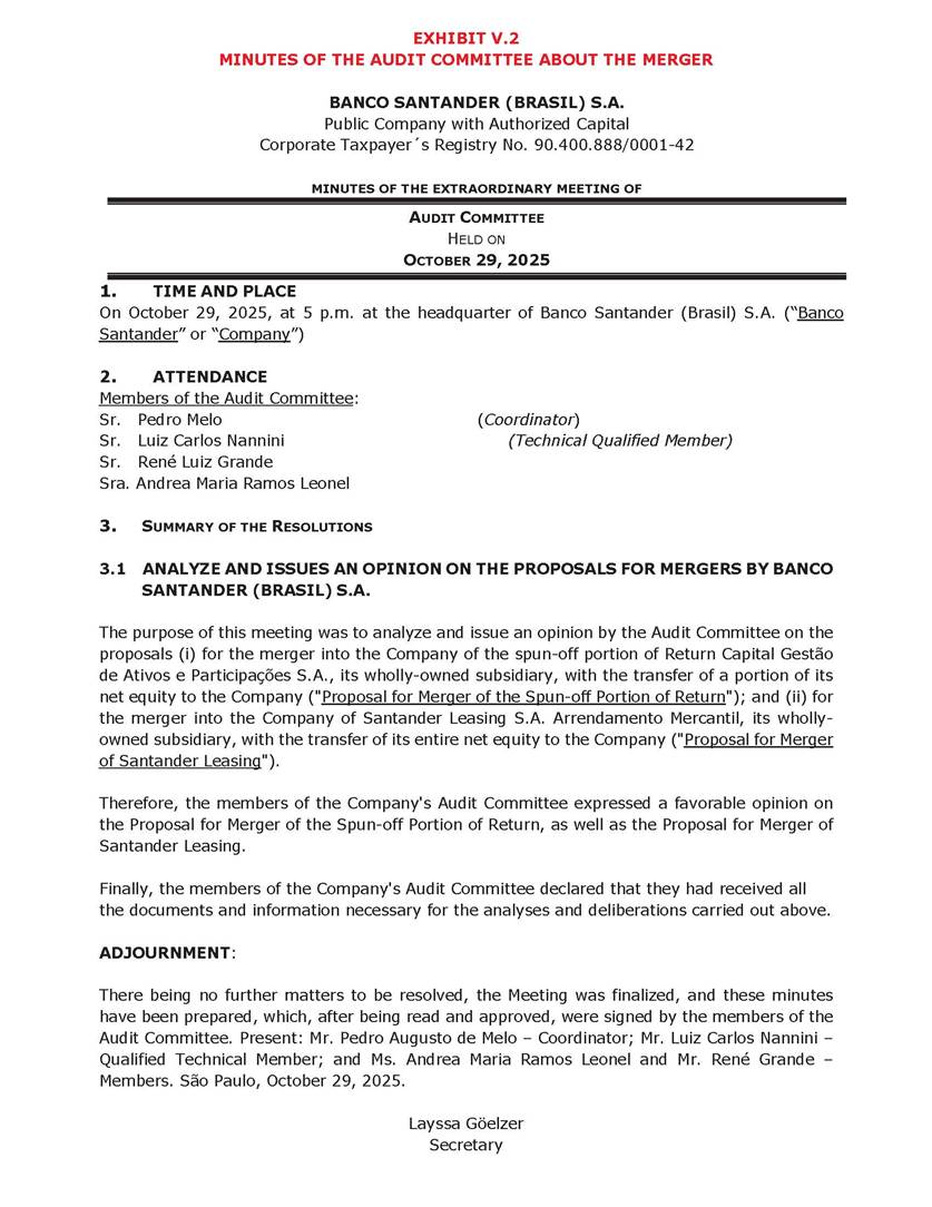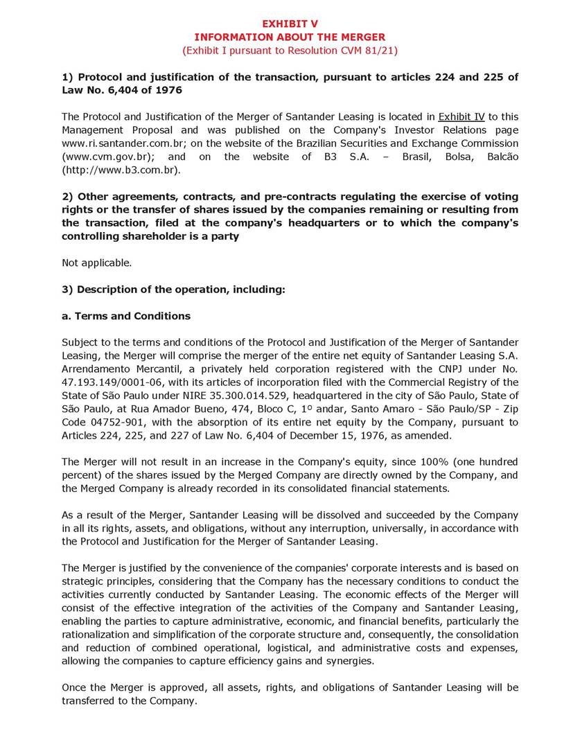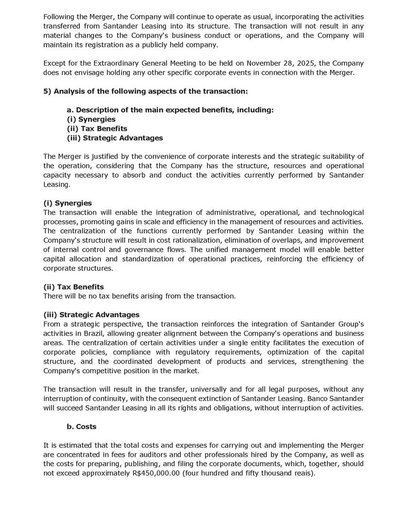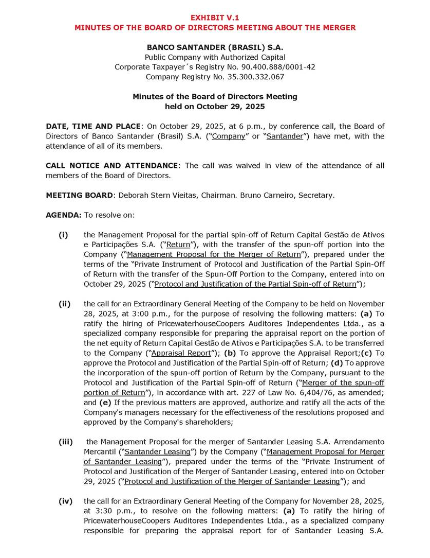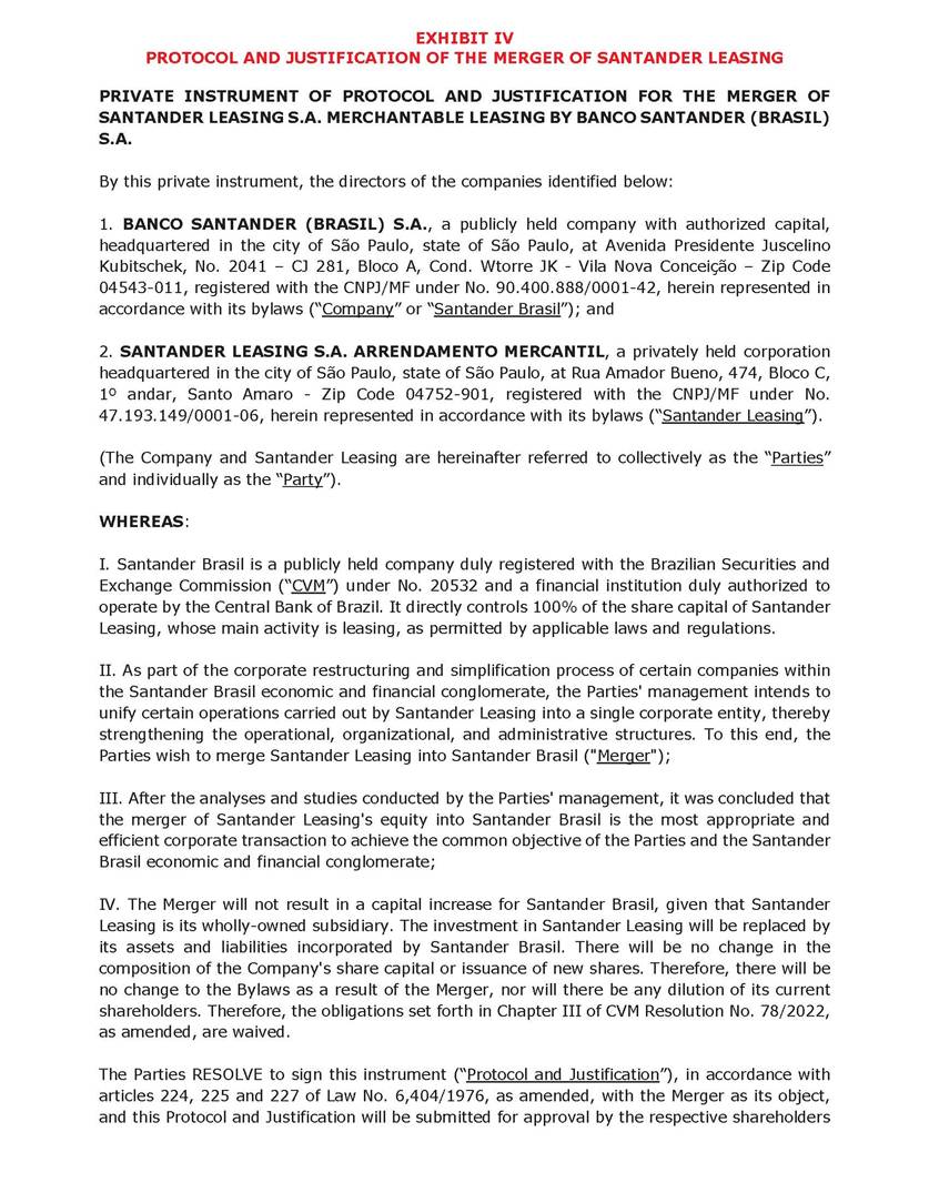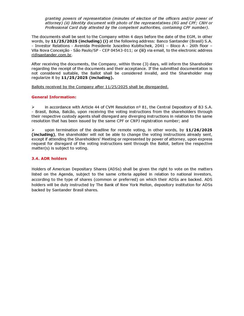 BANCO SANTANDER (BRASIL) S.A. Management Proposal November 28, 2025 – 03:30 PM Extraordinary General Meeting SUMMARY 1. Message from the Board of Directors ......................................... 3 2. Call Notice .................................................................................. 4 3. Shareholder participation in the EGM ......................................... 6 4. Matters to be deliberated at the EGM ....................................... 10 EXHIBIT I: TEMPLATE OF POWER OF ATTORNEY ......................... 12 EXHIBIT II: INFORMATION OF THE APPRAISER ........................... 14 EXHIBIT III: APPRAISAL REPORT ................................................ 16 EXHIBIT IV: PROTOCOL AND JUSTIFICATION OF THE MERGER OF SANTANDER LEASING ............................................... 17 EXHIBIT V: INFORMATION ABOUT THE MERGER .......................... 24 1. Message from the Board of Directors Dear Shareholder, It is with great pleasure that I invite you, Santander Brasil shareholder, to participate in our Extraordinary General Meeting ("EGM"), to be held on November 28, 2025, at 3:30 pm. Besides this Management Proposal (“Proposal”) a Manual for Participation in the EGM (“Manual”) was prepared to assist you in understanding the matters presented, providing a conscious and reasoned decision-making process, anticipating possible clarifications and voting guidelines. Pursuant to the Call Notice made available, we shall take resolutions on the following matters: (a) To ratify the hiring of PricewaterhouseCoopers Auditores Independentes Ltda., as a specialized company responsible for preparing the appraisal report for of Santander Leasing S.A. Arrendamento Mercantil (“Appraisal Report” and “Santander Leasing” respectively); (b) To approve the Appraisal Report; (c) To approve the Private Instrument of Protocol and Justification of the Merger of Santander Leasing, entered into on October 29, 2025 (“Protocol and Justification of the Merger of Santander Leasing”); (d) To approve the merger of Santander Leasing by the Company, under the terms of the Protocol and Justification of the Merger of Santander Leasing, pursuant to the article 227 of the Brazilian Law nº 6.404/76, as amended, (“Merger”); and (e) If the previous matters are approved, authorize and ratify all the acts of the Company's managers necessary for the effectiveness of the resolutions proposed and approved by the Company's shareholders. As established by the Brazilian Securities and Exchange Commission (CVM), in order to facilitate its analysis and evaluation of the matters to be resolved on our EGM, this Proposal includes exhibits containing the information made available in addition to the Call Notice. We are at your disposal to clarify any questions through the emails acionistas@santander.com.br oriented at non-financial individual and corporate investors and ri@santander.com.br for institutional investors. We hope that this Proposal and the Manual fulfills its purpose in assisting your decision making. Your participation is essential for the Company. Best regards Deborah Stern Vieitas Chairman of the Board of Directors 2. Call Notice [to be published in the newspaper "Valor Econômico" in editions of October 30, 31 and November 01, 2025] BANCO SANTANDER (BRASIL) S.A. Publicly-Held Company with Authorized Capital CNPJ/MF 90.400.888/0001-42 - NIRE 35.300.332.067 CALL NOTICE - EXTRAORDINARY GENERAL MEETING - Shareholders are hereby invited to attend the Extraordinary General Meeting ("EGM") to be held on November 28, 2025, at 3:30 p.m., at Banco Santander (Brasil) S.A. (“Santander Brasil” ou “Companhia”)headquarters, located at Avenida Presidente Juscelino Kubitschek nº 2041 – mezzanine, Vila Nova Conceição, São Paulo/SP, to resolve on the following Agenda: (a) To ratify the hiring of PricewaterhouseCoopers Auditores Independentes Ltda., as a specialized company responsible for preparing the appraisal report for of Santander Leasing S.A. Arrendamento Mercantil (“Appraisal Report” and “Santander Leasing” respectively); (b) To approve the Appraisal Report; (c) To approve the Private Instrument of Protocol and Justification of the Merger of Santander Leasing, entered into on October 29, 2025 (“Protocol and Justification of the Merger of Santander Leasing”); (d) To approve the merger of Santander Leasing by the Company, under the terms of the Protocol and Justification of the Merger of Santander Leasing, pursuant to the article 227 of the Brazilian Law nº 6.404/76, as amended, (“Merger”); and (e) If the previous matters are approved, authorize and ratify all the acts of the Company's managers necessary for the effectiveness of the resolutions proposed and approved by the Company's shareholders. Observations for participation and Voting during the Meeting Participation in the Meeting: Shareholders, their legal representatives or attorneys-in-fact may participate in the Meeting in any of the following ways: In person - The shareholders or their legal representatives shall present themselves for the EGM with the appropriate identity documents. In the event of representation of a shareholder by an attorney-in-fact, shareholders shall provide the Company with a power of attorney granted according to the applicable law, to be delivered at the Company's Headquarters, at least seventytwo (72) hours before the EGM is held; Remote Voting Ballot: the Company implemented the remote voting system pursuant to CVM Resolution 81/22, as amended, enabling our Shareholders to send remote voting ballots directly to the Company, to the bookkeeper or through their respective custodian agents, in accordance with the procedures described in the General Meeting Participation Manual. As provided for in Article 5, § 4, of CVM Resolution No. 81/22, with the amendments introduced by CVM Resolutions No. 59/21 and 204/24, the Company understands that holding the EGM in person allows for a 