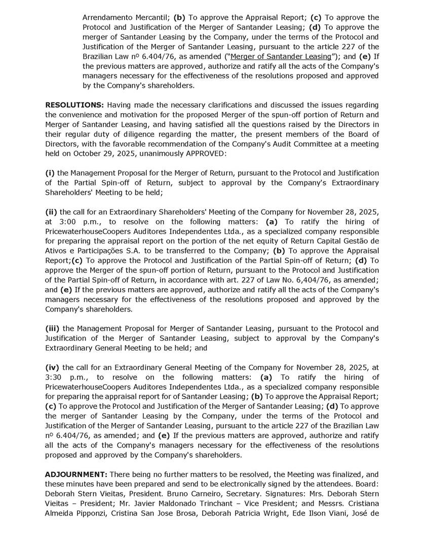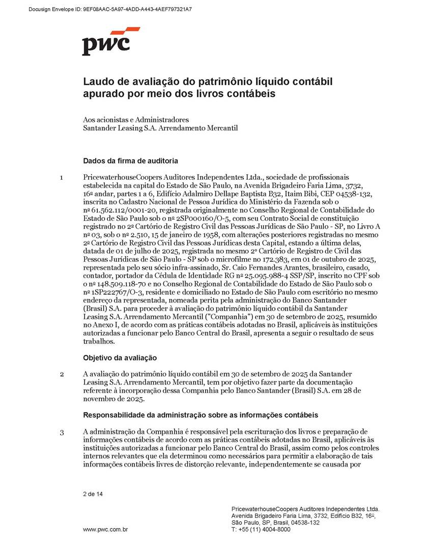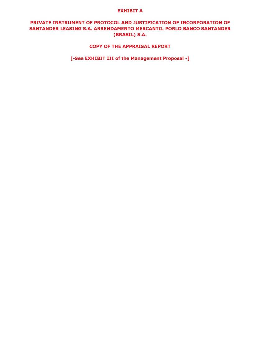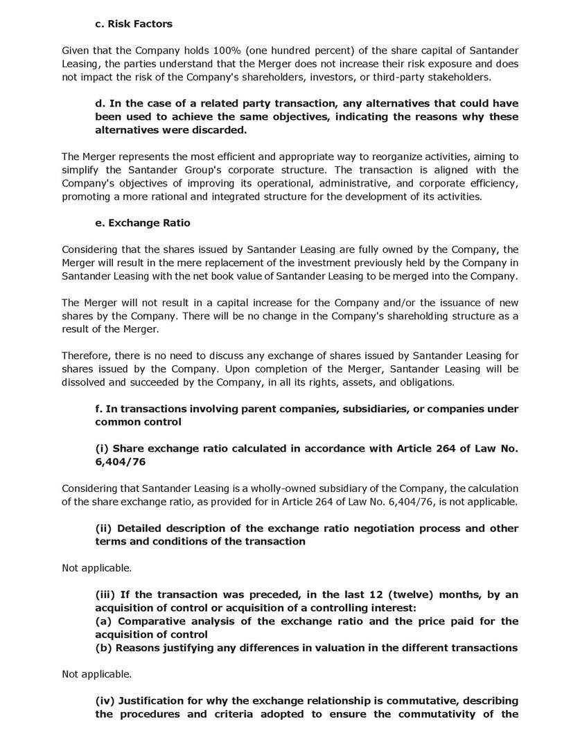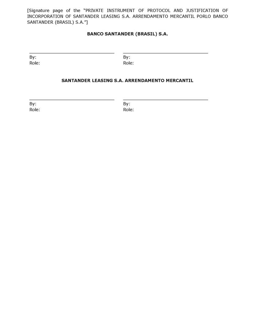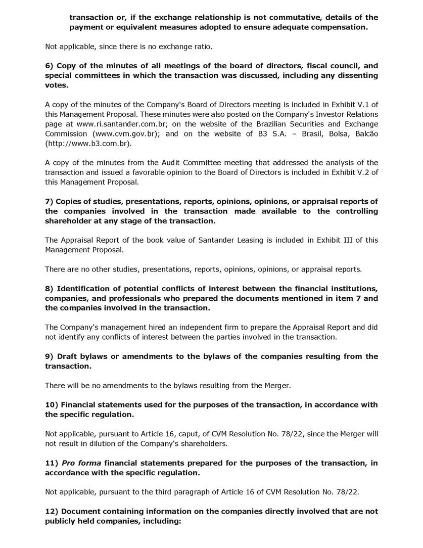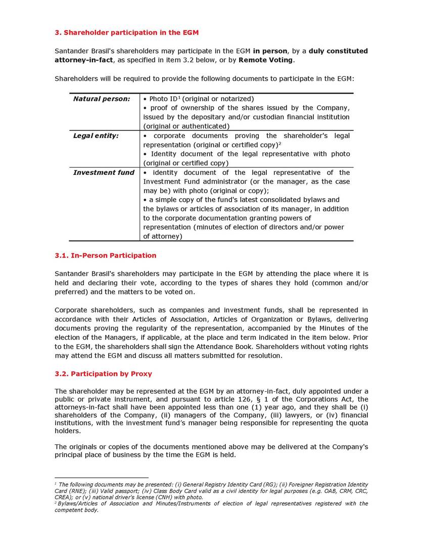 BANCO SANTANDER (BRASIL) S.A. Management Proposal November 28, 2025 – 03:30 PM Extraordinary General Meeting SUMMARY 1. Message from the Board of Directors ......................................... 3 2. Call Notice .................................................................................. 4 3. Shareholder participation in the EGM ......................................... 6 4. Matters to be deliberated at the EGM ....................................... 10 EXHIBIT I: TEMPLATE OF POWER OF ATTORNEY ......................... 12 EXHIBIT II: INFORMATION OF THE APPRAISER ........................... 14 EXHIBIT III: APPRAISAL REPORT ................................................ 16 EXHIBIT IV: PROTOCOL AND JUSTIFICATION OF THE MERGER OF SANTANDER LEASING ............................................... 17 EXHIBIT V: INFORMATION ABOUT THE MERGER .......................... 24 1. Message from the Board of Directors Dear Shareholder, It is with great pleasure that I invite you, Santander Brasil shareholder, to participate in our Extraordinary General Meeting ("EGM"), to be held on November 28, 2025, at 3:30 pm. Besides this Management Proposal (“Proposal”) a Manual for Participation in the EGM (“Manual”) was prepared to assist you in understanding the matters presented, providing a conscious and reasoned decision-making process, anticipating possible clarifications and voting guidelines. Pursuant to the Call Notice made available, we shall take resolutions on the following matters: (a) To ratify the hiring of PricewaterhouseCoopers Auditores Independentes Ltda., as a specialized company responsible for preparing the appraisal report for of Santander Leasing S.A. Arrendamento Mercantil (“Appraisal Report” and “Santander Leasing” respectively); (b) To approve the Appraisal Report; (c) To approve the Private Instrument of Protocol and Justification of the Merger of Santander Leasing, entered into on October 29, 2025 (“Protocol and Justification of the Merger of Santander Leasing”); (d) To approve the merger of Santander Leasing by the Company, under the terms of the Protocol and Justification of the Merger of Santander Leasing, pursuant to the article 227 of the Brazilian Law nº 6.404/76, as amended, (“Merger”); and (e) If the previous matters are approved, authorize and ratify all the acts of the Company's managers necessary for the effectiveness of the resolutions proposed and approved by the Company's shareholders. As established by the Brazilian Securities and Exchange Commission (CVM), in order to facilitate its analysis and evaluation of the matters to be resolved on our EGM, this Proposal includes exhibits containing the information made available in addition to the Call Notice. We are at your disposal to clarify any questions through the emails acionistas@santander.com.br oriented at non-financial individual and corporate investors and ri@santander.com.br for institutional investors. We hope that this Proposal and the Manual fulfills its purpose in assisting your decision making. Your participation is essential for the Company. Best regards Deborah Stern Vieitas Chairman of the Board of Directors 2. Call Notice [to be published in the newspaper "Valor Econômico" in editions of October 30, 31 and November 01, 2025] BANCO SANTANDER (BRASIL) S.A. Publicly-Held Company with Authorized Capital CNPJ/MF 90.400.888/0001-42 - NIRE 35.300.332.067 CALL NOTICE - EXTRAORDINARY GENERAL MEETING - Shareholders are hereby invited to attend the Extraordinary General Meeting ("EGM") to be held on November 28, 2025, at 3:30 p.m., at Banco Santander (Brasil) S.A. (“Santander Brasil” ou “Companhia”)headquarters, located at Avenida Presidente Juscelino Kubitschek nº 2041 – mezzanine, Vila Nova Conceição, São Paulo/SP, to resolve on the following Agenda: (a) To ratify the hiring of PricewaterhouseCoopers Auditores Independentes Ltda., as a specialized company responsible for preparing the appraisal report for of Santander Leasing S.A. Arrendamento Mercantil (“Appraisal Report” and “Santander Leasing” respectively); (b) To approve the Appraisal Report; (c) To approve the Private Instrument of Protocol and Justification of the Merger of Santander Leasing, entered into on October 29, 2025 (“Protocol and Justification of the Merger of Santander Leasing”); (d) To approve the merger of Santander Leasing by the Company, under the terms of the Protocol and Justification of the Merger of Santander Leasing, pursuant to the article 227 of the Brazilian Law nº 6.404/76, as amended, (“Merger”); and (e) If the previous matters are approved, authorize and ratify all the acts of the Company's managers necessary for the effectiveness of the resolutions proposed and approved by the Company's shareholders. Observations for participation and Voting during the Meeting Participation in the Meeting: Shareholders, their legal representatives or attorneys-in-fact may participate in the Meeting in any of the following ways: In person - The shareholders or their legal representatives shall present themselves for the EGM with the appropriate identity documents. In the event of representation of a shareholder by an attorney-in-fact, shareholders shall provide the Company with a power of attorney granted according to the applicable law, to be delivered at the Company's Headquarters, at least seventytwo (72) hours before the EGM is held; Remote Voting Ballot: the Company implemented the remote voting system pursuant to CVM Resolution 81/22, as amended, enabling our Shareholders to send remote voting ballots directly to the Company, to the bookkeeper or through their respective custodian agents, in accordance with the procedures described in the General Meeting Participation Manual. As provided for in Article 5, § 4, of CVM Resolution No. 81/22, with the amendments introduced by CVM Resolutions No. 59/21 and 204/24, the Company understands that holding the EGM in person allows for a 