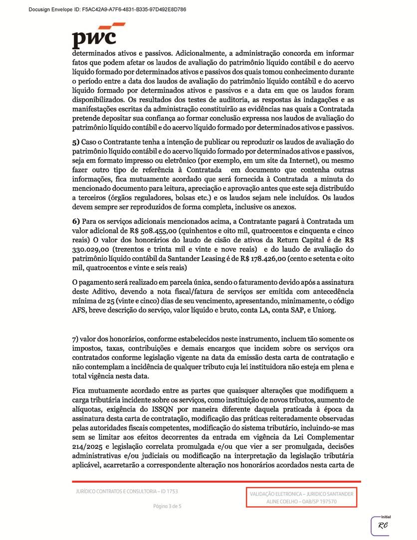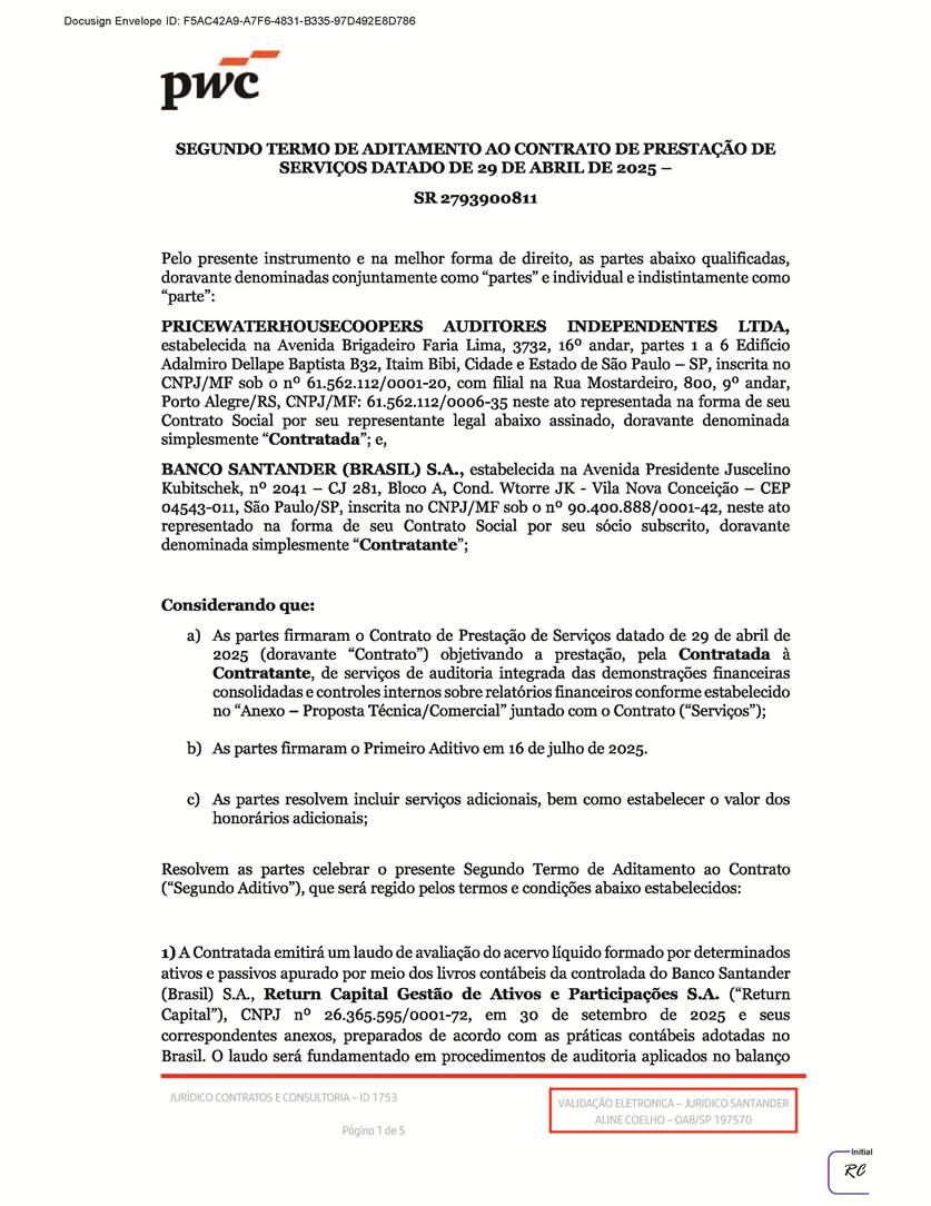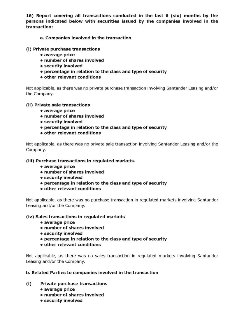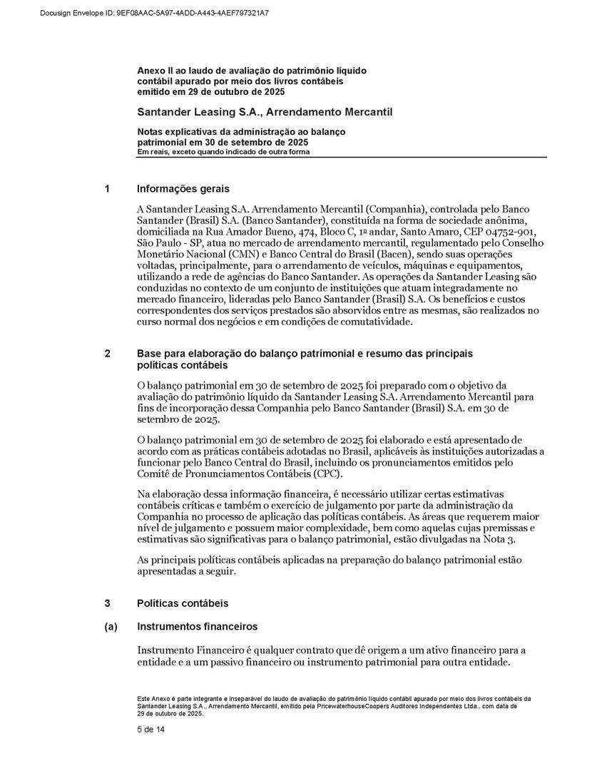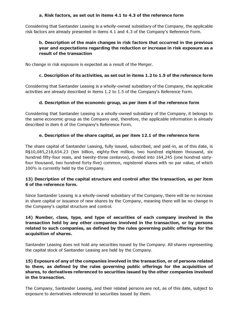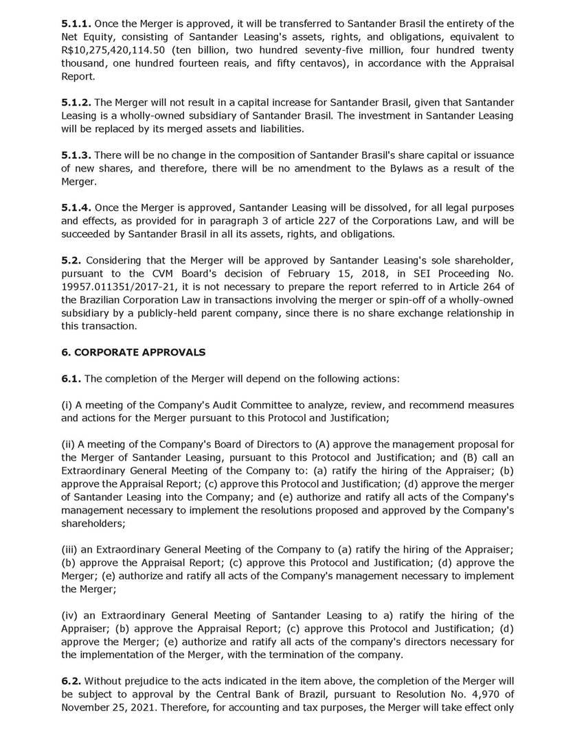 BANCO SANTANDER (BRASIL) S.A. Management Proposal November 28, 2025 – 03:30 PM Extraordinary General Meeting SUMMARY 1. Message from the Board of Directors ......................................... 3 2. Call Notice .................................................................................. 4 3. Shareholder participation in the EGM ......................................... 6 4. Matters to be deliberated at the EGM ....................................... 10 EXHIBIT I: TEMPLATE OF POWER OF ATTORNEY ......................... 12 EXHIBIT II: INFORMATION OF THE APPRAISER ........................... 14 EXHIBIT III: APPRAISAL REPORT ................................................ 16 EXHIBIT IV: PROTOCOL AND JUSTIFICATION OF THE MERGER OF SANTANDER LEASING ............................................... 17 EXHIBIT V: INFORMATION ABOUT THE MERGER .......................... 24 1. Message from the Board of Directors Dear Shareholder, It is with great pleasure that I invite you, Santander Brasil shareholder, to participate in our Extraordinary General Meeting ("EGM"), to be held on November 28, 2025, at 3:30 pm. Besides this Management Proposal (“Proposal”) a Manual for Participation in the EGM (“Manual”) was prepared to assist you in understanding the matters presented, providing a conscious and reasoned decision-making process, anticipating possible clarifications and voting guidelines. Pursuant to the Call Notice made available, we shall take resolutions on the following matters: (a) To ratify the hiring of PricewaterhouseCoopers Auditores Independentes Ltda., as a specialized company responsible for preparing the appraisal report for of Santander Leasing S.A. Arrendamento Mercantil (“Appraisal Report” and “Santander Leasing” respectively); (b) To approve the Appraisal Report; (c) To approve the Private Instrument of Protocol and Justification of the Merger of Santander Leasing, entered into on October 29, 2025 (“Protocol and Justification of the Merger of Santander Leasing”); (d) To approve the merger of Santander Leasing by the Company, under the terms of the Protocol and Justification of the Merger of Santander Leasing, pursuant to the article 227 of the Brazilian Law nº 6.404/76, as amended, (“Merger”); and (e) If the previous matters are approved, authorize and ratify all the acts of the Company's managers necessary for the effectiveness of the resolutions proposed and approved by the Company's shareholders. As established by the Brazilian Securities and Exchange Commission (CVM), in order to facilitate its analysis and evaluation of the matters to be resolved on our EGM, this Proposal includes exhibits containing the information made available in addition to the Call Notice. We are at your disposal to clarify any questions through the emails acionistas@santander.com.br oriented at non-financial individual and corporate investors and ri@santander.com.br for institutional investors. We hope that this Proposal and the Manual fulfills its purpose in assisting your decision making. Your participation is essential for the Company. Best regards Deborah Stern Vieitas Chairman of the Board of Directors 2. Call Notice [to be published in the newspaper "Valor Econômico" in editions of October 30, 31 and November 01, 2025] BANCO SANTANDER (BRASIL) S.A. Publicly-Held Company with Authorized Capital CNPJ/MF 90.400.888/0001-42 - NIRE 35.300.332.067 CALL NOTICE - EXTRAORDINARY GENERAL MEETING - Shareholders are hereby invited to attend the Extraordinary General Meeting ("EGM") to be held on November 28, 2025, at 3:30 p.m., at Banco Santander (Brasil) S.A. (“Santander Brasil” ou “Companhia”)headquarters, located at Avenida Presidente Juscelino Kubitschek nº 2041 – mezzanine, Vila Nova Conceição, São Paulo/SP, to resolve on the following Agenda: (a) To ratify the hiring of PricewaterhouseCoopers Auditores Independentes Ltda., as a specialized company responsible for preparing the appraisal report for of Santander Leasing S.A. Arrendamento Mercantil (“Appraisal Report” and “Santander Leasing” respectively); (b) To approve the Appraisal Report; (c) To approve the Private Instrument of Protocol and Justification of the Merger of Santander Leasing, entered into on October 29, 2025 (“Protocol and Justification of the Merger of Santander Leasing”); (d) To approve the merger of Santander Leasing by the Company, under the terms of the Protocol and Justification of the Merger of Santander Leasing, pursuant to the article 227 of the Brazilian Law nº 6.404/76, as amended, (“Merger”); and (e) If the previous matters are approved, authorize and ratify all the acts of the Company's managers necessary for the effectiveness of the resolutions proposed and approved by the Company's shareholders. Observations for participation and Voting during the Meeting Participation in the Meeting: Shareholders, their legal representatives or attorneys-in-fact may participate in the Meeting in any of the following ways: In person - The shareholders or their legal representatives shall present themselves for the EGM with the appropriate identity documents. In the event of representation of a shareholder by an attorney-in-fact, shareholders shall provide the Company with a power of attorney granted according to the applicable law, to be delivered at the Company's Headquarters, at least seventytwo (72) hours before the EGM is held; Remote Voting Ballot: the Company implemented the remote voting system pursuant to CVM Resolution 81/22, as amended, enabling our Shareholders to send remote voting ballots directly to the Company, to the bookkeeper or through their respective custodian agents, in accordance with the procedures described in the General Meeting Participation Manual. As provided for in Article 5, § 4, of CVM Resolution No. 81/22, with the amendments introduced by CVM Resolutions No. 59/21 and 204/24, the Company understands that holding the EGM in person allows for a 