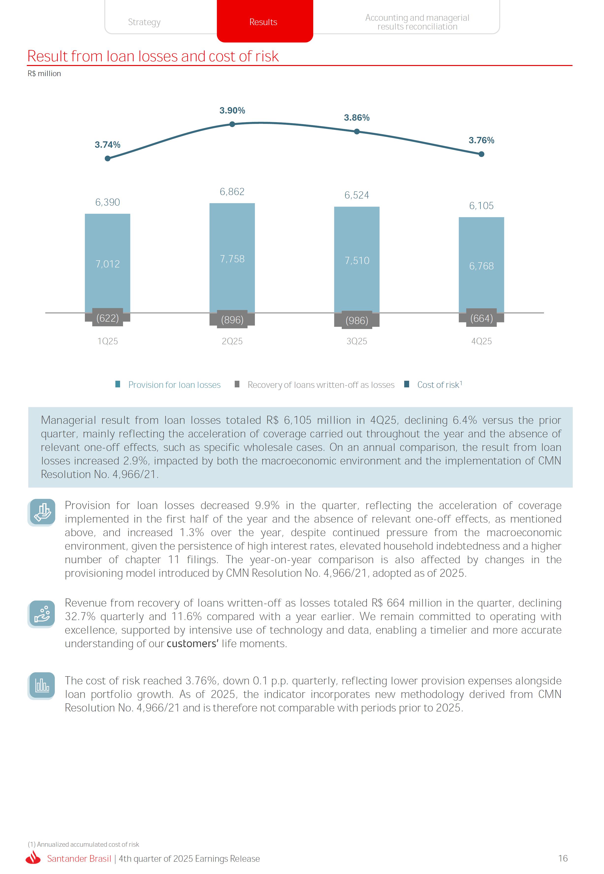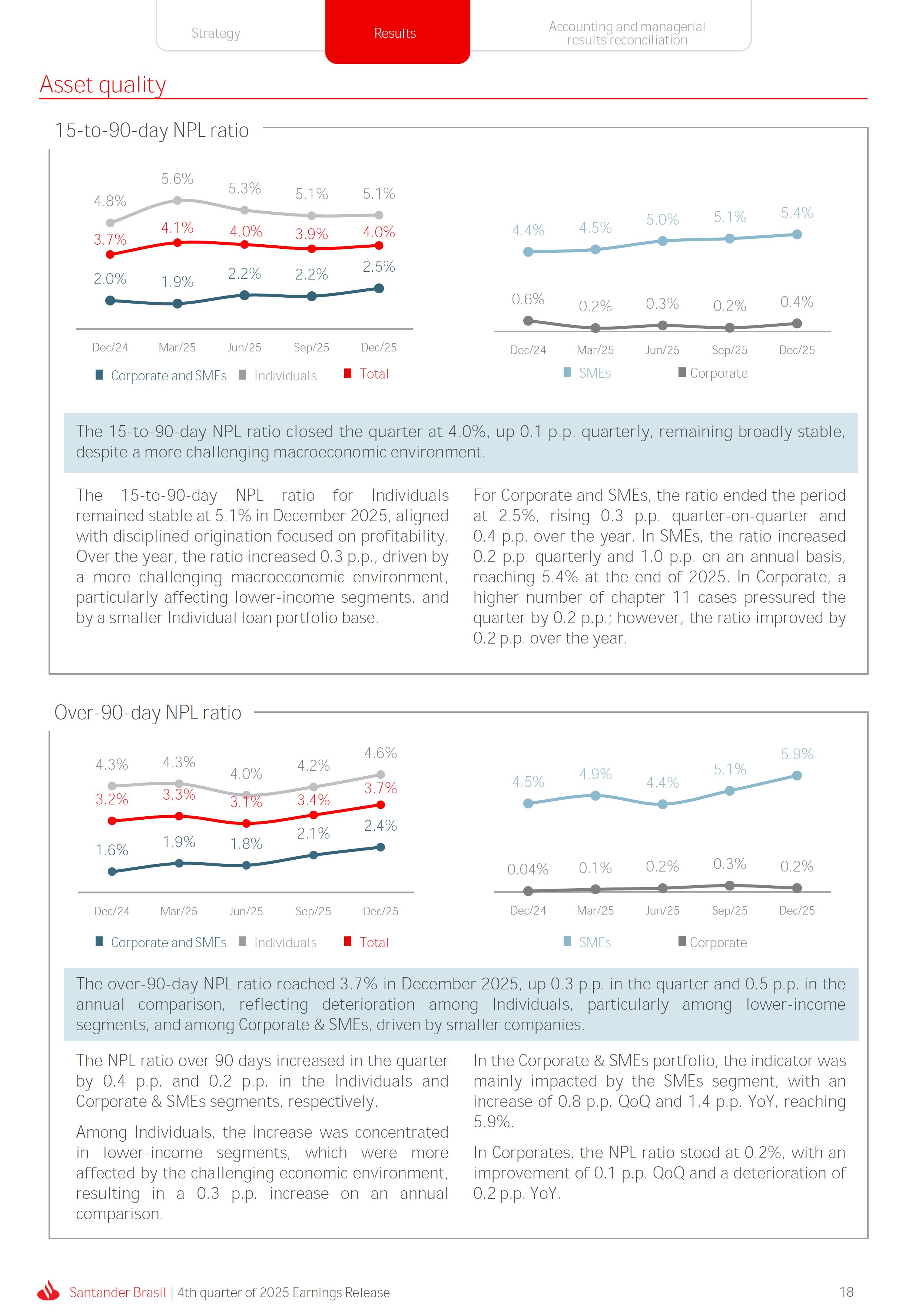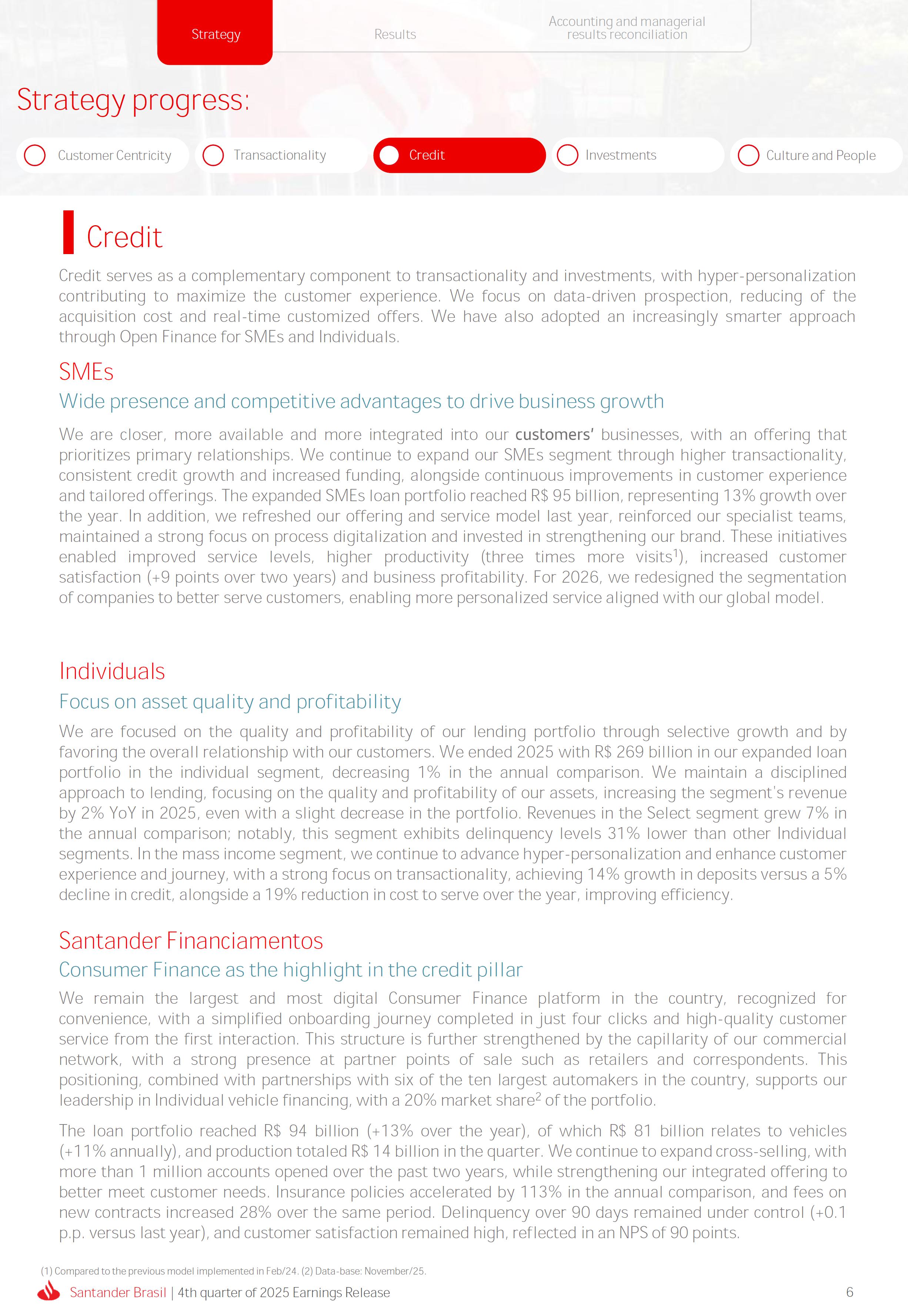Earnings Release 4th quarter of 2025 (BRGAAP) www.santander.com.br/ri/en/ www.santander.com.br/ri/en/ Strategy highlights 3 Strategy progress 4 Customer centricity 4 Transactionality 5 Credit 6 Investments 7 Culture and People 8 Performance analysis 10 Executive summary 11 Income Statement and Balance Sheet Analysis 12 Managerial income statement 12 Net interest income 13 Fees 14 Result from loan losses 16 NPL Formation, write-off and renegotiated loan portfolio 17 Asset quality 18 Expenses 19 Other Operating Income and Expenses 20 Balance sheet 20 Loan portfolio 21 Funding 24 Capital 24 Reconciliation of accounting and managerial results 25 Fourth quarter 2025 Index 2 Santander Brasil | 4th quarter of 2025 Earnings Release Financial Highlights | 4Q25 Earnings Release of the 4thquarter of 2025 (BRGAAP) MARIO LEÃO CEO OF SANTANDER BRASIL Expanded Loan Portfolio R$ 708.2 billion (+2.8% QoQ and +3.7% YoY) Selective and balanced asset growth Expenses Disciplined cost management, with seasonal quarterly growth Cost of risk Stable, but still pressured by the macroeconomic environment Net Profit Net Interest Income R$ 15.3 billion (+0.8% QoQ and -4.0% YoY) Fees R$ 5.8billion(+3.6%QoQand+4.3%YoY) Diversified growth, representing key expansion pillar Client NII delivering solid performance and market NII had losses, as expected R$6.6billion(+3.3%QoQand-2.0%YoY) 3.76% (-0.1 p.p. QoQand+0.3 p.p. YoY) (+1.9% QoQ and +6.0% YoY) Funding from clients Evolution in the funding mix, with a focus on Individuals R$ 670.4billion(+1.7%QoQand+3.9%YoY) WeclosedthequarterwithanetprofitofR$4.1billion,thehighestquarterlyprofitinthepastfouryears,andareturnonequityof17.6%,inlinewith3Q25.Theseresultsreflecttheconsistencyofourstrategicexecutionandreinforceourambitiontobetheleadingfinancialplatforminourcustomers’lives,thebankeachcustomerchooseseveryday,thatsupportsclientsattheirbeginnings,the#ComeçaAgorabank,andthattreatseverycustomerasaprimaryanduniqueclient.Wecontinuetomakesteadyprogressinbuildinganincreasinglydiversified,resilientandprofitableoperation,wellpositionedtogrowsustainablyovertime. In4Q25,wemaintainedstrictdisciplineincapitalallocation,withselectiveandbalancedgrowthacrossourassets.Ontheliabilityside,wecontinuedtodiversifyourfundingmix,reducingfundingcoststhroughahigherIndividualsshareinthefundingmix.Assetqualityremainspressuredbythemacroeconomicenvironment;however,wecontinuetooperatewithprudence,disciplineandactiveriskmanagement.Intermsofefficiency,weremaincommittedtorigorouscostmanagementwhich,combinedwiththeintensiveuseoftechnology,hasallowedustoincreaseproductivityandcapturestructuralgains. Weremainrelentlesslyfocusedonexcellenceincustomerservice,experienceandjourney,acentralpillarofourstrategy,offeringsolutionsthatarerelevanttoeachbusinesscontextandeachlifemoment.Leveragingthestrengthofourintegratedchannelsandtheintensiveuseofartificialintelligence,dataandanalytics,wehaveexpandedourabilitytounderstandandengagewitheachcustomerinanincreasinglypersonalizedway.Thisyear,wehighlightthelaunchofOneApp,amulti-banksolutionbuiltoncustomerfeedback,deliveringasimple,intuitiveandeffectiveexperience.Wehavealsocontinuedtotransformthepaymentsjourney,unifyingtransfersandpaymentsinasingleenvironment,bringinggreaterfluidityandconvenience. Wemadefurtherprogressacrossourstrategicbusinesses,(i)inConsumerFinance,wecontinuedtostrengthenacomprehensiveecosystem,deliveringsolutionsthatgenerateincreasingvalueforcustomers,expandingcross-sellingandacceleratingfeegeneration,supportedbyhighsatisfactionlevels;(ii)inSMEs,wereaffirmedourcommitmenttobeingclosetoourcustomers,movingbeyondthebanktobepresentintheirbusinesses,withcomprehensiveandpersonalizedsolutionsthatprioritizetheprimaryrelationship,translatingintohighertransactionality,productivityandprofitability;and(iii)ininvestments,TorobecameSantanderCorretorathisquarter,reinforcingourpositioningandourinvestmentecosystem. Additionally,wecontinuedtoadvanceourglobalplatformagendainclosecollaborationwiththeGroup,combiningexpertise,strategyandinvestmentstodeliversimpler,moreefficientandagilesolutionstobetterservethosewhomatterthemost:ourcustomers. Weenter2026evenbetterpreparedtomeetourcustomers’needswithexcellenceandinnovation.WeremainonapathofconsistentROAEevolution,withastrongfocusonresultsanddisciplinedmanagement,guidedbydisciplinedcapitalallocation,ourstrategicpillarsandcontinuoustransformationalongsideourcustomers,employees,shareholdersandsociety. R$ 4.1billion ROAE 17.6% (Stable QoQ and -0.1 p.p. YoY) Santander Brasil | 4th quarter of 2025 Earnings Release 3 Wecontinuouslyseektoenhanceourcustomerofferingandservicemodel,combininghumaninteractionwithdigitalchannelstodeliverthebestexperienceacrossalltouchpointswiththebank.Indigitalchannels,wecontinuetoadvancetechnologically,offeringincreasinglysimpleandcomprehensivejourneys. Inassistedchannels,encompassingbothphysicalbranchesandremoteservice,ourservicemodelpositionsthebranchasaconveniencechannelandanintegralpartofourcomprehensivemultichanneloffering. Wearefocusonhyper-personalization,with60%ofIndividualsinteractionsbasedoncustomerbehaviorandlifemoment,drivinghigherengagementandconversion. OureffortsarereflectedinrisingcustomersatisfactionoverthepasttwoyearsacrossbothIndividualandCompaniessegments,reinforcingourcommitmenttodeliveringsolutionsthatmeetcustomerneedswithexcellenceinserviceandexperience. Integrated customer perspective Obsession with a complete customer experience 4 Weremainfocusedonbeingthemostpresentbankinourcustomers’lives.Ourcustomer-centricstrategytranslatesintosustainablegrowthofourcustomerbase,particularlyamongprimaryrelationshipclients,highersatisfactionlevels,asmeasuredbyNPS,andimprovedprofitability.Weexpandedourcustomerbaseby6%overtwelvemonths,reaching73.9millionclients. Theevolutionofourbusinessmodel,supportedbytheintensiveuseoftechnologytoservecustomerswhere,howandwhentheychoose,hasenabledcontinuousimprovementofthecustomerjourney,withproductofferingsbetteralignedwithindividualprofilesandaclearfocusonprima