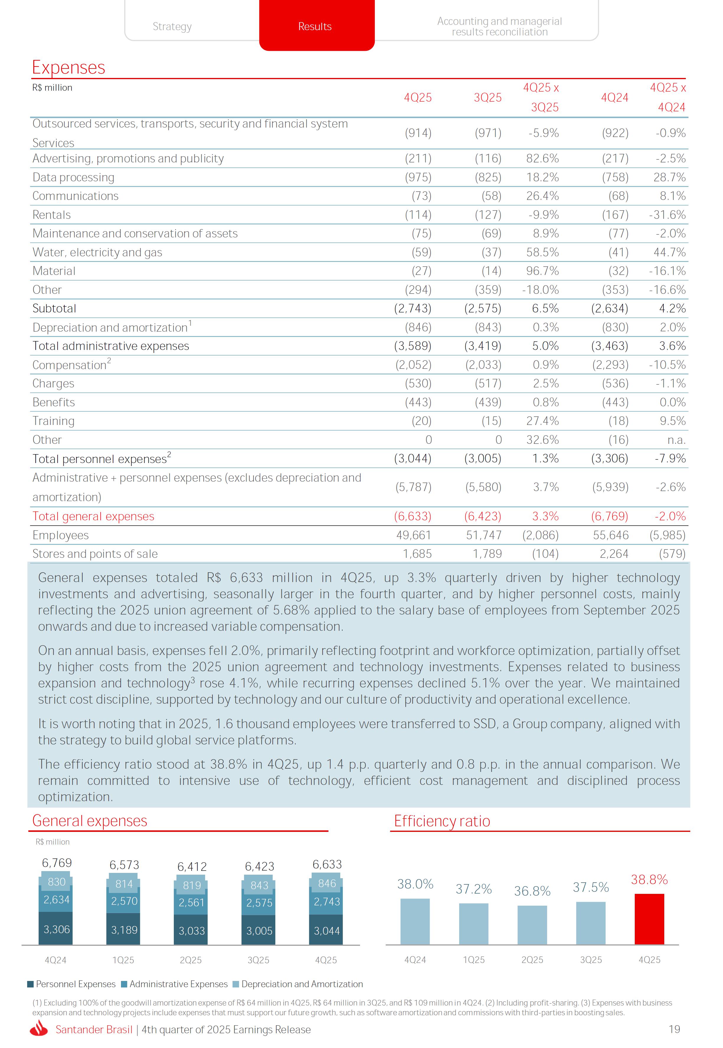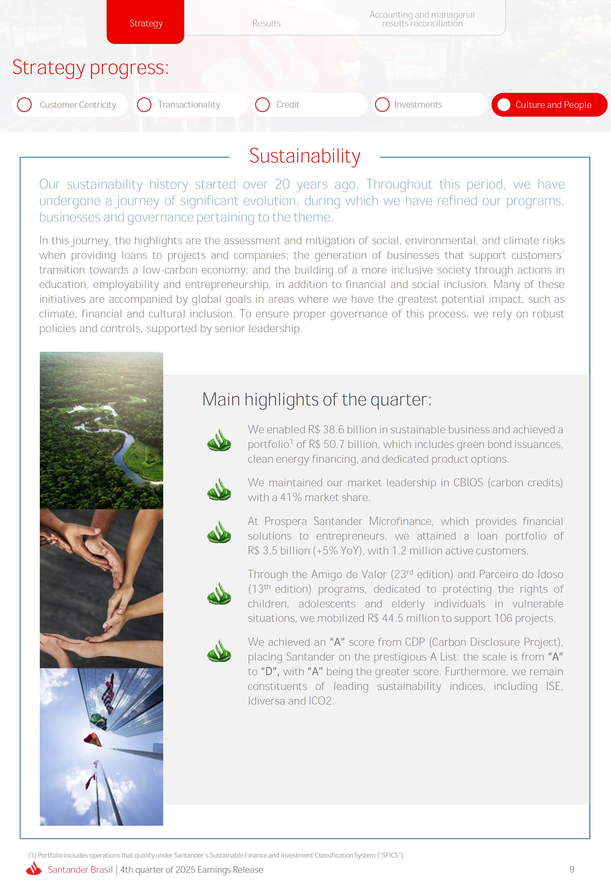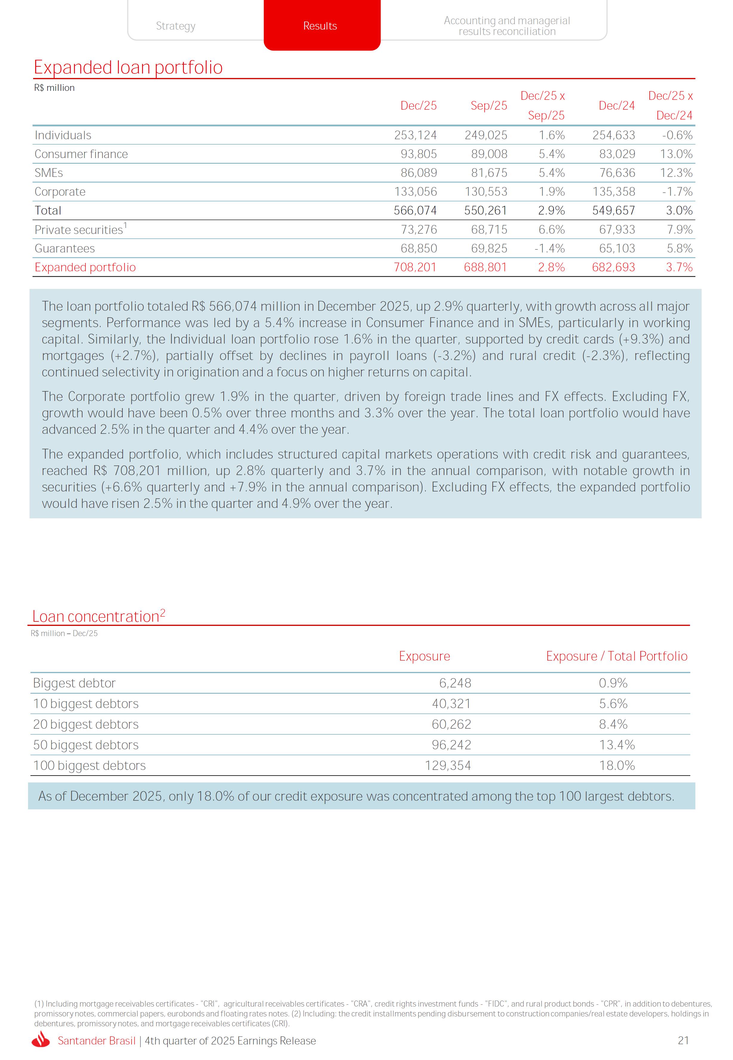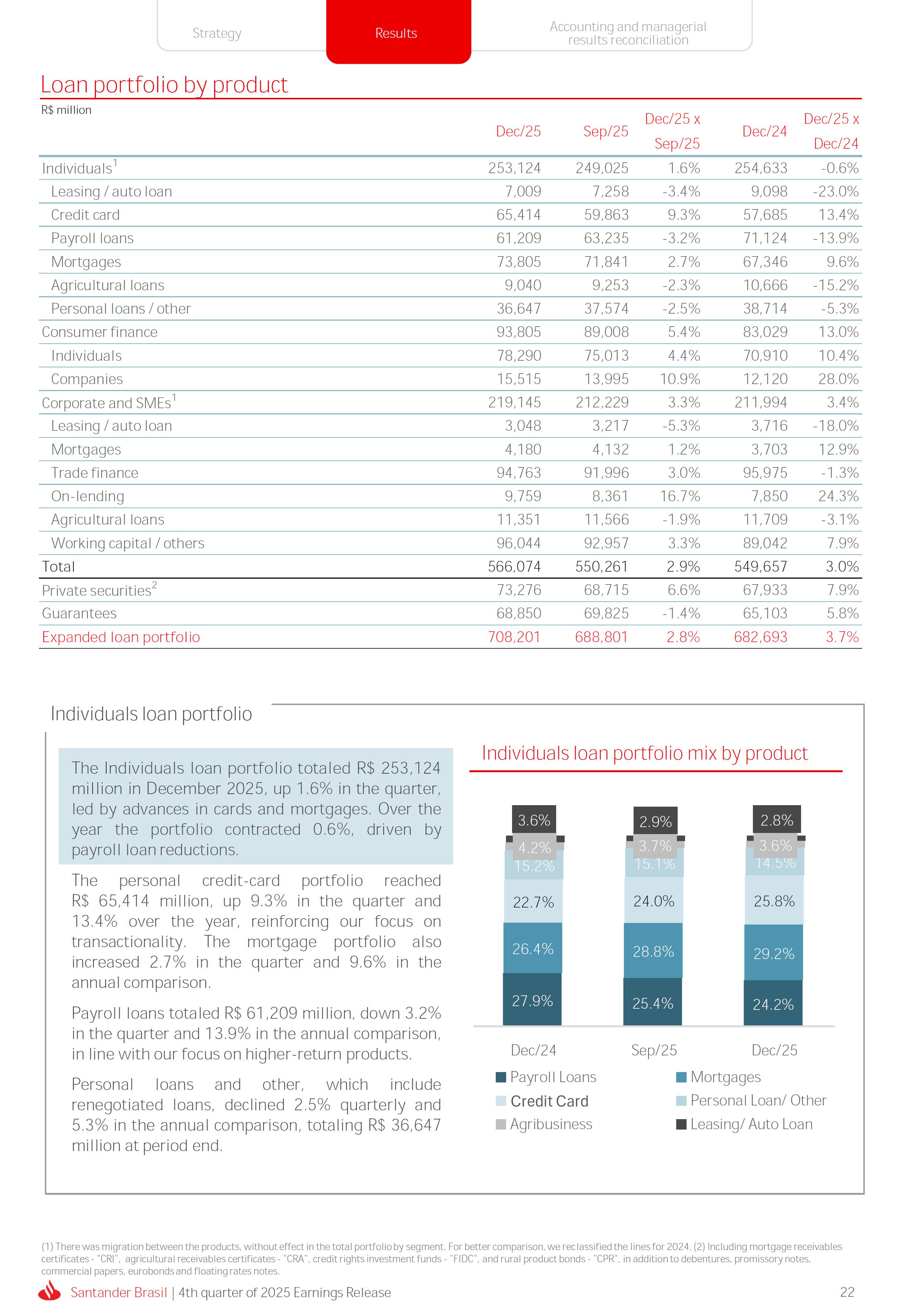 Earnings Release 4th quarter of 2025 (BRGAAP) www.santander.com.br/ri/en/ www.santander.com.br/ri/en/ Strategy highlights 3 Strategy progress 4 Customer centricity 4 Transactionality 5 Credit 6 Investments 7 Culture and People 8 Performance analysis 10 Executive summary 11 Income Statement and Balance Sheet Analysis 12 Managerial income statement 12 Net interest income 13 Fees 14 Result from loan losses 16 NPL Formation, write-off and renegotiated loan portfolio 17 Asset quality 18 Expenses 19 Other Operating Income and Expenses 20 Balance sheet 20 Loan portfolio 21 Funding 24 Capital 24 Reconciliation of accounting and managerial results 25 Fourth quarter 2025 Index 2 Santander Brasil | 4th quarter of 2025 Earnings Release Financial Highlights | 4Q25 Earnings Release of the 4thquarter of 2025 (BRGAAP) MARIO LEÃO CEO OF SANTANDER BRASIL Expanded Loan Portfolio R$ 708.2 billion (+2.8% QoQ and +3.7% YoY) Selective and balanced asset growth Expenses Disciplined cost management, with seasonal quarterly growth Cost of risk Stable, but still pressured by the macroeconomic environment Net Profit Net Interest Income R$ 15.3 billion (+0.8% QoQ and -4.0% YoY) Fees R$ 5.8billion(+3.6%QoQand+4.3%YoY) Diversified growth, representing key expansion pillar Client NII delivering solid performance and market NII had losses, as expected R$6.6billion(+3.3%QoQand-2.0%YoY) 3.76% (-0.1 p.p. QoQand+0.3 p.p. YoY) (+1.9% QoQ and +6.0% YoY) Funding from clients Evolution in the funding mix, with a focus on Individuals R$ 670.4billion(+1.7%QoQand+3.9%YoY) WeclosedthequarterwithanetprofitofR$4.1billion,thehighestquarterlyprofitinthepastfouryears,andareturnonequityof17.6%,inlinewith3Q25.Theseresultsreflecttheconsistencyofourstrategicexecutionandreinforceourambitiontobetheleadingfinancialplatforminourcustomers’lives,thebankeachcustomerchooseseveryday,thatsupportsclientsattheirbeginnings,the#ComeçaAgorabank,andthattreatseverycustomerasaprimaryanduniqueclient.Wecontinuetomakesteadyprogressinbuildinganincreasinglydiversified,resilientandprofitableoperation,wellpositionedtogrowsustainablyovertime. In4Q25,wemaintainedstrictdisciplineincapitalallocation,withselectiveandbalancedgrowthacrossourassets.Ontheliabilityside,wecontinuedtodiversifyourfundingmix,reducingfundingcoststhroughahigherIndividualsshareinthefundingmix.Assetqualityremainspressuredbythemacroeconomicenvironment;however,wecontinuetooperatewithprudence,disciplineandactiveriskmanagement.Intermsofefficiency,weremaincommittedtorigorouscostmanagementwhich,combinedwiththeintensiveuseoftechnology,hasallowedustoincreaseproductivityandcapturestructuralgains. Weremainrelentlesslyfocusedonexcellenceincustomerservice,experienceandjourney,acentralpillarofourstrategy,offeringsolutionsthatarerelevanttoeachbusinesscontextandeachlifemoment.Leveragingthestrengthofourintegratedchannelsandtheintensiveuseofartificialintelligence,dataandanalytics,wehaveexpandedourabilitytounderstandandengagewitheachcustomerinanincreasinglypersonalizedway.Thisyear,wehighlightthelaunchofOneApp,amulti-banksolutionbuiltoncustomerfeedback,deliveringasimple,intuitiveandeffectiveexperience.Wehavealsocontinuedtotransformthepaymentsjourney,unifyingtransfersandpaymentsinasingleenvironment,bringinggreaterfluidityandconvenience. Wemadefurtherprogressacrossourstrategicbusinesses,(i)inConsumerFinance,wecontinuedtostrengthenacomprehensiveecosystem,deliveringsolutionsthatgenerateincreasingvalueforcustomers,expandingcross-sellingandacceleratingfeegeneration,supportedbyhighsatisfactionlevels;(ii)inSMEs,wereaffirmedourcommitmenttobeingclosetoourcustomers,movingbeyondthebanktobepresentintheirbusinesses,withcomprehensiveandpersonalizedsolutionsthatprioritizetheprimaryrelationship,translatingintohighertransactionality,productivityandprofitability;and(iii)ininvestments,TorobecameSantanderCorretorathisquarter,reinforcingourpositioningandourinvestmentecosystem. Additionally,wecontinuedtoadvanceourglobalplatformagendainclosecollaborationwiththeGroup,combiningexpertise,strategyandinvestmentstodeliversimpler,moreefficientandagilesolutionstobetterservethosewhomatterthemost:ourcustomers. Weenter2026evenbetterpreparedtomeetourcustomers’needswithexcellenceandinnovation.WeremainonapathofconsistentROAEevolution,withastrongfocusonresultsanddisciplinedmanagement,guidedbydisciplinedcapitalallocation,ourstrategicpillarsandcontinuoustransformationalongsideourcustomers,employees,shareholdersandsociety. R$ 4.1billion ROAE 17.6% (Stable QoQ and -0.1 p.p. YoY) Santander Brasil | 4th quarter of 2025 Earnings Release 3 Wecontinuouslyseektoenhanceourcustomerofferingandservicemodel,combininghumaninteractionwithdigitalchannelstodeliverthebestexperienceacrossalltouchpointswiththebank.Indigitalchannels,wecontinuetoadvancetechnologically,offeringincreasinglysimpleandcomprehensivejourneys. Inassistedchannels,encompassingbothphysicalbranchesandremoteservice,ourservicemodelpositionsthebranchasaconveniencechannelandanintegralpartofourcomprehensivemultichanneloffering. Wearefocusonhyper-personalization,with60%ofIndividualsinteractionsbasedoncustomerbehaviorandlifemoment,drivinghigherengagementandconversion. OureffortsarereflectedinrisingcustomersatisfactionoverthepasttwoyearsacrossbothIndividualandCompaniessegments,reinforcingourcommitmenttodeliveringsolutionsthatmeetcustomerneedswithexcellenceinserviceandexperience. Integrated customer perspective Obsession with a complete customer experience 4 Weremainfocusedonbeingthemostpresentbankinourcustomers’lives.Ourcustomer-centricstrategytranslatesintosustainablegrowthofourcustomerbase,particularlyamongprimaryrelationshipclients,highersatisfactionlevels,asmeasuredbyNPS,andimprovedprofitability.Weexpandedourcustomerbaseby6%overtwelvemonths,reaching73.9millionclients. Theevolutionofourbusinessmodel,supportedbytheintensiveuseoftechnologytoservecustomerswhere,howandwhentheychoose,hasenabledcontinuousimprovementofthecustomerjourney,withproductofferingsbetteralignedwithindividualprofilesandaclearfocusonprima