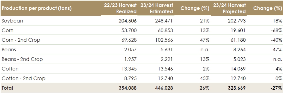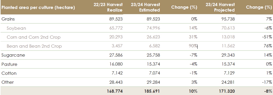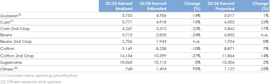 BrasilAgro – Companhia Brasileira de Propriedades Agrícolas (B3: AGRO3) (NYSE: LND), leader in Brazil in the acquisition, development and sale of rural properties with high potential for appreciation, informs its shareholders and the market in general its estimates and updates of the agricultural operations for the 2023/2024 harvest year.