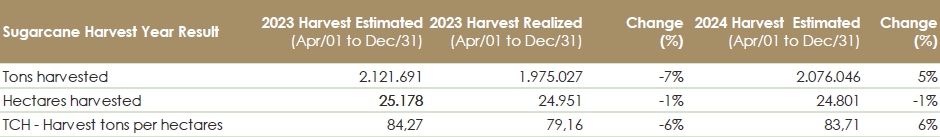 In December, we concluded the sugarcane harvest season, with 2.0 million tons of sugarcane harvested, recording a TCH of 79.16. For the 2024 harvest season, we estimate to produce 2.0 million tons with a TCH of 83.7.