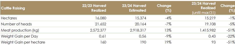 Due to lack of rainfall between October and December in Brazil and the recurring lack of rainfall in Paraguay, pasture availability decreased. As a result, we estimate a decrease of approximately 30% in meat production compared to initial estimates.