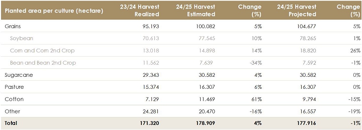 Due to the weather conditions in Mato Grosso, with the delay of rainfall within the ideal planting window, the Company reduced by 1,600 hectares its cotton area, switching it to soybean crops. Despite this adjustment, total planted area increased 3% compared to the previous crop year, with a 1% deviation from the initial estimate.
