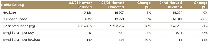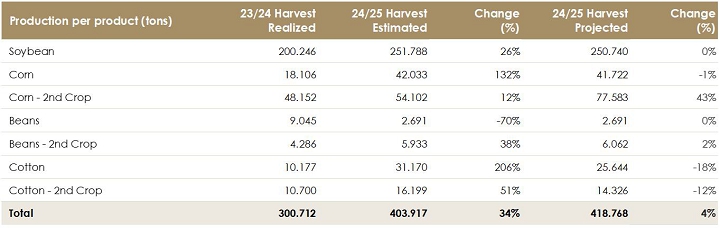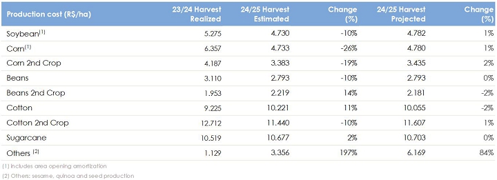 The revision of the crop mix will result in an increase of 4% in total grain and cotton production, driven by the growth of 39% in the estimated production of second-crop corn in relation to the initial projection. This change reflect the optimization of the planted area, aiming to maximize the profitability of agricultural production.