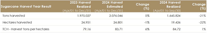 By September 30, 2024, we harvested 1,600,000 tons of sugarcane, corresponding to 84.72 tons of cane per hectare (TCH). By the end of the harvest in December, we should deliver a total of 2.0 million tons, in line with estimates.