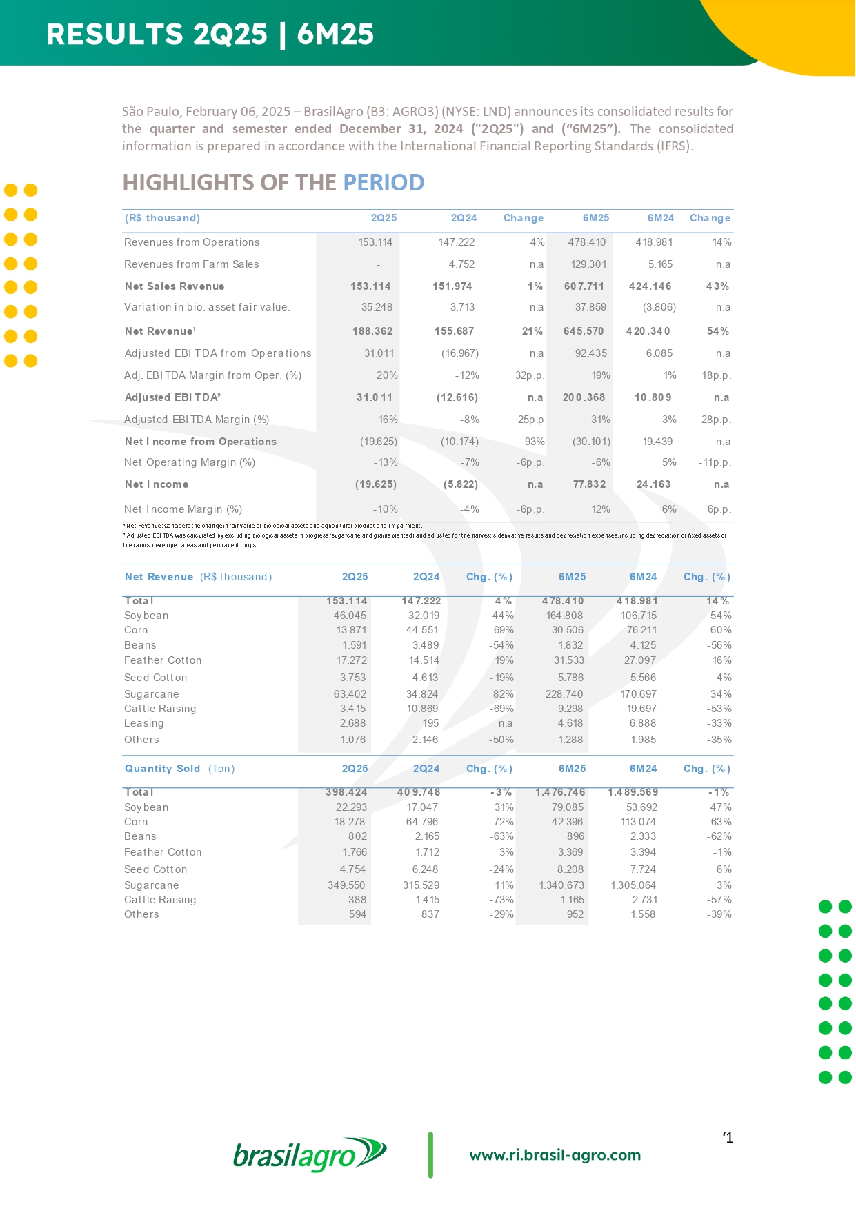 ‘1 São Paulo, February 06 , 2025 – BrasilAgro (B 3 : AGRO 3 ) (NYSE : LND) announces its consolidated results for the quarter and semester ended December 31 , 2024 (" 2 Q 25 ") and (“ 6 M 25 ”) . The consolidated information is prepared in accordance with the International Financial Reporting Standards (IFRS) . HIGHLIGHTS OF THE PERIOD (R$ thousa nd) 2Q25 2Q24 Cha nge 6M25 6M24 Cha nge 418.981 14% 478.410 147.222 4% 153.114 Revenues f rom Operations 5.165 n.a 129.301 4.752 n.a - Revenues f rom Farm Sales 4 24 .14 6 4 3 % 60 7.711 151.974 1% 153 .114 Net Sa les Revenue (3.806) n.a 37.859 3.713 n.a 35.248 Variation in bio. a sset fair value. 4 20 .34 0 54 % 64 5.570 155.687 21% 188.362 Net Revenue¹ 6.085 n.a 92.435 (16.967) n.a 31.011 Adjusted EBI TDA f r om Op er a t ions 1% 18p.p. 19% - 12% 32p.p. 20% Adj. EBI TDA Margin f rom Oper. (%) 10 .80 9 n.a 20 0 .368 (12.616) n.a 31.0 11 Adjusted EBI TDA² 3% 28p.p. 31% - 8% 25p.p 16% Adjusted EBI TDA Margin (%) 19.439 n.a (30.101) (10.174) 93% (19.625) Net I ncome from Operations 5% - 11p.p. - 6% - 7% - 6p.p. - 13% Net Operating Margin (%) 24 .163 n.a 77.832 (5.822) n.a (19.625) Net I ncome 6% 6p.p. 12% - 4% - 6p.p. - 10% Net I ncome Margin (%) ¹ Net Revenue: Considers the change in fair value of biological assets and agricultural product and I mpairm ent . ² Adjust ed EBI TDA was calculat ed by excluding biological assets in progress (sugarcane and grains plant ed) and adjust ed for the harvest’s derivat ive results and depreciat ion expenses, including depreciat ion of f ixed assets of the farms, developed areas and perm anent crops. Net Revenue (R$ thousa nd) 2Q25 2Q24 Chg. (% ) 6M25 6M24 Chg. (% ) 4 18.981 14 % 4 78.4 10 14 7.222 4% 153 .114 Tota l 106.715 54% 164.808 32.019 44% 46.045 Soybean 76.211 - 60% 30.506 44.551 - 69% 13.871 Corn 4.125 - 56% 1.832 3.489 - 54% 1.591 Beans 27.097 16% 31.533 14.514 19% 17.272 Feather Cotton 5.566 4% 5.786 4.613 - 19% 3.753 Seed Cotton 170.697 34% 228.740 34.824 82% 63.402 Sugarcane 19.697 - 53% 9.298 10.869 - 69% 3.415 Cattle Raising 6.888 - 33% 4.618 195 n.a 2.688 Lea sing 1.985 - 35% 1.288 2.146 - 50% 1.076 Others Chg. (% ) 6M24 6M25 Chg. (% ) 2Q24 2Q25 (Ton) Qua ntity Sold - 1% 1.4 89.569 1.4 76.74 6 - 3 % 4 0 9.74 8 398.4 24 Tota l 47% 53.692 79.085 31% 17.047 22.293 Soybean - 63% 113.074 42.396 - 72% 64.796 18.278 Corn - 62% 2.333 896 - 63% 2.165 802 Beans - 1% 3.394 3.369 3% 1.712 1.766 Feather Cotton 6% 7.724 8.208 - 24% 6.248 4.754 Seed Cotton 3% 1.305.064 1.340.673 11% 315.529 349.550 Sugarcane - 57% 2.731 1.165 - 73% 1.415 388 Cattle Raising - 39% 1.558 952 - 29% 837 594 Others