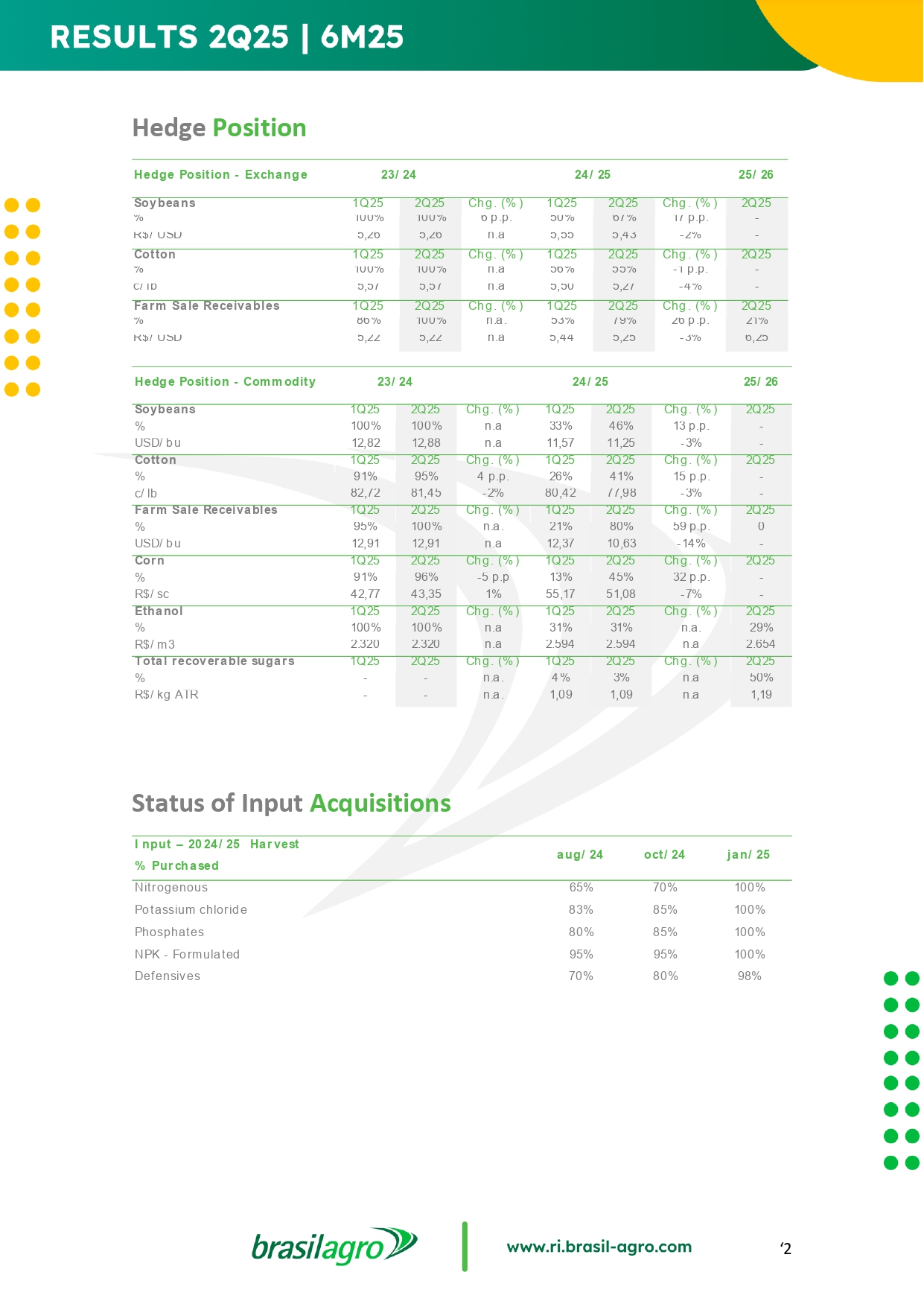 Hedge Position Status of Input Acquisitions 25/ 26 Hedge Position - Exchange 23/ 24 24 / 25 2Q25 Chg . (% ) 2Q25 1Q25 Chg . (% ) 2Q25 1Q25 Soybeans - 17 p.p. 67% 100% 6 p.p. 50% 100% % - - 2% 5,43 n.a 5,55 5,26 5,26 R$/ USD 2Q25 Chg . (% ) 2Q25 1Q25 Chg . (% ) 2Q25 1Q25 Cotton - - 1 p.p. 55% 100% n.a 56% 100% % - - 4% 5,27 n.a 5,50 5,57 5,57 c/ lb 2Q25 Chg . (% ) 2Q25 1Q25 Chg . (% ) 2Q25 1Q25 Farm Sale Receivables 21% 26 p.p. 79% 100% n.a. 53% 86% % 6,25 - 3% 5,25 n.a 5,44 5,22 5,22 R$/ USD 25/ 26 24 / 25 23/ 24 Hedge Position - Commodity 2Q25 Chg . (% ) 2Q25 1Q25 Chg . (% ) 2Q25 1Q25 Soybeans - 13 p.p. 46% 33% n.a 100% 100% % - - 3% 11,25 11,57 n.a 12,88 12,82 USD/ bu 2Q25 Chg . (% ) 2Q25 1Q25 Chg . (% ) 2Q25 1Q25 Cotton - 15 p.p. 41% 26% 4 p.p. 95% 91% % - - 3% 77,98 80,42 - 2% 81,45 82,72 c/ lb 2Q25 Chg . (% ) 2Q25 1Q25 Chg . (% ) 2Q25 1Q25 Farm Sale Receivables 0 59 p.p. 80% 21% n.a. 100% 95% % - - 14% 10,63 12,37 n.a 12,91 12,91 USD/ bu 2Q25 Chg . (% ) 2Q25 1Q25 Chg . (% ) 2Q25 1Q25 Corn - 32 p.p. 45% 13% - 5 p.p 96% 91% % - - 7% 51,08 55,17 1% 43,35 42,77 R$/ sc 2Q25 Chg . (% ) 2Q25 1Q25 Chg . (% ) 2Q25 1Q25 Ethanol 29% n.a. 31% 31% n.a 100% 100% % 2.654 n.a 2.594 2.594 n.a 2.320 2.320 R$/ m 3 2Q25 Chg . (% ) 2Q25 1Q25 Chg . (% ) 2Q25 1Q25 Total recoverable sugars 50% n.a 3% 4% n.a. - - % 1,19 n.a 1,09 1,09 n.a. - - R$/ kg ATR jan/ 25 oct/ 24 aug/ 24 I nput – 20 24 / 25 Harvest % Purchased 100% 70% 65% Nitrogenous 100% 85% 83% Potassium chloride 100% 85% 80% Phosphates 100% 95% 95% NPK - Formulated 98% 80% 70% Def ensives ‘ 2