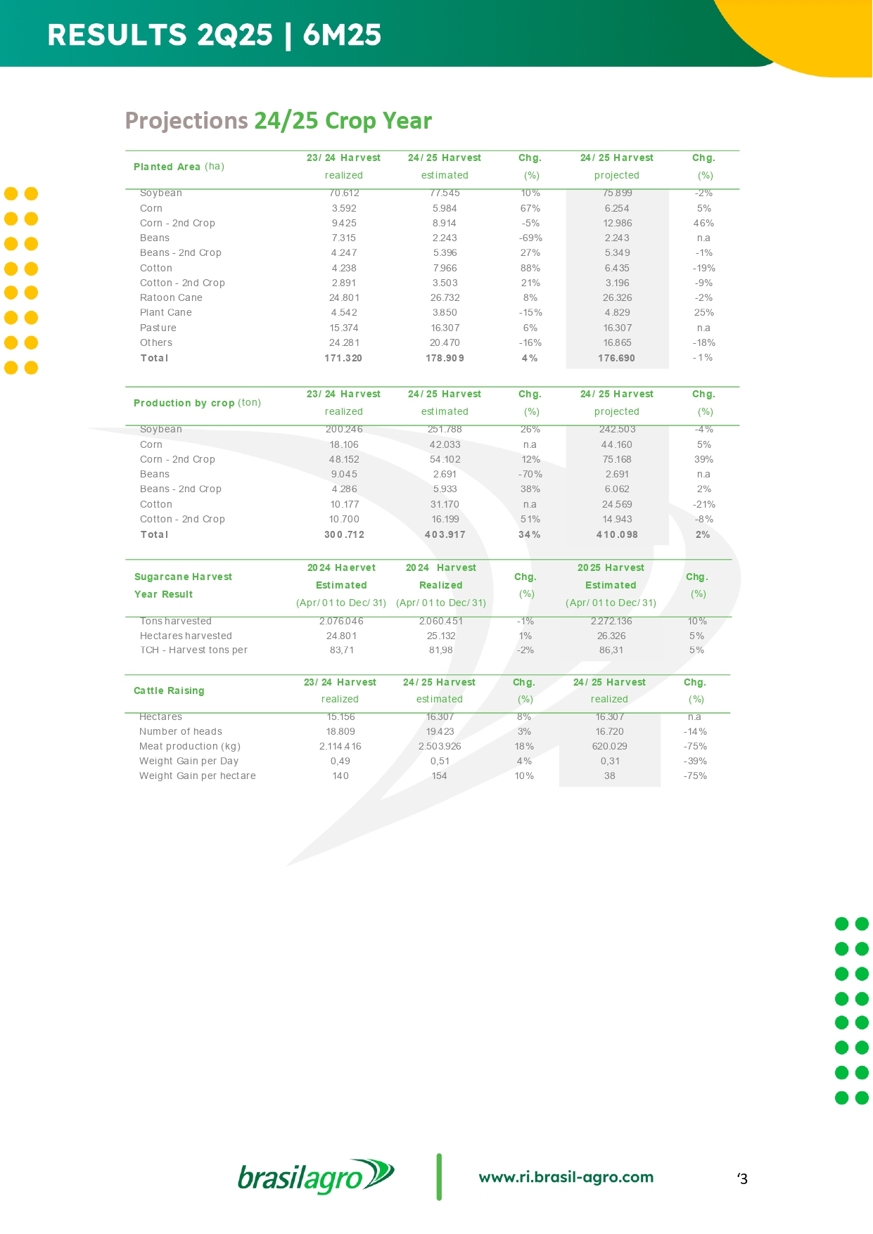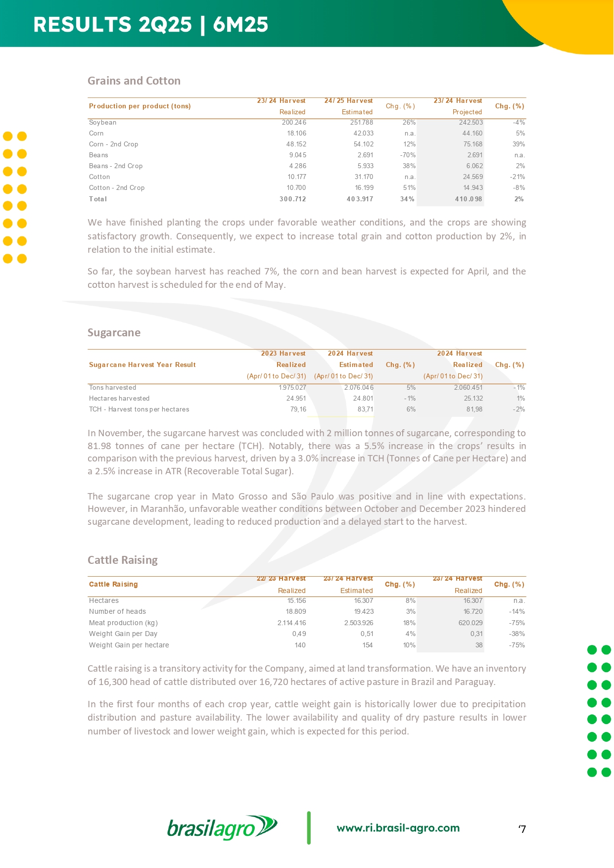 Grains and Cotton We have finished planting the crops under favorable weather conditions, and the crops are showing satisfactory growth . Consequently, we expect to increase total grain and cotton production by 2 % , in relation to the initial estimate . So far, the soybean harvest has reached 7 % , the corn and bean harvest is expected for April, and the cotton harvest is scheduled for the end of May . In November, the sugarcane harvest was concluded with 2 million tonnes of sugarcane, corresponding to 81.98 tonnes of cane per hectare (TCH). Notably, there was a 5.5% increase in the crops’ results in comparison with the previous harvest, driven by a 3.0% increase in TCH (Tonnes of Cane per Hectare) and a 2.5% increase in ATR (Recoverable Total Sugar). The sugarcane crop year in Mato Grosso and São Paulo was positive and in line with expectations . However, in Maranhão, unfavorable weather conditions between October and December 2023 hindered sugarcane development, leading to reduced production and a delayed start to the harvest . Cattle Raising Cattle raising is a transitory activity for the Company, aimed at land transformation . We have an inventory of 16 , 300 head of cattle distributed over 16 , 720 hectares of active pasture in Brazil and Paraguay . In the first four months of each crop year, cattle weight gain is historically lower due to precipitation distribution and pasture availability . The lower availability and quality of dry pasture results in lower number of livestock and lower weight gain, which is expected for this period . 24 / 25 Ha rvest 23/ 24 Ha rvest 23/ 24 Ha rvest Chg. (% ) Projected Chg . (% ) Estimated Realized Production per product (tons) - 4% 242.503 26% 251.788 200.246 Soybean 5% 44.160 n.a. 42.033 18.106 Corn 39% 75.168 12% 54.102 48.152 Corn - 2nd Crop n.a. 2.691 - 70% 2.691 9.045 Beans 2% 6.062 38% 5.933 4.286 Beans - 2nd Crop - 21% 24.569 n.a. 31.170 10.177 Cotton - 8% 14.943 51% 16.199 10.700 Cotton - 2nd Crop 2% 4 10 .0 98 34 % 4 0 3.917 30 0 .712 Tota l Sugarcane 20 24 Ha rvest 20 24 Ha rvest 20 23 Ha rvest Chg. (% ) Rea lized Chg. (% ) Estima ted Rea lized Suga rca ne Ha rvest Yea r Result (Apr/ 01 to Dec/ 31) (Apr/ 01 to Dec/ 31) (Apr/ 01 to Dec/ 31) - 1% 2.060.451 5% 2.076.046 1.975.027 Tons harvested 1% 25.132 - 1% 24.801 24.951 Hectares harvested - 2% 81,98 6% 83,71 79,16 TCH - Harvest tons per hectares Cattle Raising 22/ 23 Harvest 23/ 24 Harvest Chg. (% ) 23/ 24 Harvest Chg. (% ) Realized Estimated Realized n.a. 16.307 8% 16.307 15.156 Hectares - 14% 16.720 3% 19.423 18.809 Number of heads - 75% 620.029 18% 2.503.926 2.114.416 Meat production (kg) - 38% 0,31 4% 0,51 0,49 Weight Gain per Day - 75% 38 10% 154 140 Weight Gain per hectare ‘ 7