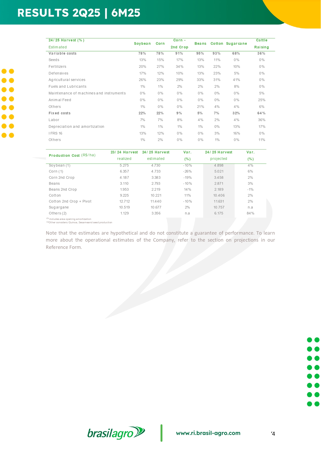 Note that the estimates are hypothetical and do not constitute a guarantee of performance . To learn more about the operational estimates of the Company, refer to the section on projections in our Reference Form . 24 / 25 Harvest (% ) Soybean Corn Corn - Beans Cotton Sugarcane Cattle Raising 2nd Crop Estimated 36% 68% 93% 95% 91% 78% 78% Variable costs 0% 0% 11% 13% 17% 15% 13% Seeds 0% 10% 22% 13% 34% 27% 20% Fertilizers 0% 5% 23% 13% 10% 12% 17% Defensives 0% 41% 31% 33% 29% 23% 26% Agricultural services 0% 8% 2% 2% 2% 1% 1% Fuels and Lubricants 5% 0% 0% 0% 0% 0% 0% Maintenance of machines and instruments 25% 0% 0% 0% 0% 0% 0% Animal Feed 6% 4% 4% 21% 0% 0% 1% Others 64 % 32% 7% 5% 9% 22% 22% Fixed costs 36% 4% 2% 4% 8% 7% 7% Labor 17% 13% 0% 1% 1% 1% 1% Depreciation and amortizat ion 0% 16% 3% 0% 0% 12% 13% I FRS 16 11% 0% 1% 0% 0% 2% 1% Others Production Cost (R$/ ha) 23/ 24 Harvest 24 / 25 Harvest realized estimated Var. (%) 24 / 25 Harvest projected Var. (%) 4% 4.898 - 10% 4.730 5.275 Soybean (1) 6% 5.021 - 26% 4.733 6.357 Corn (1) 2% 3.458 - 19% 3.383 4.187 Corn 2nd Crop 3% 2.871 - 10% 2.793 3.110 Beans - 1% 2.189 14% 2.219 1.953 Beans 2nd Crop 2% 10.406 11% 10.221 9.225 Cotton 2% 11.631 - 10% 11.440 12.712 Cotton 2nd Crop + Pivot n.a 10.757 2% 10.677 10.519 Sugargane 84% 6.175 n.a 3.356 1.129 Others (2) (1) includes area opening amortizat ion (2) Other considers: Quinoa, Sesam eand seed production ‘ 4