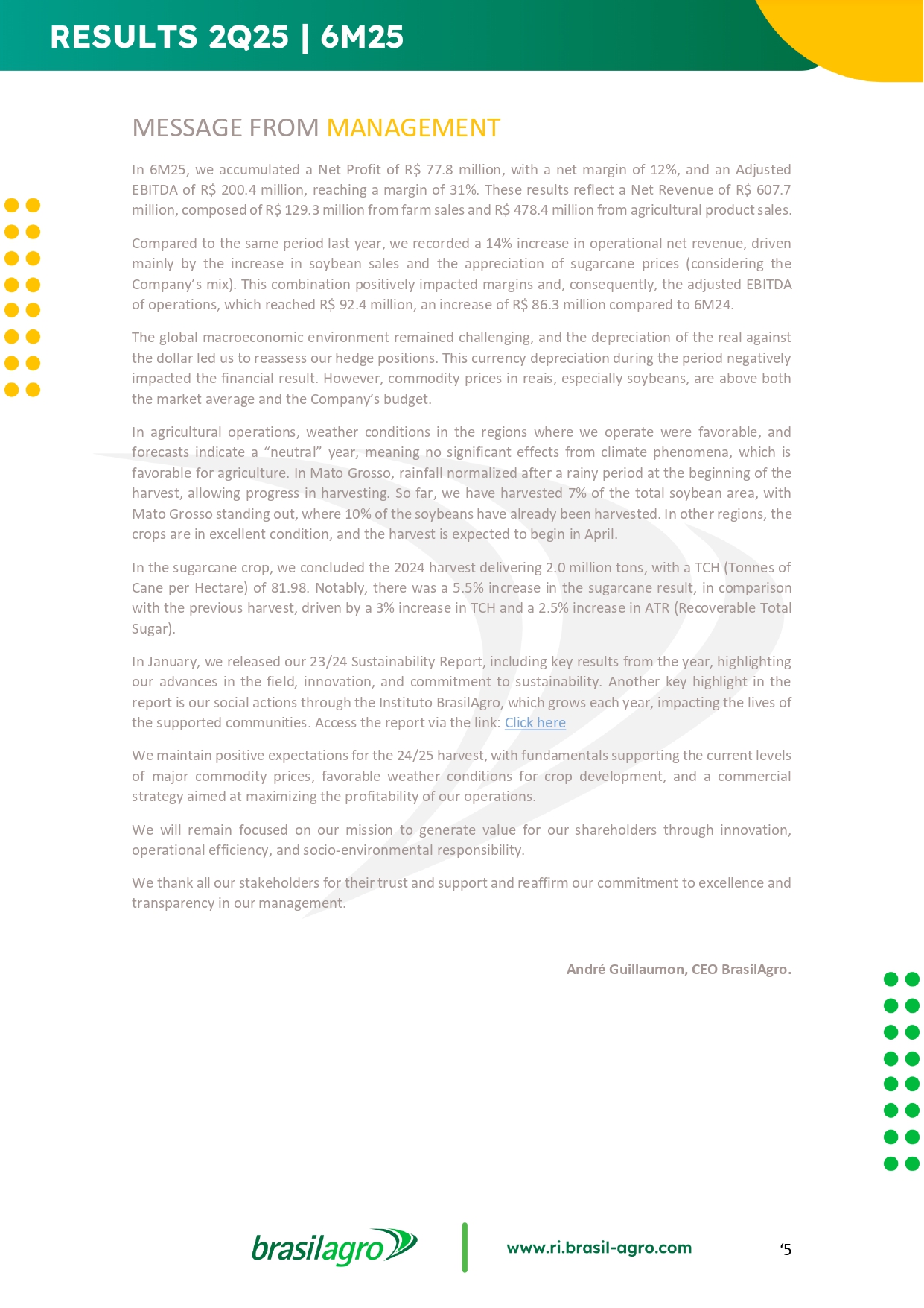 MESSAGE FROM MANAGEMENT In 6 M 25 , we accumulated a Net Profit of R $ 77 . 8 million, with a net margin of 12 % , and an Adjusted EBITDA of R $ 200 . 4 million, reaching a margin of 31 % . These results reflect a Net Revenue of R $ 607 . 7 million, composed of R $ 129 . 3 million from farm sales and R $ 478 . 4 million from agricultural product sales . Compared to the same period last year, we recorded a 14 % increase in operational net revenue, driven mainly by the increase in soybean sales and the appreciation of sugarcane prices (considering the Company’s mix) . This combination positively impacted margins and, consequently, the adjusted EBITDA of operations, which reached R $ 92 . 4 million, an increase of R $ 86 . 3 million compared to 6 M 24 . The global macroeconomic environment remained challenging, and the depreciation of the real against the dollar led us to reassess our hedge positions . This currency depreciation during the period negatively impacted the financial result . However, commodity prices in reais, especially soybeans, are above both the market average and the Company’s budget . In agricultural operations, weather conditions in the regions where we operate were favorable, and forecasts indicate a “neutral” year, meaning no significant effects from climate phenomena, which is favorable for agriculture . In Mato Grosso, rainfall normalized after a rainy period at the beginning of the harvest, allowing progress in harvesting . So far, we have harvested 7 % of the total soybean area, with Mato Grosso standing out, where 10 % of the soybeans have already been harvested . In other regions, the crops are in excellent condition, and the harvest is expected to begin in April . In the sugarcane crop, we concluded the 2024 harvest delivering 2 . 0 million tons, with a TCH (Tonnes of Cane per Hectare) of 81 . 98 . Notably, there was a 5 . 5 % increase in the sugarcane result, in comparison with the previous harvest, driven by a 3 % increase in TCH and a 2 . 5 % increase in ATR (Recoverable Total Sugar) . In January, we released our 23 / 24 Sustainability Report, including key results from the year, highlighting our advances in the field, innovation, and commitment to sustainability . Another key highlight in the report is our social actions through the Instituto BrasilAgro, which grows each year, impacting the lives of the supported communities . Access the report via the link : Click here We maintain positive expectations for the 24 / 25 harvest, with fundamentals supporting the current levels of major commodity prices, favorable weather conditions for crop development, and a commercial strategy aimed at maximizing the profitability of our operations . We will remain focused on our mission to generate value for our shareholders through innovation, operational efficiency, and socio - environmental responsibility . We thank all our stakeholders for their trust and support and reaffirm our commitment to excellence and transparency in our management . ‘ 5 André Guillaumon, CEO BrasilAgro.