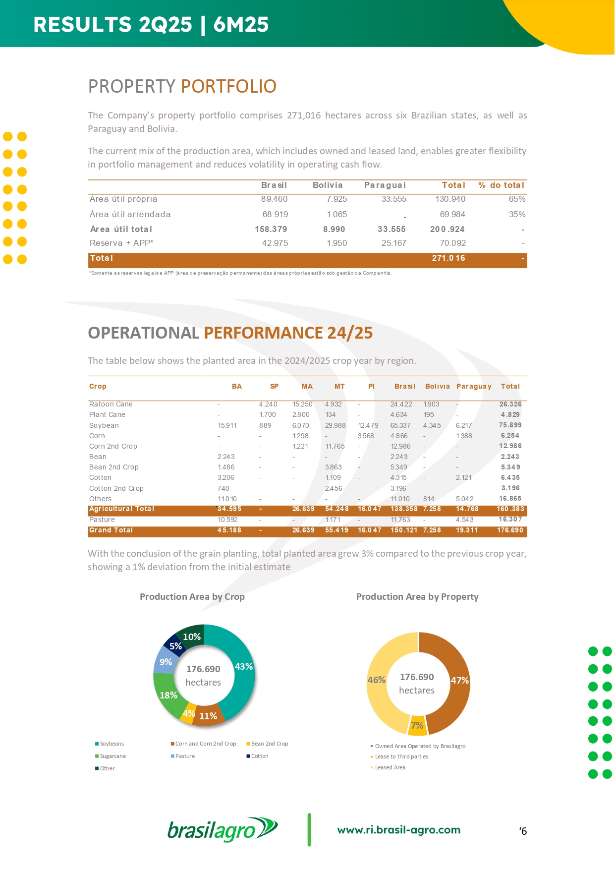 PROPERTY PORTFOLIO The Company’s property portfolio comprises 271,016 hectares across six Brazilian states, as well as Paraguay and Bolivia. The current mix of the production area, which includes owned and leased land, enables greater flexibility in portfolio management and reduces volatility in operating cash flow. OPERATIONAL PERFORMANCE 24/25 The table below shows the planted area in the 2024/2025 crop year by region. % do tota l Tota l Pa ra gua i Bolívia Bra sil 65% 130.940 33.555 7.925 89.460 Área út il própria 35% 69.984 - 1.065 68.919 Área út il arrendada - 20 0 .924 33 .555 8.990 158.379 Área útil tota l - 70.092 25.167 1.950 42.975 Reserva + APP* - 271.0 16 Tota l *Soment e as reserva s legais e APP (á rea de preserva çã o permanent e) das áreas próprias est ão sob gest ão da Companhia. Crop BA SP MA MT PI Brasil Bolivia Paraguay Total 26.326 - 1.903 24.422 - 4.932 15.250 4.240 - Ratoon Cane 4 .829 - 195 4.634 - 134 2.800 1.700 - Plant Cane 75.899 6.217 4.345 65.337 12.479 29.988 6.070 889 15.911 Soybean 6.254 1.388 - 4.866 3.568 - 1.298 - - Corn 12.986 - - 12.986 - 11.765 1.221 - - Corn 2nd Crop 2.24 3 - - 2.243 - - - - 2.243 Bean 5.34 9 - - 5.349 - 3.863 - - 1.486 Bean 2nd Crop 6.4 35 2.121 - 4.315 - 1.109 - - 3.206 Cotton 3.196 - - 3.196 - 2.456 - - 740 Cotton 2nd Crop 16.865 5.042 814 11.010 - - - - 11.010 Others 160 .383 14 .768 7.258 138.358 16.0 4 7 54 .24 8 26.639 - 34 .595 Agricultural Total 16.30 7 4.543 - 11.763 - 1.171 - - 10.592 Pasture 176.690 19.311 7.258 150 .121 16.0 4 7 55.4 19 26.639 - 4 5.188 Grand Total 43% 4% 11% 18% 5% 9% 10% Soybeans Corn and Corn 2nd Crop Bean 2nd Crop Sugarcane Pasture Cotton Other 47% 7% 46% With the conclusion of the grain planting, total planted area grew 3% compared to the previous crop year, showing a 1% deviation from the initial estimate Production Area by Crop Production Area by Property Owned Area Operated by Brasilagro Lease to third parties Leased Area ‘ 6 176.690 hectares 176.690 hectares