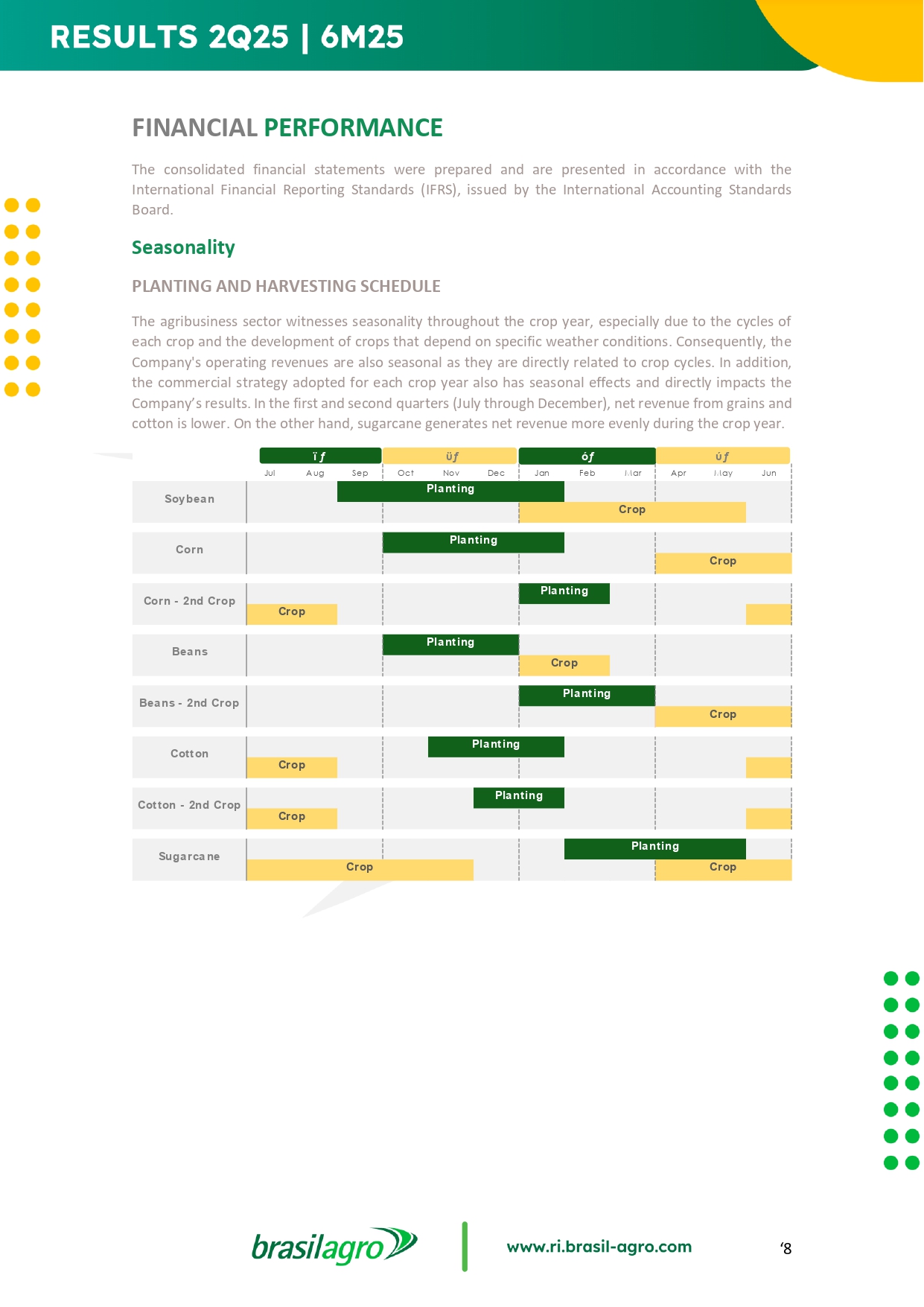 FINANCIAL PERFORMANCE The consolidated financial statements were prepared and are presented in accordance with the International Financial Reporting Standards (IFRS), issued by the International Accounting Standards Board . Seasonality PLANTING AND HARVESTING SCHEDULE The agribusiness sector witnesses seasonality throughout the crop year, especially due to the cycles of each crop and the development of crops that depend on specific weather conditions . Consequently, the Company's operating revenues are also seasonal as they are directly related to crop cycles . In addition, the commercial strategy adopted for each crop year also has seasonal effects and directly impacts the Company’s results . In the first and second quarters (July through December), net revenue from grains and cotton is lower . On the other hand, sugarcane generates net revenue more evenly during the crop year . Jul Sep Oct Dec Jan Mar Apr Jun Crop Soybean Planting Crop Corn Planting Planting Corn - 2nd Crop Crop Crop Beans Beans - 2nd Crop Crop Planting Planting Cotton Planting Crop Planting Cotton - 2nd Crop Crop Sugarcane Planting Crop Crop ïf Aug ‘ 8 óf Feb üf Nov úf May