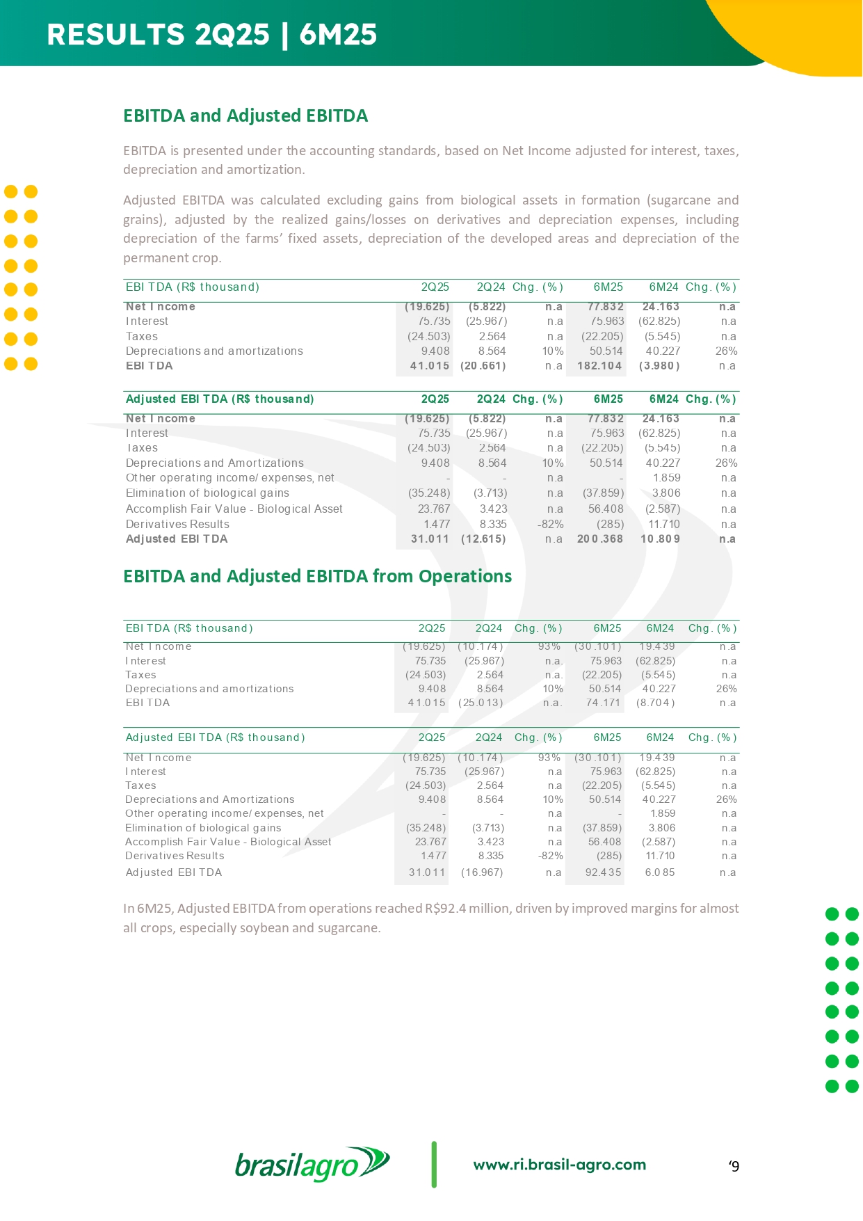 EBITDA and Adjusted EBITDA EBITDA is presented under the accounting standards, based on Net Income adjusted for interest, taxes, depreciation and amortization . Adjusted EBITDA was calculated excluding gains from biological assets in formation (sugarcane and grains), adjusted by the realized gains/losses on derivatives and depreciation expenses, including depreciation of the farms’ fixed assets, depreciation of the developed areas and depreciation of the permanent crop . EBITDA and Adjusted EBITDA from Operations In 6M25, Adjusted EBITDA from operations reached R$92.4 million, driven by improved margins for almost all crops, especially soybean and sugarcane. Chg. (% ) 6M24 6M25 Chg. (% ) 2Q24 2Q25 EBI TDA (R$ t hou sa nd) n.a 24 .163 77.832 n.a (5.822) (19.625) Net I ncome n.a (62.825) 75.963 n.a (25.967) 75.735 I nterest n.a (5.545) (22.205) n.a 2.564 (24.503) Taxes 26% 40.227 50.514 10% 8.564 9.408 Depreciations and amortizations n.a (3.980 ) 182.10 4 n.a (20 .661) 4 1.0 15 EBI TDA Chg. (% ) 6M24 6M25 Chg. (% ) 2Q24 2Q25 Adjusted EBI TDA (R$ thousand) n.a 24 .163 77.832 n.a (5.822) (19.625) Net I ncome n.a (62.825) 75.963 n.a (25.967) 75.735 I nterest n.a (5.545) (22.205) n.a 2.564 (24.503) Taxes 26% 40.227 50.514 10% 8.564 9.408 Depreciations and Amortizations n.a 1.859 - n.a - - Other operating income/ expenses, net n.a 3.806 (37.859) n.a (3.713) (35.248) Elimination of biological gains n.a (2.587) 56.408 n.a 3.423 23.767 Accomplish Fair Value - Biological Asset n.a 11.710 (285) - 82% 8.335 1.477 Derivatives Results n.a 10 .80 9 20 0 .368 n.a (12.615) 31.0 11 Adjusted EBI TDA ‘ 9 Chg. (% ) 6M24 6M25 Chg. (% ) 2Q24 2Q25 EBI TDA (R$ t hou sa nd) n.a 19.4 39 (30 .10 1) 93% (10 .174 ) (19.625) Net I ncom e n.a (62.825) 75.963 n.a. (25.967) 75.735 I nterest n.a (5.545) (22.205) n.a. 2.564 (24.503) Taxes 26% 40.227 50.514 10% 8.564 9.408 Depreciations and amortizations n.a (8.70 4 ) 74 .171 n.a. (25.0 13) 4 1.0 15 EBI TDA Chg. (% ) 6M24 6M25 Chg. (% ) 2Q24 2Q25 Adjust ed EBI TDA (R$ t hou sa nd) n.a 19.4 39 (30 .10 1) 93% (10 .174 ) (19.625) Net I ncom e n.a (62.825) 75.963 n.a (25.967) 75.735 I nterest n.a (5.545) (22.205) n.a 2.564 (24.503) Taxes 26% 40.227 50.514 10% 8.564 9.408 Depreciations and Amortizations n.a 1.859 - n.a - - Other operating income/ expenses, net n.a 3.806 (37.859) n.a (3.713) (35.248) Elimination of biological gains n.a (2.587) 56.408 n.a 3.423 23.767 Accomplish Fair Value - Biological Asset n.a 11.710 (285) - 82% 8.335 1.477 Derivatives Results n.a 6.0 85 92.4 35 n.a (16.967) 31.0 11 Adjust ed EBI TDA