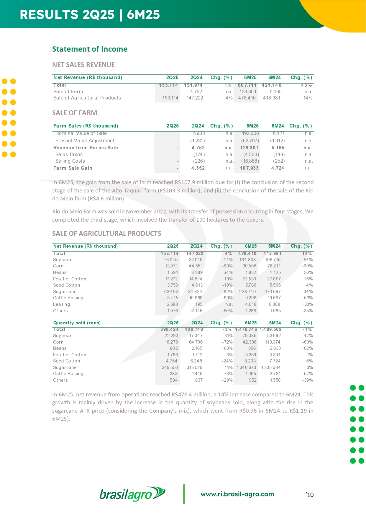 Statement of Income NET SALES REVENUE SALE OF FARM In 6 M 25 , the gain from the sale of farm reached R $ 107 . 9 million due to : (i) the conclusion of the second stage of the sale of the Alto Taquari farm (R $ 103 . 3 million) ; and (ii) the conclusion of the sale of the Rio do Meio farm (R $ 4 . 6 million) . Rio do Meio Farm was sold in November 2022 , with its transfer of possession occurring in four stages . We completed the third stage, which involved the transfer of 190 hectares to the buyers . SALE OF AGRICULTURAL PRODUCTS In 6 M 25 , net revenue from operations reached R $ 478 . 4 million, a 14 % increase compared to 6 M 24 . This growth is mainly driven by the increase in the quantity of soybeans sold, along with the rise in the sugarcane ATR price (considering the Company's mix), which went from R $ 0 . 96 in 6 M 24 to R $ 1 . 19 in 6 M 25 ) . Net Revenue (R$ thousand) 2Q25 2Q24 Chg. (% ) 6M25 6M24 Chg. (% ) 4 24 .14 6 4 3% 60 7.711 1% 151.974 153.114 Total 5.165 n.a. 129.301 n.a. 4.752 - Sale of Farm 418.981 14% 478.410 4% 147.222 153.114 Sale of Agricultural Products 6M24 Chg. (% ) 6M25 2Q24 Chg. (% ) 2Q25 Fa rm Sa les (R$ thousa nd) 6.477 n.a. 192.008 5.983 n.a. - Nominal Value of Sale (1.312) n.a. (62.707) (1.231) n.a. - Present Value Adjustment 5.165 n.a . 129.30 1 4 .752 n.a . - Revenue from Fa rms Sa le (189) n.a. (4.500) (174) n.a. - Sales Taxes (252) n.a. (16.868) (226) n.a. - Selling Costs 4 .724 n .a . 10 7.933 4 .352 n .a . - Fa rm Sa le Ga in ‘ 10 Chg. (% ) 6M24 6M25 Chg. (% ) 2Q24 2Q25 Net Revenue (R$ thousa nd) 14 % 4 18.981 4 78.4 10 4% 14 7.222 153.114 Total 54% 106.715 164.808 44% 32.019 46.045 Soybean - 60% 76.211 30.506 - 69% 44.551 13.871 Corn - 56% 4.125 1.832 - 54% 3.489 1.591 Beans 16% 27.097 31.533 19% 14.514 17.272 Feather Cotton 4% 5.566 5.786 - 19% 4.613 3.753 Seed Cotton 34% 170.697 228.740 82% 34.824 63.402 Sugarcane - 53% 19.697 9.298 - 69% 10.869 3.415 Cattle Raising - 33% 6.888 4.618 n.a. 195 2.688 Leasing - 35% 1.985 1.288 - 50% 2.146 1.076 Others Chg. (% ) 6M24 6M25 Chg. (% ) 2Q24 2Q25 Qua ntity sold (tons) - 1% 1.4 89.569 1.4 76.74 6 - 3% 4 0 9.74 8 398.4 24 Total 47% 53.692 79.085 31% 17.047 22.293 Soybean - 63% 113.074 42.396 - 72% 64.796 18.278 Corn - 62% 2.333 896 - 63% 2.165 802 Beans - 1% 3.394 3.369 3% 1.712 1.766 Feather Cotton 6% 7.724 8.208 - 24% 6.248 4.754 Seed Cotton 3% 1.305.064 1.340.673 11% 315.529 349.550 Sugarcane - 57% 2.731 1.165 - 73% 1.415 388 Cattle Raising - 39% 1.558 952 - 29% 837 594 Others