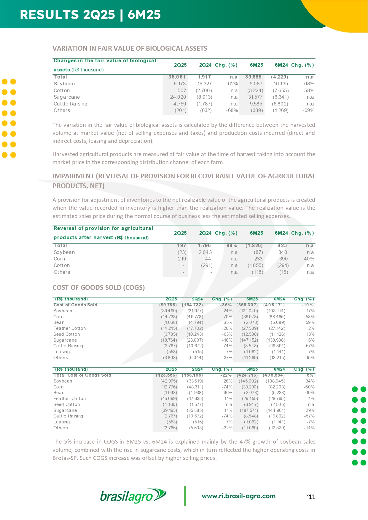 VARIATION IN FAIR VALUE OF BIOLOGICAL ASSETS The 5 % increase in COGS in 6 M 25 vs . 6 M 24 is explained mainly by the 47 % growth of soybean sales volume, combined with the rise in sugarcane costs, which in turn reflected the higher operating costs in Brotas - SP . Such COGS increase was offset by higher selling prices . 6M24 Chg. (% ) 6M25 2Q24 Chg. (% ) Changes in the fair value of biological 2Q25 assets (R$ thousand) n.a (4 .229) 39.685 n.a 1.917 35.0 51 Total - 68% 16.135 5.087 - 62% 16.327 6.173 Soybean - 58% (7.655) (3.224) n.a (2.700) 507 Cotton n.a (6.341) 31.577 n.a (8.913) 24.020 Sugarcane n.a (6.802) 9.585 n.a (1.787) 4.759 Cattle Raising - 69% (1.269) (389) - 68% (632) (201) Others The variation in the fair value of biological assets is calculated by the difference between the harvested volume at market value (net of selling expenses and taxes) and production costs incurred (direct and indirect costs, leasing and depreciation) . Harvested agricultural products are measured at fair value at the time of harvest taking into account the market price in the corresponding distribution channel of each farm . IMPAIRMENT (REVERSAL OF PROVISION FOR RECOVERABLE VALUE OF AGRICULTURAL PRODUCTS, NET) A provision for adjustment of inventories to the net realizable value of the agricultural products is created when the value recorded in inventory is higher than the realization value . The realization value is the estimated sales price during the normal course of business less the estimated selling expenses . Reversal of provision for agricultural products after harvest (R$ thousand) Total Soybean Corn Cotton Others COST OF GOODS SOLD (COGS) Chg. (% ) 6M24 6M25 Chg. (% ) 2Q24 2Q25 n.a 4 23 (1.826) - 89% 1.796 197 n.a 340 (87) n.a 2.043 (23) - 40% 390 233 n.a 44 219 n.a (291) (1.855) n.a (291) - n.a (15) (118) n.a - - Chg. (% ) 6M24 6M25 Chg. (% ) 2Q24 2Q25 (R$ thousand) - 10 % (4 0 8.171) (368.30 7) - 36% (154 .732) (99.788) Cost of Goods Sold 17% (103.114) (121.049) 24% (31.977) (39.499) Soybean - 58% (88.465) (36.978) - 70% (49.778) (14.733) Corn - 59% (5.089) (2.073) - 65% (4.794) (1.668) Bean 2% (27.142) (27.589) - 20% (17.702) (14.215) Feather Cotton 13% (11.126) (12.588) - 63% (10.243) (3.785) Seed Cotton 6% (138.988) (147.152) - 18% (23.007) (18.764) Sugarcane - 57% (19.891) (8.548) - 74% (10.672) (2.767) Cattle Raising - 7% (1.141) (1.062) 7% (515) (553) Leasing - 15% (13.215) (11.269) - 37% (6.044) (3.803) Others Chg. (% ) 6M24 6M25 Chg. (% ) 2Q24 2Q25 (R$ thousand) 5% (4 0 5.584 ) (4 24 .716) - 22% (158.155) (123 .556) Total Cost of Goods Sold 34% (108.045) (145.002) 28% (33.619) (42.975) Soybean - 60% (82.203) (33.290) - 74% (48.311) (12.776) Corn - 60% (5.233) (2.073) - 66% (4.938) (1.668) Bean 1% (28.765) (29.155) - 11% (17.635) (15.699) Feather Cotton n.a (2.505) (6.947) n.a (1.577) (4.160) Seed Cotton 29% (144.961) (187.571) 11% (35.385) (39.193) Sugarcane - 57% (19.892) (8.548) - 74% (10.672) (2.767) Cattle Raising - 7% (1.141) (1.062) 7% (515) (553) Leasing - 14% (12.839) (11.069) - 32% (5.503) (3.765) Others ‘ 11