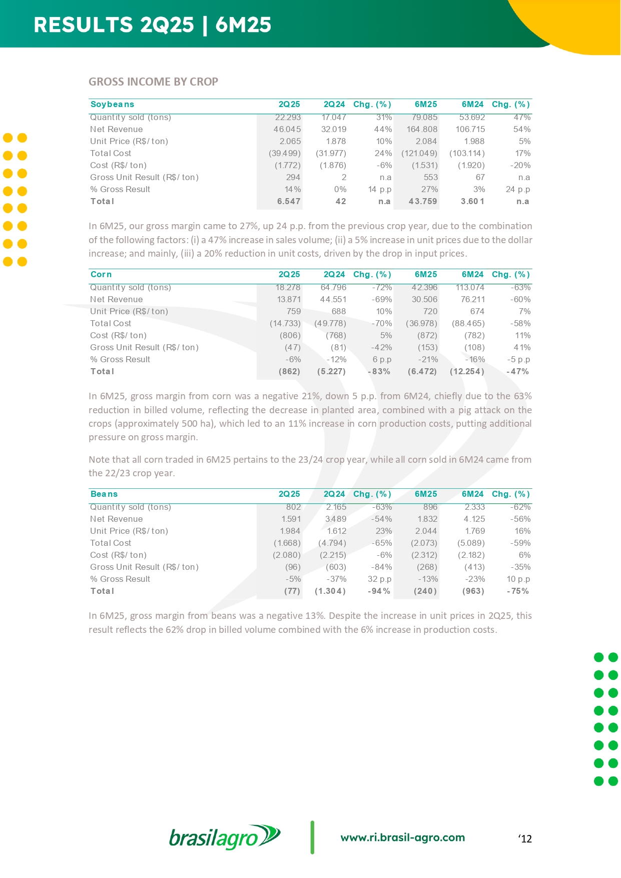 In 6 M 25 , our gross margin came to 27 % , up 24 p . p . from the previous crop year, due to the combination of the following factors : (i) a 47 % increase in sales volume ; (ii) a 5 % increase in unit prices due to the dollar increase ; and mainly, (iii) a 20 % reduction in unit costs, driven by the drop in input prices . In 6M25, gross margin from beans was a negative 13%. Despite the increase in unit prices in 2Q25, this result reflects the 62% drop in billed volume combined with the 6% increase in production costs. GROSS INCOME BY CROP Chg. (% ) 6M24 6M25 Chg. (% ) 2Q24 2Q25 Soybea ns 47% 53.692 79.085 31% 17.047 22.293 Quant ity sold (tons) 54% 106.715 164.808 44% 32.019 46.045 Net Revenue 5% 1.988 2.084 10% 1.878 2.065 Unit Price (R$/ ton) 17% (103.114) (121.049) 24% (31.977) (39.499) Total Cost - 20% (1.920) (1.531) - 6% (1.876) (1.772) Cost (R$/ ton) n.a 67 553 n.a 2 294 Gross Unit Result (R$/ ton) 24 p.p 3% 27% 14 p.p 0% 14% % Gross Result n.a 3.60 1 4 3.759 n.a 4 2 6.54 7 Tota l Chg. (% ) 6M24 6M25 Chg. (% ) 2Q24 2Q25 Corn - 63% 113.074 42.396 - 72% 64.796 18.278 Quant ity sold (tons) - 60% 76.211 30.506 - 69% 44.551 13.871 Net Revenue 7% 674 720 10% 688 759 Unit Price (R$/ ton) - 58% (88.465) (36.978) - 70% (49.778) (14.733) Total Cost 11% (782) (872) 5% (768) (806) Cost (R$/ ton) 41% (108) (153) - 42% (81) (47) Gross Unit Result (R$/ ton) - 5 p.p - 16% - 21% 6 p.p - 12% - 6% % Gross Result - 4 7% (12.254 ) (6.4 72) - 83% (5.227) (862) Tota l In 6 M 25 , gross margin from corn was a negative 21 % , down 5 p . p . from 6 M 24 , chiefly due to the 63 % reduction in billed volume, reflecting the decrease in planted area, combined with a pig attack on the crops (approximately 500 ha), which led to an 11 % increase in corn production costs, putting additional pressure on gross margin . Note that all corn traded in 6 M 25 pertains to the 23 / 24 crop year, while all corn sold in 6 M 24 came from the 22 / 23 crop year . Bea ns 2 Q 25 2 Q 24 Chg . ( % ) 6 M 25 6 M 24 Chg . ( % ) - 62% 2.333 896 2.165 - 63% 802 Quant ity sold (tons) - 56% 4.125 1.832 3.489 - 54% 1.591 Net Revenue 16% 1.769 2.044 1.612 23% 1.984 Unit Price (R$/ ton) - 59% (5.089) (2.073) (4.794) - 65% (1.668) Total Cost 6% (2.182) (2.312) (2.215) - 6% (2.080) Cost (R$/ ton) - 35% (413) (268) (603) - 84% (96) Gross Unit Result (R$/ ton) 10 p.p - 23% - 13% - 37% 32 p.p - 5% % Gross Result - 75% (963) (24 0 ) (1.30 4 ) - 94 % (77) Tota l ‘ 12