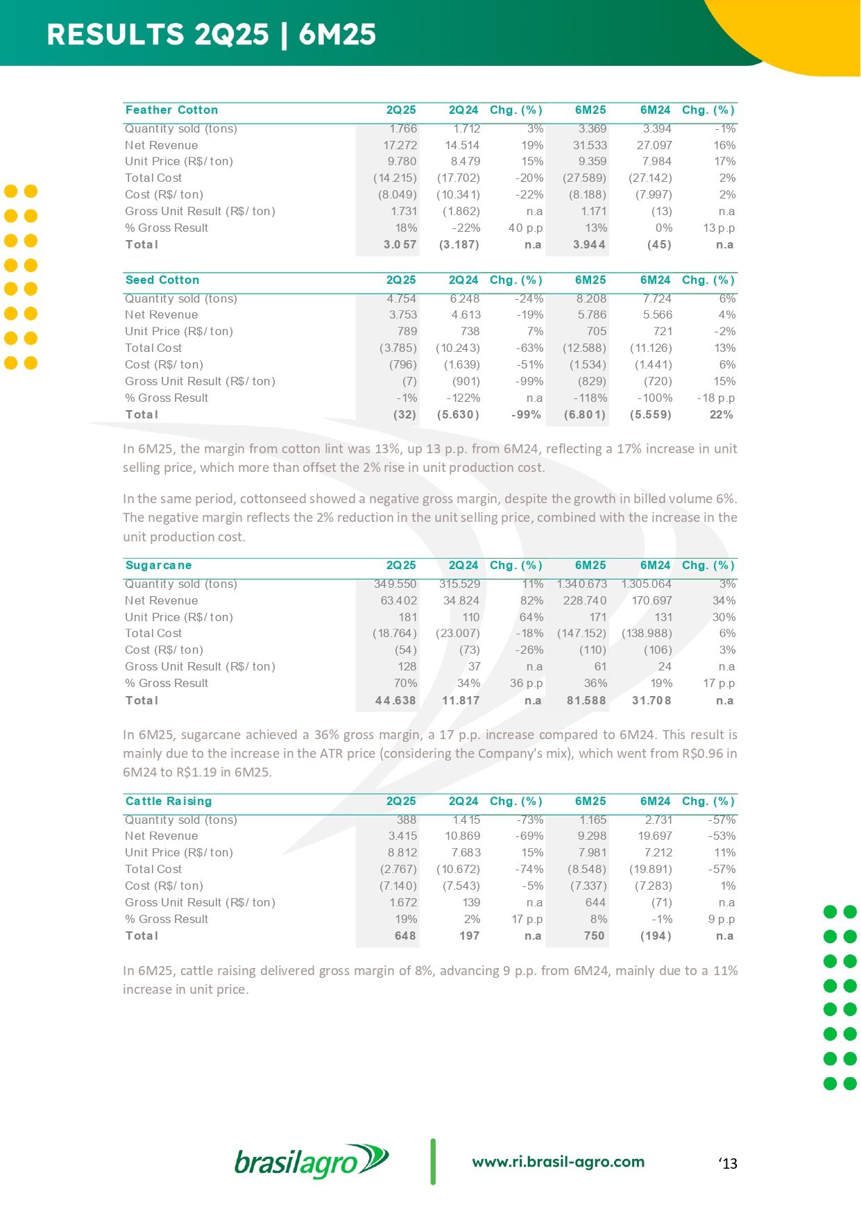 In 6 M 25 , the margin from cotton lint was 13 % , up 13 p . p . from 6 M 24 , reflecting a 17 % increase in unit selling price, which more than offset the 2 % rise in unit production cost . In the same period, cottonseed showed a negative gross margin, despite the growth in billed volume 6 % . The negative margin reflects the 2 % reduction in the unit selling price, combined with the increase in the unit production cost . ‘ 13 In 6 M 25 , sugarcane achieved a 36 % gross margin, a 17 p . p . increase compared to 6 M 24 . This result is mainly due to the increase in the ATR price (considering the Company's mix), which went from R $ 0 . 96 in 6 M 24 to R $ 1 . 19 in 6 M 25 . In 6M25, cattle raising delivered gross margin of 8%, advancing 9 p.p. from 6M24, mainly due to a 11% increase in unit price. Chg. (% ) 6M24 6M25 Chg. (% ) 2Q24 2Q25 Fea ther Cotton - 1% 3.394 3.369 3% 1.712 1.766 Quant ity sold (tons) 16% 27.097 31.533 19% 14.514 17.272 Net Revenue 17% 7.984 9.359 15% 8.479 9.780 Unit Price (R$/ ton) 2% (27.142) (27.589) - 20% (17.702) (14.215) Total Cost 2% (7.997) (8.188) - 22% (10.341) (8.049) Cost (R$/ ton) n.a (13) 1.171 n.a (1.862) 1.731 Gross Unit Result (R$/ ton) 13 p.p 0% 13% 40 p.p - 22% 18% % Gross Result n.a (4 5) 3.94 4 n.a (3.187) 3.0 57 Tota l Chg. (% ) 6M24 6M25 Chg. (% ) 2Q24 2Q25 Seed Cotton 6% 7.724 8.208 - 24% 6.248 4.754 Quant ity sold (tons) 4% 5.566 5.786 - 19% 4.613 3.753 Net Revenue - 2% 721 705 7% 738 789 Unit Price (R$/ ton) 13% (11.126) (12.588) - 63% (10.243) (3.785) Total Cost 6% (1.441) (1.534) - 51% (1.639) (796) Cost (R$/ ton) 15% (720) (829) - 99% (901) (7) Gross Unit Result (R$/ ton) - 18 p.p - 100% - 118% n.a - 122% - 1% % Gross Result 22% (5.559) (6.80 1) - 99% (5.630 ) (32) Tota l Chg. (% ) 6M24 6M25 Chg. (% ) 2Q24 2Q25 Suga rca ne 3% 1.305.064 1.340.673 11% 315.529 349.550 Quant ity sold (tons) 34% 170.697 228.740 82% 34.824 63.402 Net Revenue 30% 131 171 64% 110 181 Unit Price (R$/ ton) 6% (138.988) (147.152) - 18% (23.007) (18.764) Total Cost 3% (106) (110) - 26% (73) (54) Cost (R$/ ton) n.a 24 61 n.a 37 128 Gross Unit Result (R$/ ton) 17 p.p 19% 36% 36 p.p 34% 70% % Gross Result n.a 31.70 8 81.588 n.a 11.817 4 4 .638 Tota l Chg. (% ) 6M24 6M25 Chg. (% ) 2Q24 2Q25 Ca ttle Ra ising - 57% 2.731 1.165 - 73% 1.415 388 Quant ity sold (tons) - 53% 19.697 9.298 - 69% 10.869 3.415 Net Revenue 11% 7.212 7.981 15% 7.683 8.812 Unit Price (R$/ ton) - 57% (19.891) (8.548) - 74% (10.672) (2.767) Total Cost 1% (7.283) (7.337) - 5% (7.543) (7.140) Cost (R$/ ton) n.a (71) 644 n.a 139 1.672 Gross Unit Result (R$/ ton) 9 p.p - 1% 8% 17 p.p 2% 19% % Gross Result n.a (194 ) 750 n.a 197 64 8 Tota l
