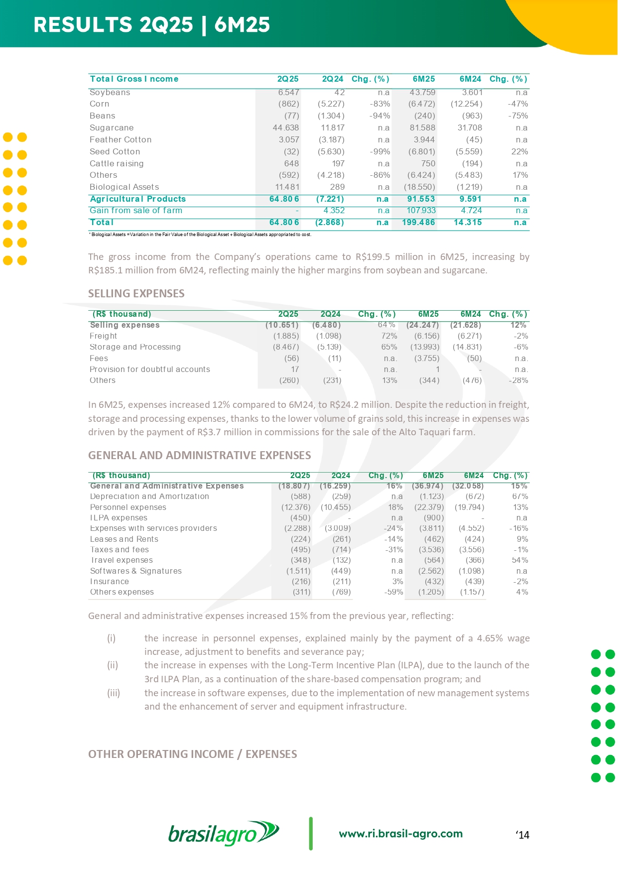 The gross income from the Company’s operations came to R$199.5 million in 6M25, increasing by R$185.1 million from 6M24, reflecting mainly the higher margins from soybean and sugarcane. SELLING EXPENSES In 6 M 25 , expenses increased 12 % compared to 6 M 24 , to R $ 24 . 2 million . Despite the reduction in freight, storage and processing expenses, thanks to the lower volume of grains sold, this increase in expenses was driven by the payment of R $ 3 . 7 million in commissions for the sale of the Alto Taquari farm . General and administrative expenses increased 15% from the previous year, reflecting: (i) (ii) (iii) the increase in personnel expenses, explained mainly by the payment of a 4.65% wage increase, adjustment to benefits and severance pay; the increase in expenses with the Long - Term Incentive Plan (ILPA), due to the launch of the 3rd ILPA Plan, as a continuation of the share - based compensation program; and the increase in software expenses, due to the implementation of new management systems and the enhancement of server and equipment infrastructure. OTHER OPERATING INCOME / EXPENSES Tota l Gross I ncome 2Q25 2Q24 Chg. (% ) 6M25 6M24 Chg. (% ) 3.601 n.a 43.759 n.a 42 6.547 Soybeans (12.254) - 47% (6.472) - 83% (5.227) (862) Corn (963) - 75% (240) - 94% (1.304) (77) Beans 31.708 n.a 81.588 n.a 11.817 44.638 Sugarcane (45) n.a 3.944 n.a (3.187) 3.057 Feather Cotton (5.559) 22% (6.801) - 99% (5.630) (32) Seed Cotton (194) n.a 750 n.a 197 648 Cattle raising (5.483) 17% (6.424) - 86% (4.218) (592) Others (1.219) n.a (18.550) n.a 289 11.481 Biological Assets 9.591 n.a 91.553 n.a (7.221) 64 .80 6 Agricultura l Products n.a 4.724 107.933 4.352 n.a - Gain f rom sale of f arm n.a 14 .315 199.4 86 n.a (2.868) 64 .80 6 Tota l ¹ Biological Asset s = Variation in the Fair Value of the Biological Asset + Biological Asset s appropriated to cost. Chg. (% ) 6M24 6M25 Chg. (% ) 2Q24 2Q25 (R$ thousa nd) 12% (21.628) (24 .24 7) 64 % (6.4 80 ) (10 .651) Selling expenses - 2% (6.271) (6.156) 72% (1.098) (1.885) Freight - 6% (14.831) (13.993) 65% (5.139) (8.467) Storage and Processing n.a. (50) (3.755) n.a. (11) (56) Fees n.a. - 1 n.a. - 17 Provision f or doubtf ul accounts - 28% (476) (344) 13% (231) (260) Others GENERAL AND ADMINISTRATIVE EXPENSES (R$ thousand) 2Q25 2Q24 Chg. (%) 6M25 6M24 Chg. (%) (32.058) 15% (36.974 ) (16.259) 16% (18.807) General and Administrative Expenses (672) 67% (1.123) (259) n.a (588) Depreciation and Amortization (19.794) 13% (22.379) (10.455) 18% (12.376) Personnel expenses - n.a (900) - n.a (450) I LPA expenses (4.552) - 16% (3.811) (3.009) - 24% (2.288) Expenses with services providers (424) 9% (462) (261) - 14% (224) Leases and Rents (3.556) - 1% (3.536) (714) - 31% (495) Taxes and fees (366) 54% (564) (132) n.a (348) Travel expenses (1.098) n.a (2.562) (449) n.a (1.511) Softwares & Signatures (439) - 2% (432) (211) 3% (216) I nsurance (1.157) 4% (1.205) (769) - 59% (311) Others expenses ‘ 14