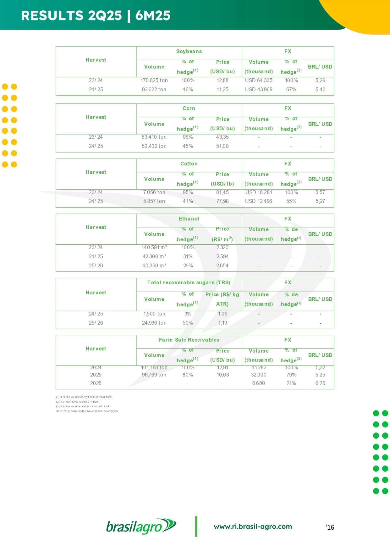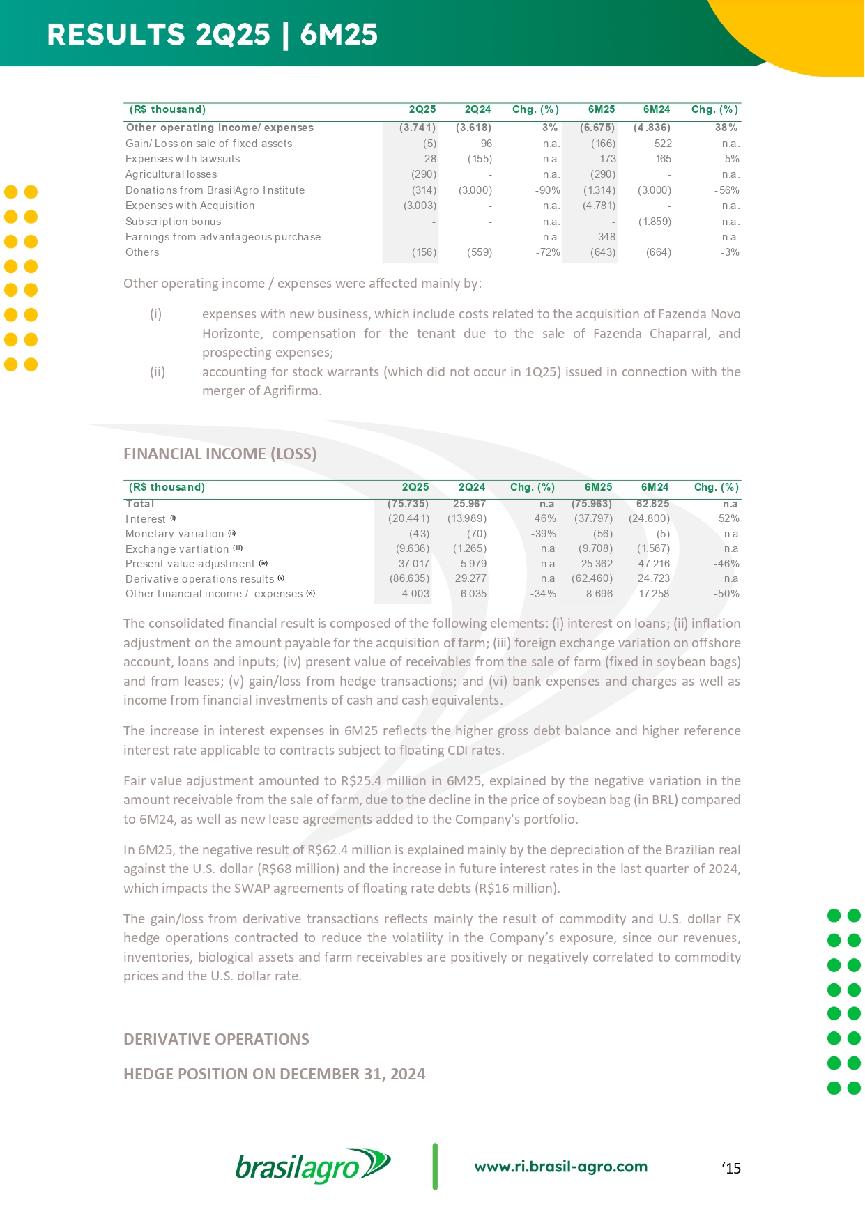 Other operating income / expenses were affected mainly by: ‘ 15 (i) (ii) expenses with new business, which include costs related to the acquisition of Fazenda Novo Horizonte, compensation for the tenant due to the sale of Fazenda Chaparral, and prospecting expenses ; accounting for stock warrants (which did not occur in 1 Q 25 ) issued in connection with the merger of Agrifirma . The consolidated financial result is composed of the following elements : (i) interest on loans ; (ii) inflation adjustment on the amount payable for the acquisition of farm ; (iii) foreign exchange variation on offshore account, loans and inputs ; (iv) present value of receivables from the sale of farm (fixed in soybean bags) and from leases ; (v) gain/loss from hedge transactions ; and (vi) bank expenses and charges as well as income from financial investments of cash and cash equivalents . The increase in interest expenses in 6 M 25 reflects the higher gross debt balance and higher reference interest rate applicable to contracts subject to floating CDI rates . Fair value adjustment amounted to R $ 25 . 4 million in 6 M 25 , explained by the negative variation in the amount receivable from the sale of farm, due to the decline in the price of soybean bag (in BRL) compared to 6 M 24 , as well as new lease agreements added to the Company's portfolio . In 6 M 25 , the negative result of R $ 62 . 4 million is explained mainly by the depreciation of the Brazilian real against the U . S . dollar (R $ 68 million) and the increase in future interest rates in the last quarter of 2024 , which impacts the SWAP agreements of floating rate debts (R $ 16 million) . The gain/loss from derivative transactions reflects mainly the result of commodity and U . S . dollar FX hedge operations contracted to reduce the volatility in the Company’s exposure, since our revenues, inventories, biological assets and farm receivables are positively or negatively correlated to commodity prices and the U . S . dollar rate . DERIVATIVE OPERATIONS HEDGE POSITION ON DECEMBER 31, 2024 Chg. (% ) 6M24 6M25 Chg. (% ) 2Q24 2Q25 (R$ thousa nd) 38% (4 .836) (6.675) 3% (3.618) (3.74 1) Other opera ting income/ expenses n.a. 522 (166) n.a. 96 (5) Gain/ Loss on sale of f ixed assets 5% 165 173 n.a. (155) 28 Expenses with lawsuits n.a. - (290) n.a. - (290) Agricultural losses - 56% (3.000) (1.314) - 90% (3.000) (314) Donations f rom BrasilAgro I nstitute n.a. - (4.781) n.a. - (3.003) Expenses with Acquisition n.a. n.a. (1.859) - - 348 n.a. n.a. - - Subscription bonus Earnings f rom advantageous purchase - 3% (664) (643) - 72% (559) (156) Others FINANCIAL INCOME (LOSS) Chg. (%) 6M24 6M25 Chg. (%) 2Q24 2Q25 (R$ thousand) n.a 62.825 (75.963) n.a 25.967 (75.735) Total 52% (24.800) (37.797) 46% (13.989) (20.441) I nterest (i) n.a (5) (56) - 39% (70) (43) Monetary variation (ii) n.a (1.567) (9.708) n.a (1.265) (9.636) Exchange vartiation (iii) - 46% 47.216 25.362 n.a 5.979 37.017 Present value adjustment (iv) n.a 24.723 (62.460) n.a 29.277 (86.635) Derivative operations results (v) - 50% 17.258 8.696 - 34% 6.035 4.003 Other f inancial income / expenses (vi)