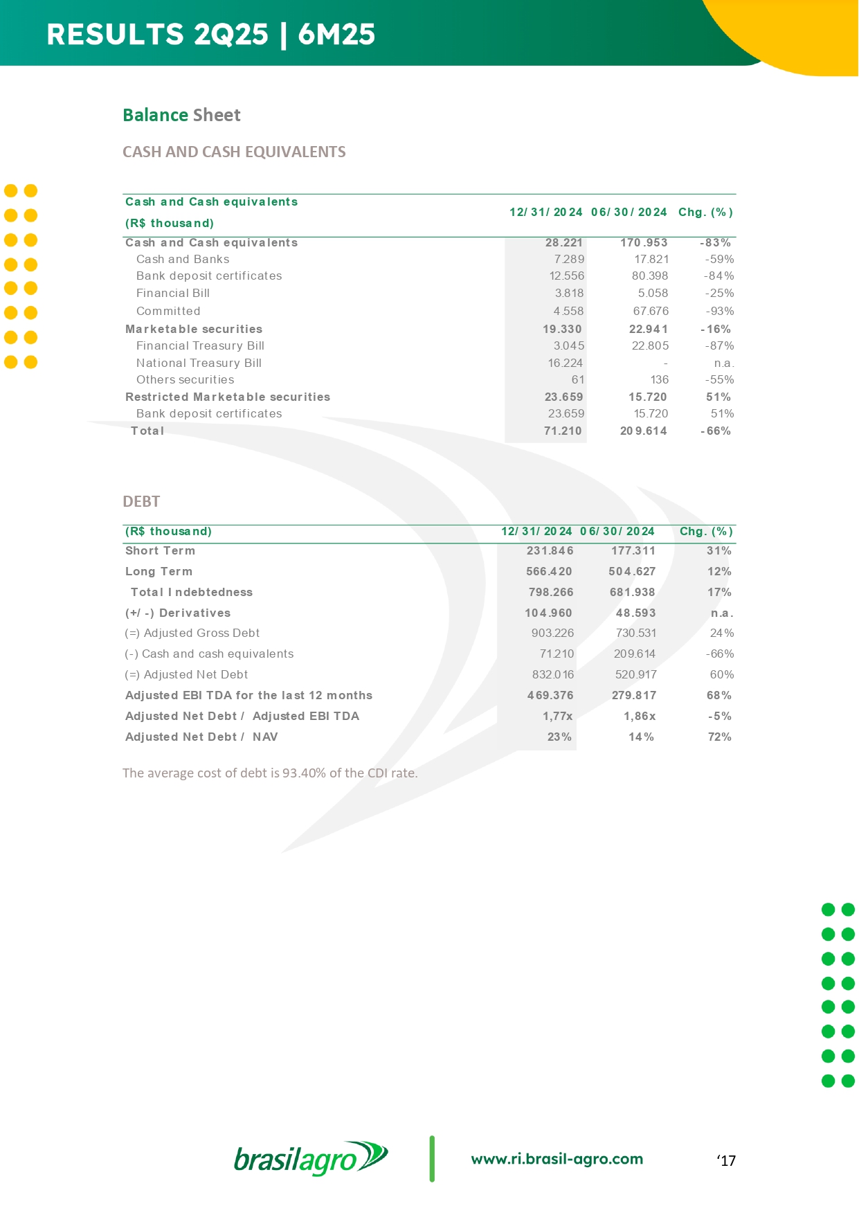 Balance Sheet CASH AND CASH EQUIVALENTS Ca sh a nd Ca sh equiva lents (R$ thousa nd) 12/ 31/ 20 24 0 6/ 30 / 20 24 Chg. (% ) - 83% 170 .953 28.221 Ca sh a nd Ca sh equiva lents - 59% 17.821 7.289 Cash and Banks - 84% 80.398 12.556 Bank deposit certif icates - 25% 5.058 3.818 Financial Bill - 93% 67.676 4.558 Committed - 16% 22.94 1 19.330 Ma rketa ble securities - 87% 22.805 3.045 Financial Treasury Bill n.a. - 16.224 National Treasury Bill - 55% 136 61 Others securities 51% 15.720 23.659 Restricted Ma rketa ble securities 51% 15.720 23.659 Bank deposit certif icates - 66% 20 9.614 71.210 Tota l DEBT Chg. (% ) 30 / 20 24 12/ 31/ 20 24 0 6/ (R$ thousa nd) 31% 177.311 231.84 6 Short Term 12% 50 4 .627 566.4 20 Long Term 17% 681.938 798.266 Tota l I ndebtedness n.a . 4 8.593 10 4 .960 (+/ - ) Deriva tives 24% 730.531 903.226 (=) Adjusted Gross Debt - 66% 209.614 71.210 ( - ) Cash and cash equivalents 60% 520.917 832.016 (=) Adjusted Net Debt 68% 279.817 4 69.376 Adjusted EBI TDA for the la st 12 months - 5% 1,86x 1,77x Adjusted Net Debt / Adjusted EBI TDA 72% 14 % 23% Adjusted Net Debt / NAV The average cost of debt is 93.40% of the CDI rate. ‘ 17