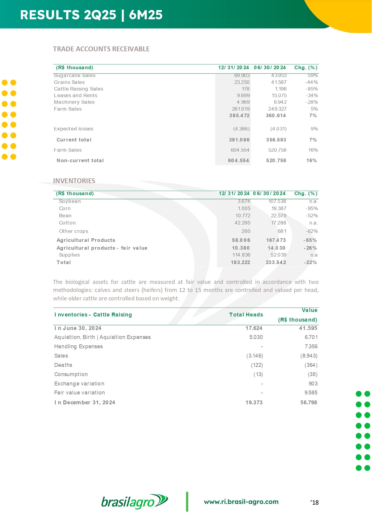 TRADE ACCOUNTS RECEIVABLE Chg. (% ) 0 6/ 30 / 20 24 12/ 31/ 20 24 (R$ thousa nd) 59% 43.953 69.903 Sugarcane Sales - 44% 41.587 23.250 Grains Sales - 85% 1.196 178 Cattle Raising Sales - 34% 15.075 9.899 Leases and Rents - 28% 6.942 4.969 Machinery Sales 5% 249.327 261.019 Farm Sales 7% 360 .614 385.4 72 9% (4.031) (4.386) Expected losses 7% 356.583 381.0 86 Current tota l 16% 520.758 604.554 Farm Sales 16% 520 .758 60 4 .554 Non - current tota l INVENTORIES Chg. (% ) 0 6/ 30 / 20 24 12/ 31/ 20 24 (R$ thousa nd) n.a. 107.538 3.674 Soybean - 95% 19.387 1.005 Corn - 52% 22.579 10.772 Bean n.a. 17.288 42.295 Cotton - 62% 681 260 Other crops - 65% 167.4 73 58.0 0 6 Agricultura l Products - 26% 14 .0 30 10 .380 Agricultura l products - fa ir va lue n.a 52.039 114.836 Supplies - 22% 233.54 2 183.222 Tota l The biological assets for cattle are measured at fair value and controlled in accordance with two methodologies : calves and steers (heifers) from 12 to 15 months are controlled and valued per head, while older cattle are controlled based on weight . Value I nventories - Cattle Raising Total Heads (R$ thousand) 4 1.595 17.624 I n June 30 , 20 24 6.701 5.030 Aquisition, Birt h | Aquisition Expenses 7.356 - Handling Expenses (8.943) (3.146) Sales (364) (122) Deaths (35) (13) Consumption 903 - Exchange variation 9.585 - Fair value variation 56.798 19.373 I n December 31, 20 24 ‘ 18