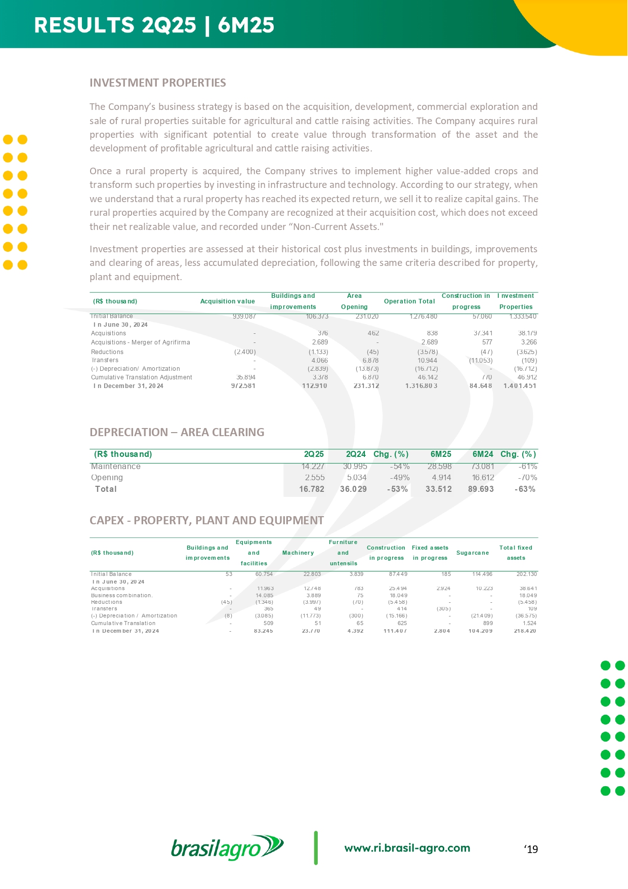 INVESTMENT PROPERTIES The Company’s business strategy is based on the acquisition, development, commercial exploration and sale of rural properties suitable for agricultural and cattle raising activities . The Company acquires rural properties with significant potential to create value through transformation of the asset and the development of profitable agricultural and cattle raising activities . Once a rural property is acquired, the Company strives to implement higher value - added crops and transform such properties by investing in infrastructure and technology . According to our strategy, when we understand that a rural property has reached its expected return, we sell it to realize capital gains . The rural properties acquired by the Company are recognized at their acquisition cost, which does not exceed their net realizable value, and recorded under “Non - Current Assets . " Investment properties are assessed at their historical cost plus investments in buildings, improvements and clearing of areas, less accumulated depreciation, following the same criteria described for property, plant and equipment . DEPRECIATION – AREA CLEARING CAPEX - PROPERTY, PLANT AND EQUIPMENT (R$ thousa nd) Acquisition va lue Opera tion Tota l Buildings a nd Area Construction in I nvestment Properties progress Opening improvements 1.333.540 57.060 1.276.480 231.020 106.373 939.087 I nitial Balance I n J une 30 , 20 24 38.179 37.341 838 462 376 - Acquisitions 3.266 577 2.689 - 2.689 - Acquisitions - Merger of Agrif irma (3.625) (47) (3.578) (45) (1.133) (2.400) Reductions (109) (11.053) 10.944 6.878 4.066 - Transf ers (16.712) - (16.712) (13.873) (2.839) - ( - ) Depreciation/ Amortization 46.912 770 46.142 6.870 3.378 35.894 Cumulative Translation Adjustment 1.4 0 1.4 51 84 .64 8 1.316.80 3 231.312 112.910 972.581 I n December 31, 20 24 Chg. (% ) 6M24 6M25 Chg. (% ) 2Q24 2Q25 (R$ thousa nd) - 61% 73.081 28.598 - 54% 30.995 14.227 Maintenance - 70% 16.612 4.914 - 49% 5.034 2.555 Opening - 63% 89.693 33.512 - 53% 36.0 29 16.782 Tota l (R$ thousand) Buildings and improvements Equipments and facilities Machinery Furniture and untensils Construction Fixed assets in progress in progress Sugarcane Total fixed assets 202.130 114.496 185 87.449 3.839 22.803 60.754 53 I nit ial Balance 38.641 10.223 2.924 25.494 783 12.748 11.963 - I n June 30 , 20 24 Acquisitions 18.049 - - 18.049 75 3.889 14.085 - Business combination. (5.458) - - (5.458) (70) (3.997) (1.346) (45) Reductions 109 - (305) 414 - 49 365 - Transfers (36.575) (21.409) - (15.166) (300) (11.773) (3.085) (8) ( - ) Depreciation / Amortization 1.524 899 - 625 65 51 509 - Cumulative Translation 218.4 20 10 4 .20 9 2.80 4 111.4 0 7 4 .392 23.770 83.24 5 - I n December 31, 20 24 ‘ 19