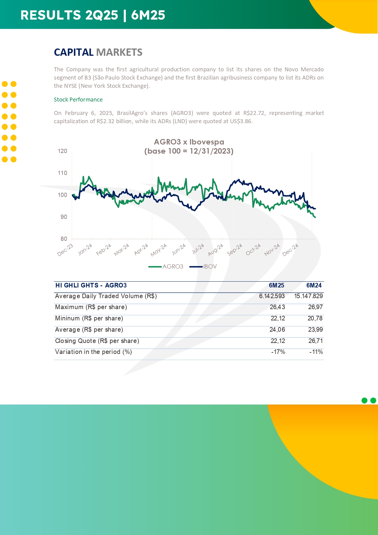 ‘20 CAPITAL MARKETS The Company was the first agricultural production company to list its shares on the Novo Mercado segment of B 3 (São Paulo Stock Exchange) and the first Brazilian agribusiness company to list its ADRs on the NYSE (New York Stock Exchange) . Stock Performance On February 6 , 2025 , BrasilAgro’s shares (AGRO 3 ) were quoted at R $ 22 . 72 , representing market capitalization of R $ 2 . 32 billion, while its ADRs (LND) were quoted at US $ 3 . 86 . 110 100 90 80 120 AGRO3 x Ibovespa (base 100 = 12/31/2023) IBOV AGRO3 6M24 6M25 HI GHLI GHTS - AGRO3 15.147.829 6.142.593 Average Daily Traded Volume (R$) 26,97 26,43 Maximum (R$ per share) 20,78 22,12 Mininum (R$ per share) 23,99 24,06 Average (R$ per share) 26,71 22,12 Closing Quote (R$ per share) - 11% - 17% Variation in the period (%)