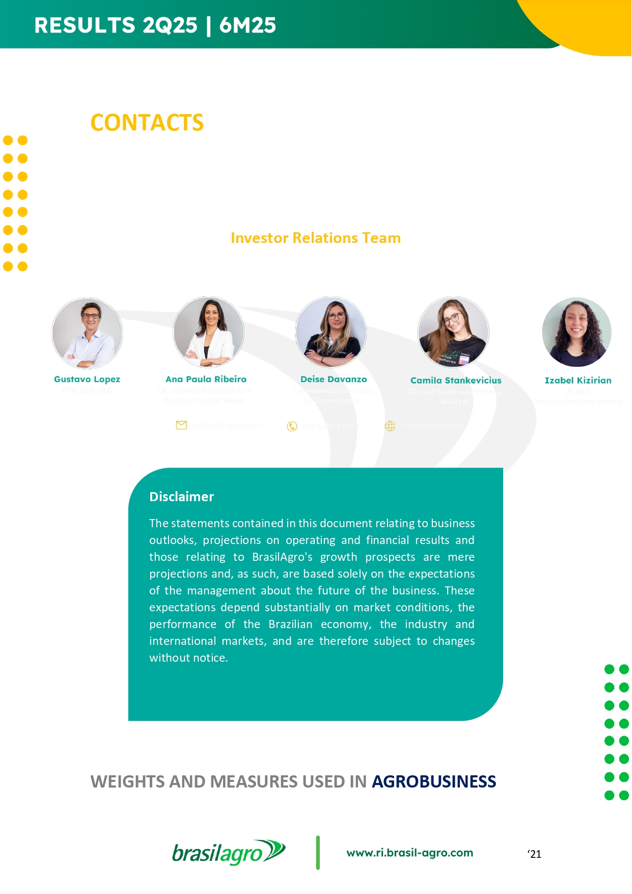 CONTACTS Investor Relations Team WEIGHTS AND MEASURES USED IN AGROBUSINESS Disclaimer The statements contained in this document relating to business outlooks, projections on operating and financial results and those relating to BrasilAgro's growth prospects are mere projections and, as such, are based solely on the expectations of the management about the future of the business . These expectations depend substantially on market conditions, the performance of the Brazilian economy, the industry and international markets, and are therefore subject to changes without notice . ‘ 21