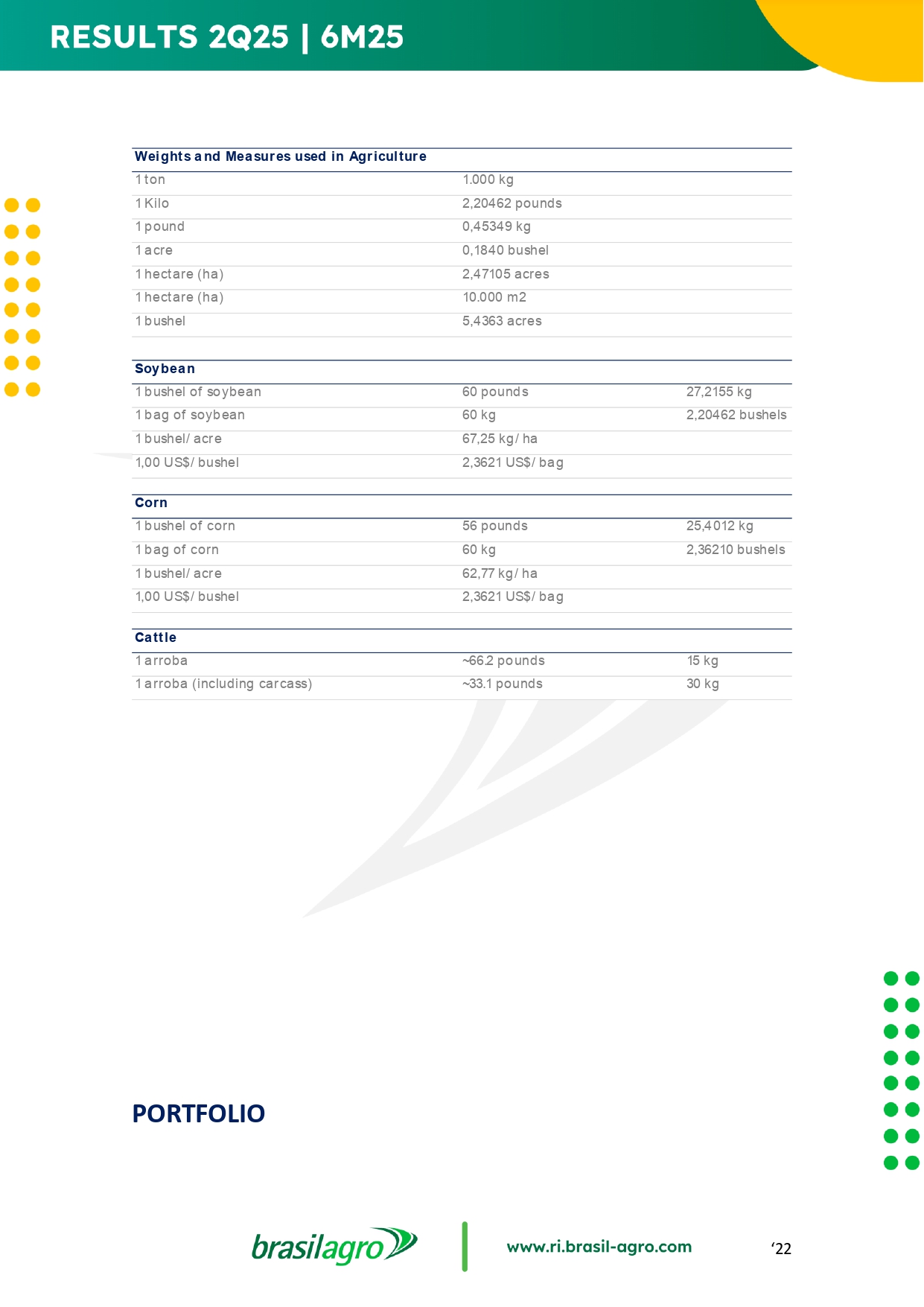 PORTFOLIO ‘ 22 Weights a nd Mea sures used in Agriculture 1.000 kg 1 ton 2,20462 pounds 1 Kilo 0,45349 kg 1 pound 0,1840 bushel 1 acre 2,47105 acres 1 hectare (ha) 10.000 m2 1 hectare (ha) 5,4363 acres 1 bushel Soybea n 27,2155 kg 60 pounds 1 bushel of soybean 2,20462 bushels 60 kg 1 bag of soybean 67,25 kg/ ha 1 bushel/ acre 2,3621 US$/ bag 1,00 US$/ bushel Corn 25,4012 kg 56 pounds 1 bushel of corn 2,36210 bushels 60 kg 1 bag of corn 62,77 kg/ ha 1 bushel/ acre 2,3621 US$/ bag 1,00 US$/ bushel Ca ttle 15 kg ~66.2 pounds 1 arroba 30 kg ~33.1 pounds 1 arroba (including carcass)