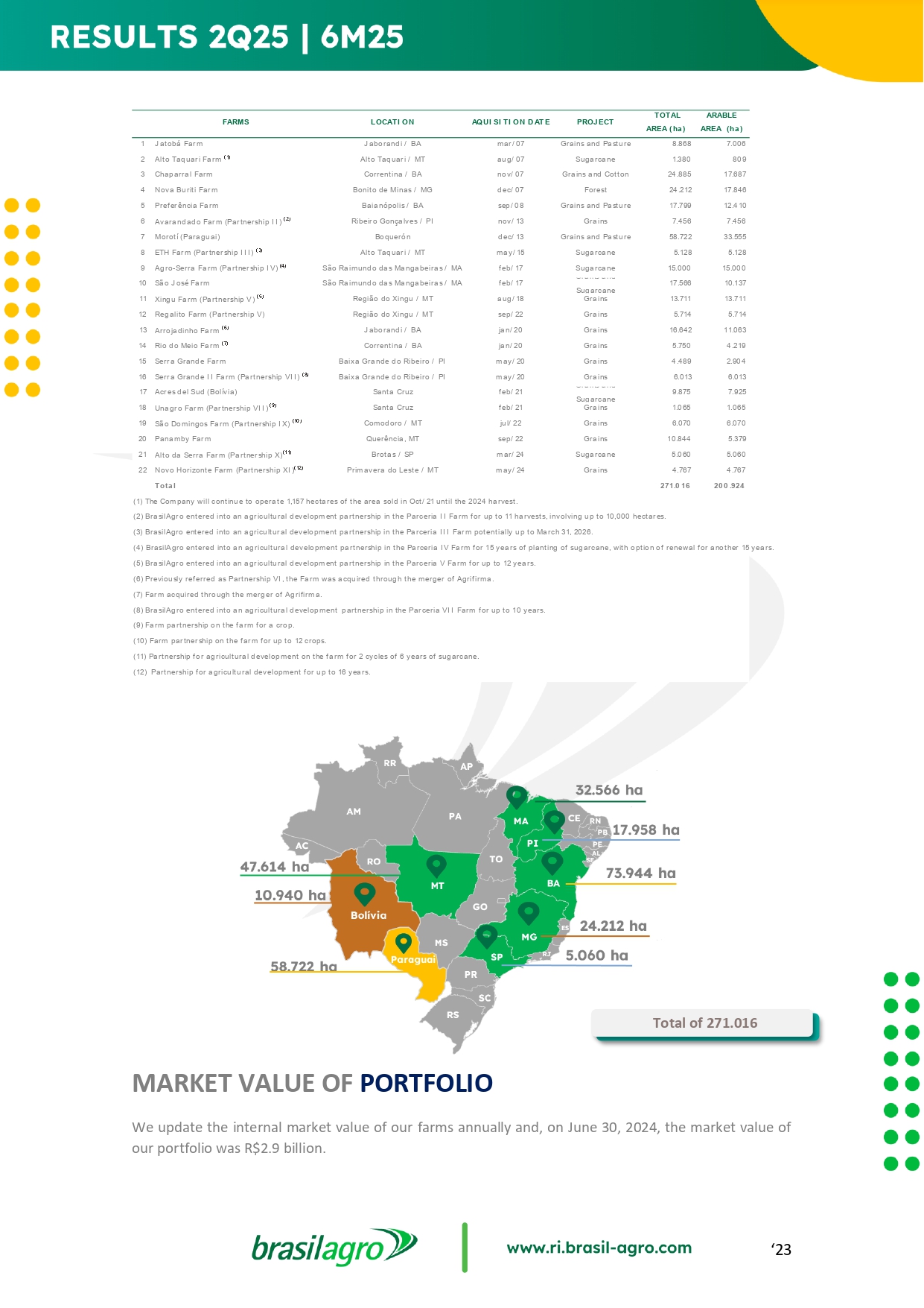 TOTAL ARABLE FARMS LOCATI ON AQUI SI TI ON DATE PROJECT AREA (ha) AREA (ha) 7.006 8.868 Grains and Pasture mar/ 07 J aborandi / BA 1 J atobá Farm 809 1.380 Sugarcane aug/ 07 Alto Taquari / MT 2 Alto Taquari Farm (1) 17.687 24.885 Grains and Cotton nov/ 07 Correntina / BA 3 Chaparral Farm 17.846 24.212 Forest dec/ 07 Bonito de Minas / MG 4 Nova Buriti Farm 12.410 17.799 Grains and Pasture sep/ 08 Baianópolis / BA 5 Preferência Farm 7.456 7.456 Grains nov/ 13 Ribeiro Gonçalves / PI 6 Avarandado Farm (Partnership I I ) (2) 33.555 58.722 Grains and Pasture dec/ 13 Boquerón 7 Morotí (Paraguai) 5.128 5.128 Sugarcane may/ 15 Alto Taquari / MT 8 ETH Farm (Partnership I I I ) (3) 15.000 15.000 Sugarcane feb/ 17 São Raimundo das Mangabeiras / MA 9 Agro - Serra Farm (Partnership I V) (4) 10 São J osé Farm São Raimundo das Mangabeiras / MA feb/ 17 17.566 10.137 13.711 13.711 Sugarcane Grains aug/ 18 Região do Xingu / MT 11 Xingu Farm (Partnership V) (5) 5.714 5.714 Grains sep/ 22 Região do Xingu / MT 12 Regalito Farm (Partnership V) 11.063 16.642 Grains jan/ 20 J aborandi / BA 13 Arrojadinho Farm (6) 4.219 5.750 Grains jan/ 20 Correntina / BA 14 Rio do Meio Farm (7) 2.904 4.489 Grains may/ 20 Baixa Grande do Ribeiro / PI 15 Serra Grande Farm 6.013 6.013 Grains may/ 20 Baixa Grande do Ribeiro / PI 16 Serra Grande I I Farm (Partnership VI I ) (8) 7.925 9.875 feb/ 21 Santa Cruz Acres del Sud (Bolívia) 17 1.065 1.065 Sugarcane Grains feb/ 21 Santa Cruz 18 Unagro Farm (Partnership VI I ) (9) 6.070 6.070 Grains jul/ 22 Comodoro / MT 19 São Domingos Farm (Partnership I X) (10) 5.379 10.844 Grains sep/ 22 Querência, MT 20 Panamby Farm 5.060 5.060 Sugarcane mar/ 24 Brotas / SP 21 Alto da Serra Farm (Partnership X) (11) 4.767 4.767 Grains may/ 24 Primavera do Leste / MT 22 Novo Horizonte Farm (Partnership XI ) (12) 20 0 .924 271.0 16 Total (1) The Company will continue to operate 1,157 hectares of the area sold in Oct/ 21 until the 2024 harvest. (2) BrasilAgro entered into an agricultural development partnership in the Parceria I I Farm for up to 11 harvests, involving up to 10,000 hectares. (3) BrasilAgro entered into an agricultural development partnership in the Parceria I I I Farm potentially up to March 31, 2026. (4) BrasilAgro entered into an agricultural development partnership in the Parceria I V Farm for 15 years of planting of sugarcane, with option of renewal for another 15 years. (5) BrasilAgro entered into an agricultural development partnership in the Parceria V Farm for up to 12 years. (6) Previously referred as Partnership VI , the Farm was acquired through the merger of Agrifirma. (7) Farm acquired through the merger of Agrifirma. (8) BrasilAgro entered into an agricultural development partnership in the Parceria VI I Farm for up to 10 years. (9) Farm partnership on the farm for a crop. (10) Farm partnership on the farm for up to 12 crops. (11) Partnership for agricultural development on the farm for 2 cycles of 6 years of sugarcane. (12) Partnership for agricultural development for up to 16 years. Total of 271.016 MARKET VALUE OF PORTFOLIO We update the internal market value of our farms annually and, on June 30, 2024, the market value of our portfolio was R$2.9 billion. ‘ 23