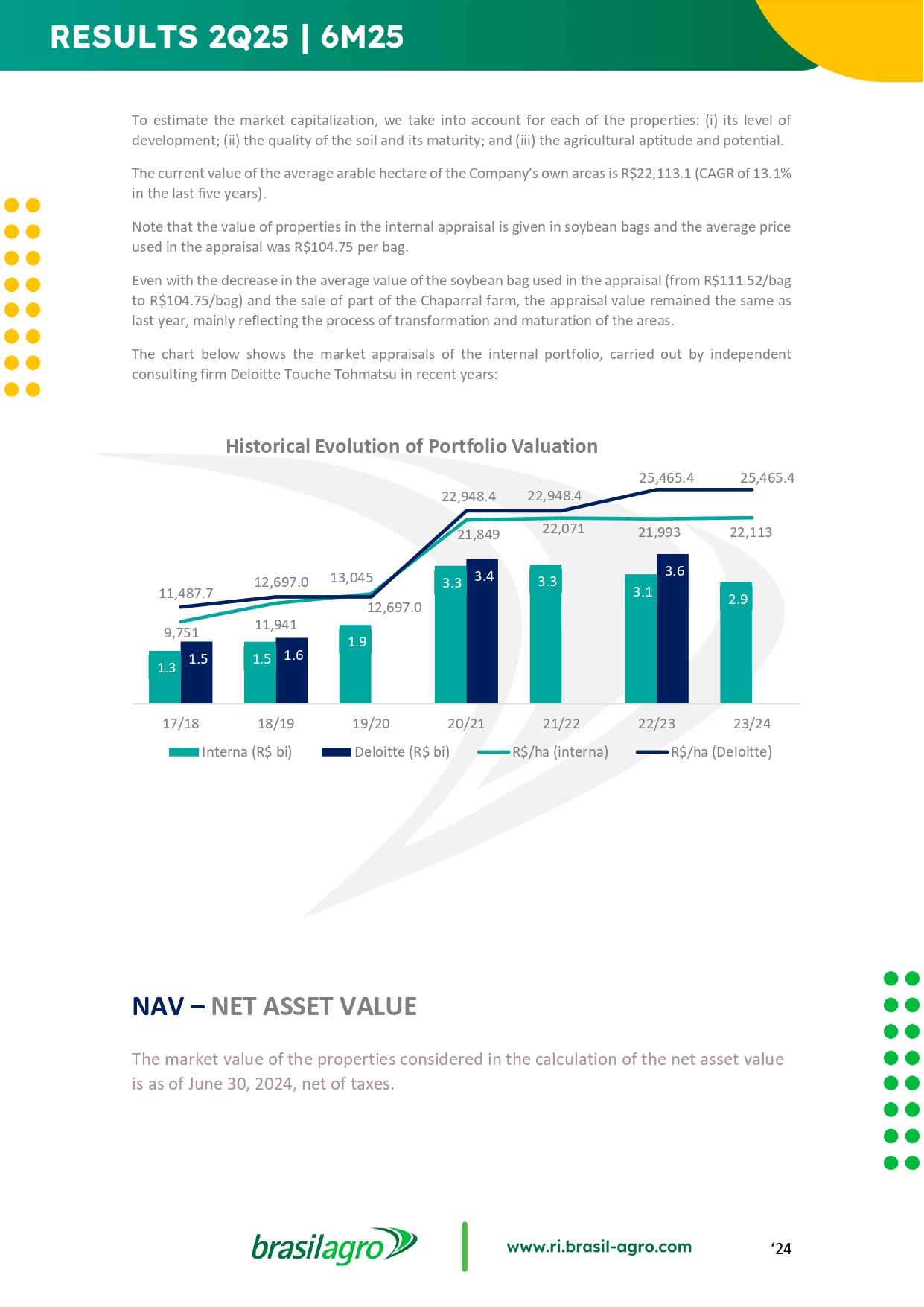 To estimate the market capitalization, we take into account for each of the properties : (i) its level of development ; (ii) the quality of the soil and its maturity ; and (iii) the agricultural aptitude and potential . The current value of the average arable hectare of the Company’s own areas is R $ 22 , 113 . 1 (CAGR of 13 . 1 % in the last five years) . Note that the value of properties in the internal appraisal is given in soybean bags and the average price used in the appraisal was R $ 104 . 75 per bag . Even with the decrease in the average value of the soybean bag used in the appraisal (from R $ 111 . 52 /bag to R $ 104 . 75 /bag) and the sale of part of the Chaparral farm, the appraisal value remained the same as last year, mainly reflecting the process of transformation and maturation of the areas . The chart below shows the market appraisals of the internal portfolio, carried out by independent consulting firm Deloitte Touche Tohmatsu in recent years : NAV – NET ASSET VALUE The market value of the properties considered in the calculation of the net asset value is as of June 30, 2024, net of taxes. 1.3 1.5 1.9 3.3 3.3 3.1 2.9 1.5 1.6 3.4 3.6 9,751 11,941 13,045 21,849 22,071 21,993 22,113 11,487.7 12,697.0 12,697.0 25,465.4 25,465.4 17/18 19/20 20/21 Historical Evolution of Portfolio Valuation 22,948.4 22,948.4 18/19 Interna (R$ bi) Deloitte (R$ bi) 21/22 R$/ha (interna) 22/23 23/24 R$/ha (Deloitte) ‘ 24