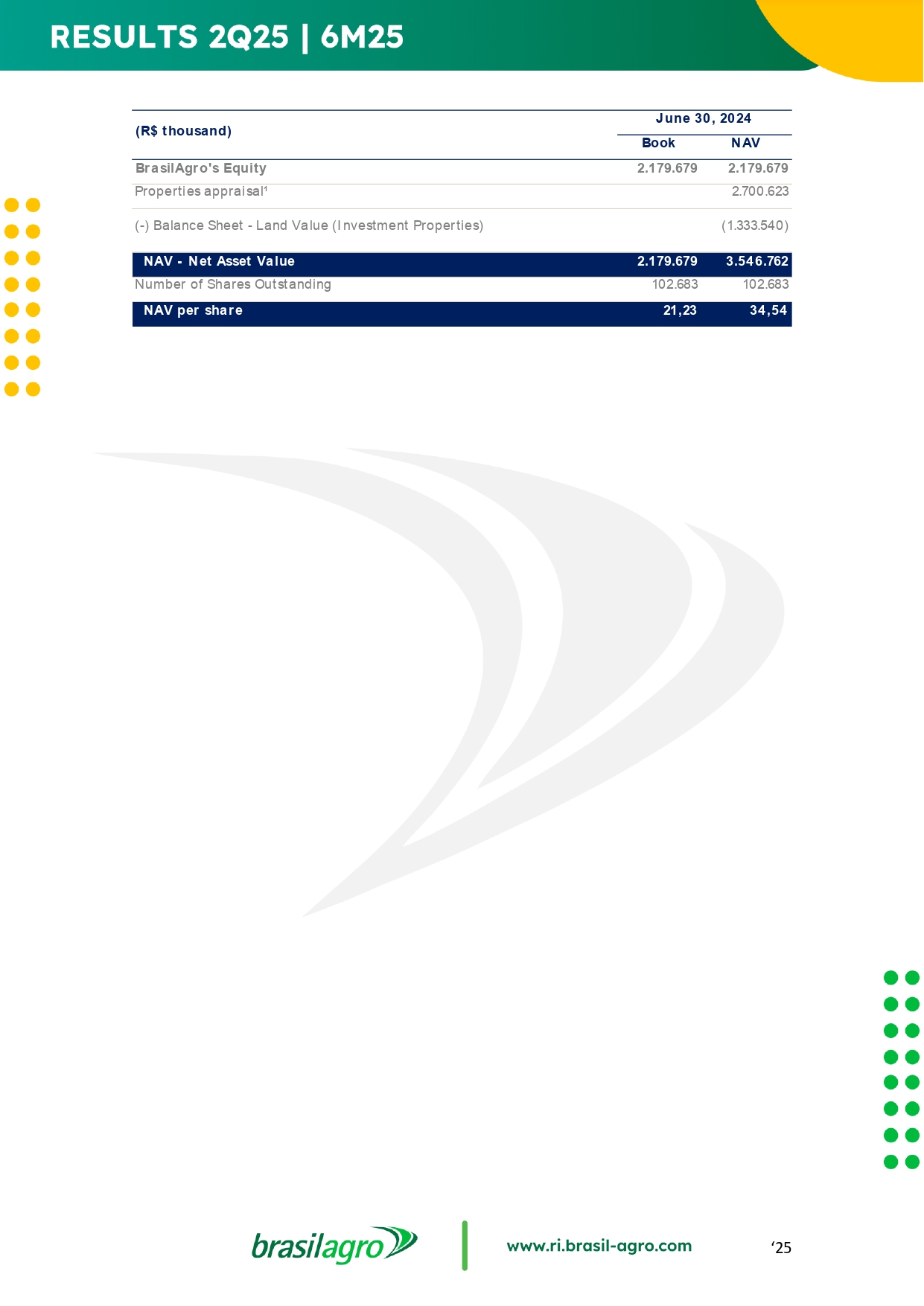 June 30 , 20 24 (R$ thousand) NAV Book 2.179.679 2.179.679 BrasilAgro's Equity 2.700.623 Properties appraisal¹ (1.333.540) ( - ) Balance Sheet - Land Value (I nvestment Properties) 3.54 6.762 2.179.679 NAV - Net Asset Value 102.683 102.683 Number of Shares Outstanding 34 ,54 21,23 NAV per share ‘ 25