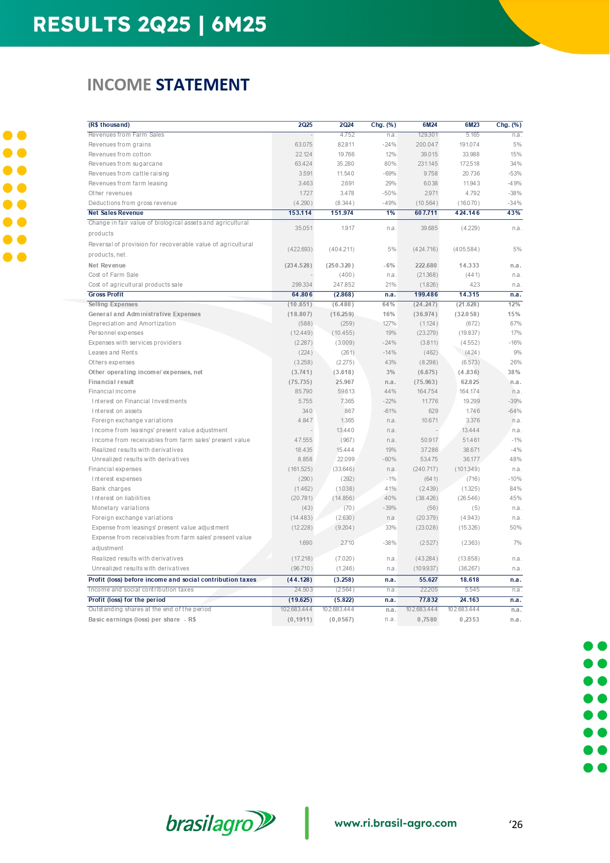 INCOME STATEMENT (R$ thousand) 2Q25 2Q24 Chg. (%) 6M24 6M23 Chg. (%) 5.165 n.a. 129.301 n.a. 4.752 - Revenues from Farm Sales 191.074 5% 200.047 - 24% 82.811 63.075 Revenues from grains 33.988 15% 39.015 12% 19.766 22.124 Revenues from cotton 172.518 34% 231.145 80% 35.280 63.424 Revenues from sugarcane 20.736 - 53% 9.758 - 69% 11.540 3.591 Revenues from cattle raising 11.943 - 49% 6.038 29% 2.691 3.463 Revenues from farm leasing 4.792 - 38% 2.971 - 50% 3.478 1.727 Other revenues (16.070) - 34% (10.564) - 49% (8.344) (4.290) Deductions from gross revenue 4 3% 4 24 .14 6 60 7.711 1% 151.974 153.114 Net Sales Revenue (4.229) n.a. 39.685 1.917 n.a. 35.051 Change in fair value of biological assets and agricultural products (405.584) 5% (424.716) (404.211) 5% (422.693) Reversal of provision for recoverable value of agricultural products, net. 14 .333 n.a. 222.680 (250 .320 ) - 6% (234 .528) Net Revenue (441) n.a. (21.368) (400) n.a. - Cost of Farm Sale 423 n.a. (1.826) 247.852 21% 299.334 Cost of agricultural products sale n.a. 14 .315 199.4 86 n.a. (2.868) 64 .80 6 Gross Profit (21.628) 12% (24 .24 7) (6.4 80 ) 64 % (10 .651) Selling Expenses (32.0 58) 15% (36.974 ) (16.259) 16% (18.80 7) General and Administrative Expenses (672) 67% (1.124) (259) 127% (588) Depreciation and Amortizat ion (19.837) 17% (23.279) (10.455) 19% (12.449) Personnel expenses (4.552) - 16% (3.811) (3.009) - 24% (2.287) Expenses with services providers (424) 9% (462) (261) - 14% (224) Leases and Rents (6.573) 26% (8.298) (2.275) 43% (3.258) Others expenses (4 .836) 38% (6.675) (3.618) 3% (3.74 1) Other operating income/ expenses, net 62.825 n.a. (75.963) 25.967 n.a. (75.735) Financial result 164.174 n.a. 164.754 59.613 44% 85.790 Financial income 19.299 - 39% 11.776 7.365 - 22% 5.755 I nterest on Financial I nvestments 1.746 - 64% 629 867 - 61% 340 I nterest on assets 3.376 n.a. 10.671 1.365 n.a. 4.847 Foreign exchange variations 13.444 n.a. - 13.440 n.a. - I ncome from leasings' present value adjustment 51.461 - 1% 50.917 (967) n.a. 47.555 I ncome from receivables from farm sales' present value 38.671 - 4% 37.286 15.444 19% 18.435 Realized results with derivatives 36.177 48% 53.475 22.099 - 60% 8.858 Unrealized results with derivatives (101.349) n.a. (240.717) (33.646) n.a. (161.525) Financial expenses (716) - 10% (641) (292) - 1% (290) I nterest expenses (1.325) 84% (2.439) (1.038) 41% (1.462) Bank charges (26.546) 45% (38.426) (14.856) 40% (20.781) I nterest on liabilities (5) n.a. (56) (70) - 39% (43) Monetary variations (4.943) n.a. (20.379) (2.630) n.a. (14.483) Foreign exchange variations (15.326) 50% (23.028) (9.204) 33% (12.228) Expense from leasings' present value adjustment (2.363) 7% (2.527) 2.710 - 38% 1.690 Expense from receivables from farm sales' present value adjustment (13.858) n.a. (43.284) (7.020) n.a. (17.218) Realized results with derivatives (36.267) n.a. (109.937) (1.246) n.a. (96.710) Unrealized results with derivatives n.a. 18.618 55.627 n.a. (3.258) (4 4 .128) Profit (loss) before income and social contribution taxes 5.545 n.a. 22.205 n.a. (2.564) 24.503 I ncome and social contribution taxes n.a. 24 .163 77.832 n.a. (5.822) (19.625) Profit (loss) for the period n.a. 102.683.444 102.683.444 n.a. 102.683.444 102.683.444 Outstanding shares at the end of the period n.a. 0 ,2353 0 ,7580 n.a. (0 ,0 567) (0 ,1911) Basic earnings (loss) per share - R$ ‘ 26