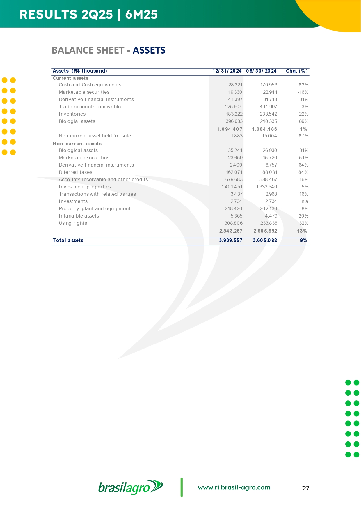 BALANCE SHEET - ASSETS Assets (R$ thousand) 12/ 31/ 20 24 0 6/ 30 / 20 24 Chg. (% ) Current assets 170.953 - 83% 28.221 Cash and Cash equivalents 22.941 - 16% 19.330 Marketable securities 31.718 31% 41.397 Derivative f inancial instruments 414.997 3% 425.604 Trade accounts receivable 233.542 - 22% 183.222 I nventories 210.335 89% 396.633 Biolog ial assets 1.0 84 .4 86 1% 1.0 94 .4 0 7 15.004 - 87% 1.883 Non - current asset held for sale Non - current assets 26.930 31% 35.241 Biolog ical assets 15.720 51% 23.659 Marketable securities 6.757 - 64% 2.400 Derivative f inancial instruments 88.031 84% 162.071 Diferred taxes 588.467 16% 679.683 Accounts receivable and other credits 1.333.540 5% 1.401.451 I nvestment properties 2.968 16% 3.437 Transactions with related parties 2.734 n.a 2.734 I nvestments 202.130 8% 218.420 Property, plant and equipment 4.479 20% 5.365 I ntangible assets 233.836 32% 308.806 Using rights 2.50 5.592 13% 2.84 3.267 3.60 5.0 82 9% 3.939.557 Total assets ‘ 27