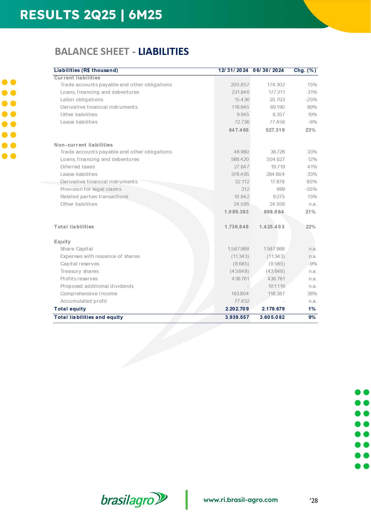 BALANCE SHEET - LIABILITIES Liabilities (R$ thousand) 12/ 31/ 20 24 0 6/ 30 / 20 24 Chg. (% ) Current liabilities 174.302 15% 200.857 Trade accounts payable and other obligations 177.311 31% 231.846 Loans, f inancing and debentures 20.703 - 25% 15.436 Labor obligations 69.190 69% 116.645 Derivative f inancial instruments 8.357 19% 9.945 Other liabilities 77.456 - 6% 72.736 Lease liabilities 527.319 23% 64 7.4 65 Non - current liabilities 36.726 33% 48.960 Trade accounts payable and other obligations 504.627 12% 566.420 Loans, f inancing and debentures 19.719 41% 27.847 Diferred taxes 284.604 33% 378.495 Lease liabilities 17.878 80% 32.112 Derivative f inancial instruments 699 - 55% 312 Provision for legal claims 9.275 15% 10.642 Related parties t ransactions 24.556 n.a. 24.595 Other liabilities 898.0 84 21% 1.0 89.383 1.4 25.4 0 3 22% 1.736.84 8 Total liabilities Equity 1.587.988 n.a. 1.587.988 Share Capital (11.343) n.a. (11.343) Expenses with issuance of shares (9.585) - 9% (8.685) Capital reserves (43.648) n.a. (43.648) Treasury shares 436.761 n.a. 436.761 Profits reserves 101.119 n.a. - Proposed additional dividends 118.387 38% 163.804 Comprehensive I ncome - n.a. 77.832 Accumulated profit 2.179.679 1% 2.20 2.70 9 Total equity 3.60 5.0 82 9% 3.939.557 Total liabilities and equity ‘ 28