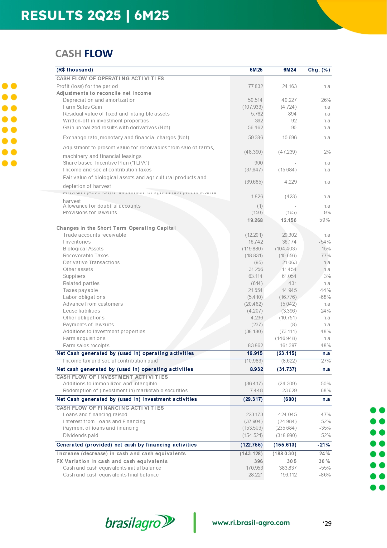 CASH FLOW (R$ thousand) 6M25 6M24 Chg. (% ) CASH FLOW OF OPERATI NG ACTI VI TI ES 24.163 n.a 77.832 Prof it (loss) f or the period Adjustments to reconcile net income 40.227 26% 50.514 Depreciation and amortization (4.724) n.a (107.933) Farm Sales Gain 894 n.a 5.762 Residual value of f ixed and intangible assets 92 n.a 392 Written - of f in investment properties 90 n.a 56.462 Gain unrealized results with derivatives (Net) 10.696 n.a 59.386 Exchange rate, monetary and f inancial charges (Net) (47.239) 2% (48.390) Adjustment to present value f or receivables f rom sale of f arms, machinery and f inancial leasings - n.a 900 Share based I ncentive Plan ("I LPA") (15.684) n.a (37.647) I ncome and social contribution taxes 4.229 n.a (39.685) Fair value of biological assets and agricultural products and depletion of harvest (423) n.a 1.826 harvest - n.a (1) Allowance f or doubtf ul accounts (165) - 9% (150) Provisions f or law suits 12.156 59% 19.268 Changes in the Short Term Operating Capital 29.302 n.a (12.201) Trade accounts receivable 36.174 - 54% 16.742 I nventories (104.403) 15% (119.880) Biological Assets (10.656) 77% (18.831) Recoverable Taxes 21.063 n.a (95) Derivative Transactions 11.454 n.a 31.256 Other assets 61.054 3% 63.114 Suppliers 431 n.a (614) Related parties 14.945 44% 21.554 Taxes payable (16.776) - 68% (5.410) Labor obligations (5.042) n.a (20.462) Advance f rom customers (3.396) 24% (4.207) Lease liabilities (10.751) n.a 4.236 Other obligations (8) n.a (237) Payments of law suits (73.111) - 48% (38.180) Additions to investment properties (146.948) n.a - Farm acquisitions 161.397 - 48% 83.862 Farm sales receipts n.a (23.115) 19.915 Net Cash generated by (used in) operating activities 27% (8.622) (10.983) I ncome tax and social contribution paid n.a (31.737) 8.932 Net cash generated by (used in) operating activities CASH FLOW OF I NVESTMENT ACTI VI TI ES 50% (24.309) (36.417) Additions to immobilized and intangible - 68% 23.629 7.448 Redemption of (investment in) marketable securities n.a (680 ) (29.317) Net Cash generated by (used in) investment activities CASH FLOW OF FI NANCI NG ACTI VI TI ES - 47% 424.045 223.173 Loans and f inancing raised 52% (24.984) (37.904) I nterest f rom Loans and Financing - 35% (235.684) (153.503) Payment of loans and f inancing - 52% (318.990) (154.521) Dividends paid - 21% (155.613) (122.755) Generated (provided) net cash by financing activities - 24 % (188.0 30 ) (143.128) I ncrease (decrease) in cash and cash equivalents 30 % 30 5 396 FX Variation in cash and cash equivalents - 55% 383.837 170.953 Cash and cash equivalents initial balance - 86% 196.112 28.221 Cash and cash equivalents f inal balance ‘ 29